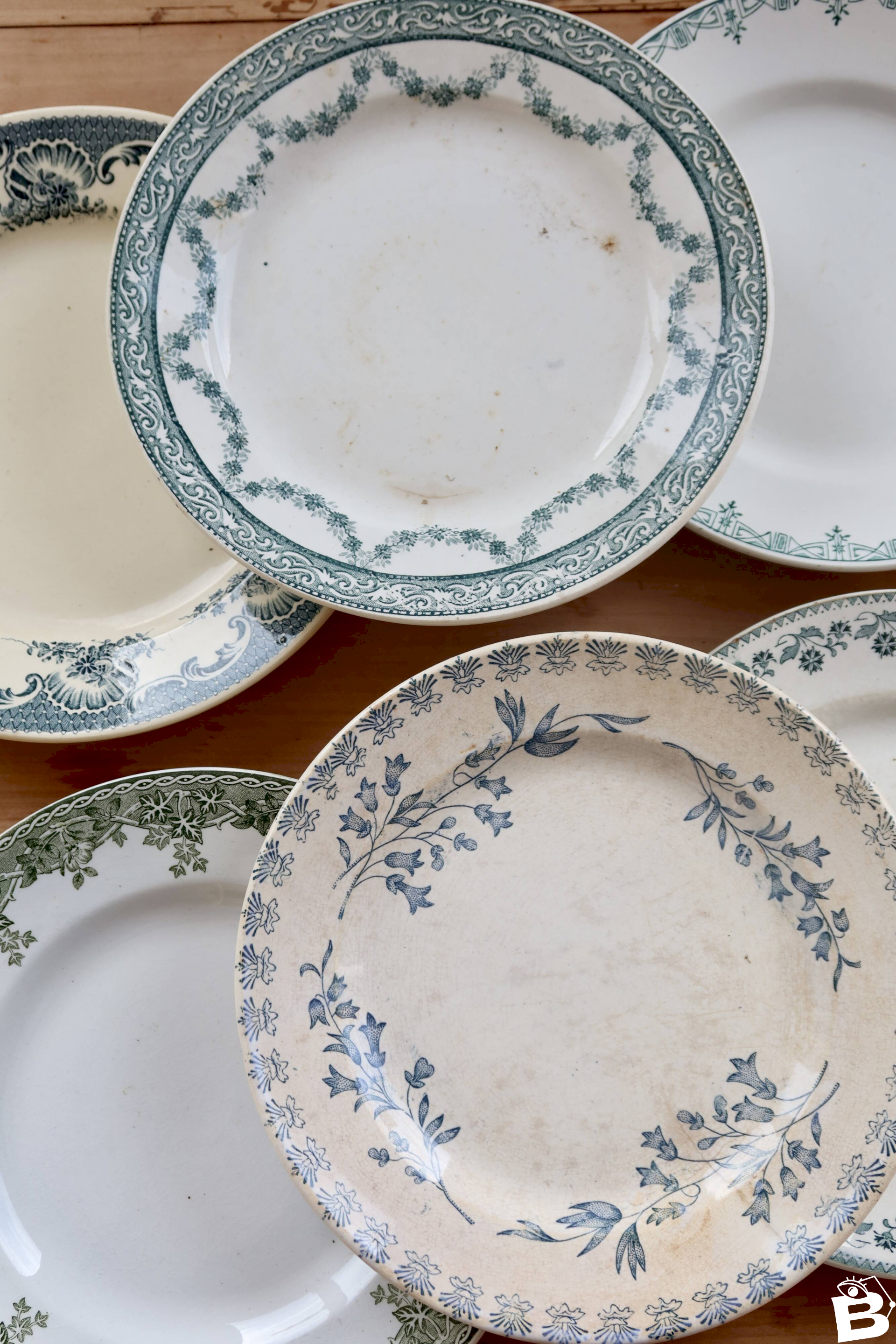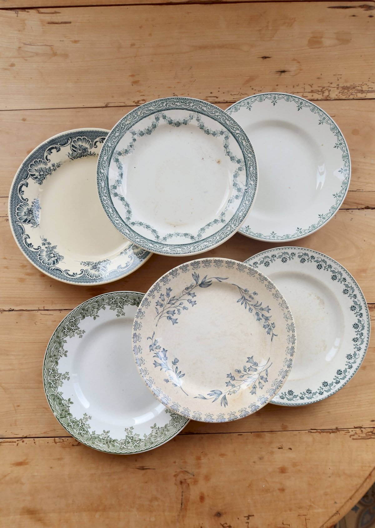Each piece features a different decoration, combining floral friezes and plant motifs, for a table full of charm and authenticity. Visible wear, traces of time, and marks consistent with their age. Dimensions: Ø approx. 22 to 23.5 cm. L: 22 W: 22 H: 1