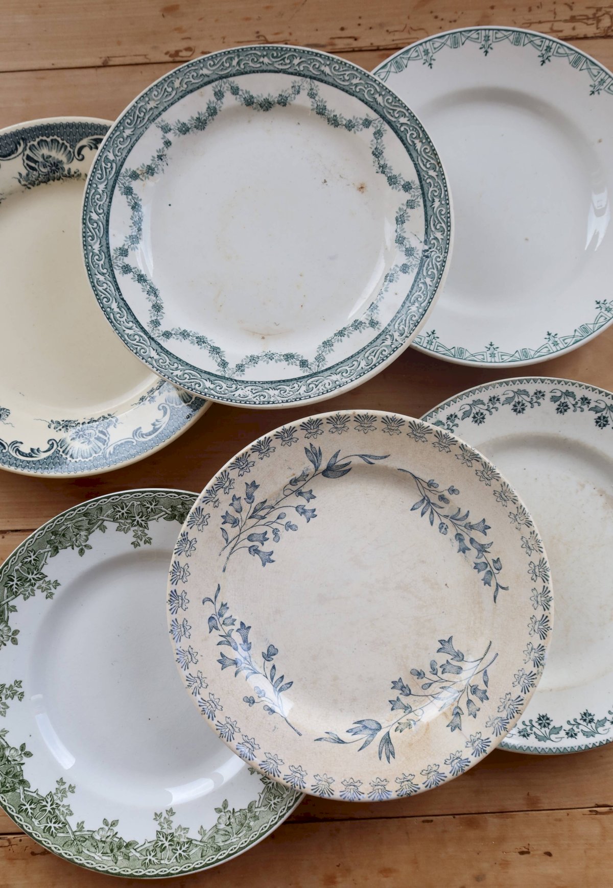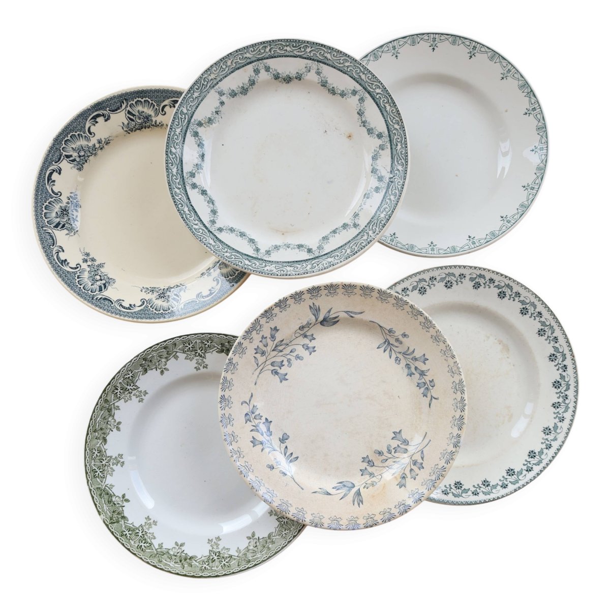 6 flat ironstone plates, mismatched in lovely shades of blue and green.