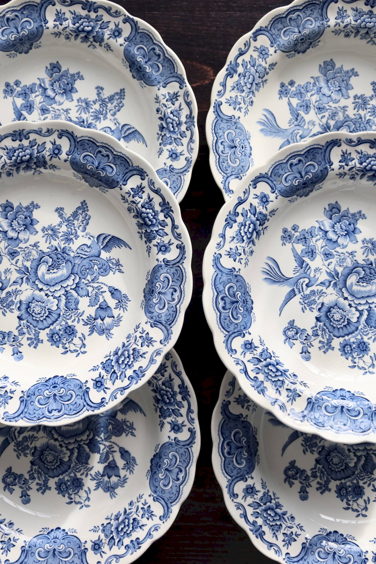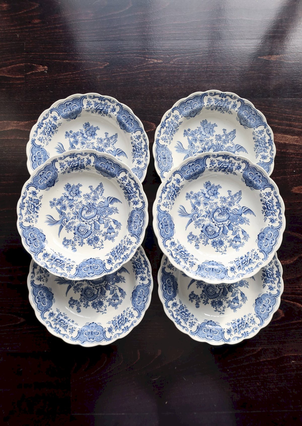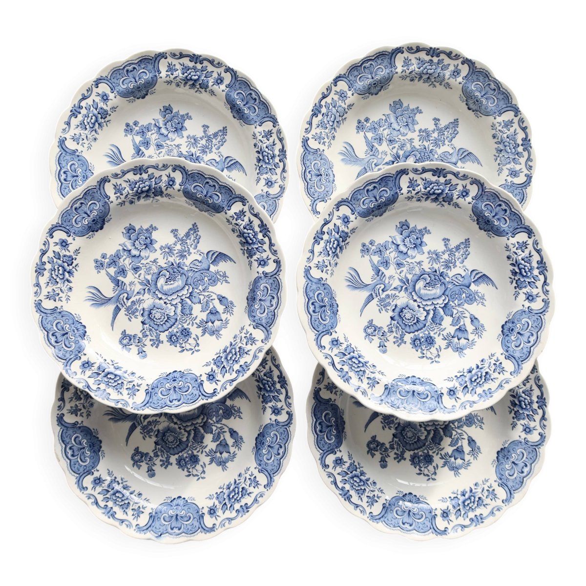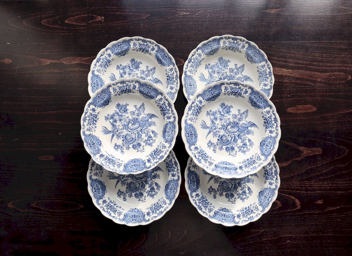 Set of six English porcelain soup plates by Ridgway, "Windsor" blue and white pattern: central bouquet, floral garland, and molded scalloped rim. Very fresh condition for the age, with some micro traces of use and rare firing spots. Two identical sets available to make up to 12 pieces. Dimensions: 24cm in diameter. L: 24 W: 24 H: 2