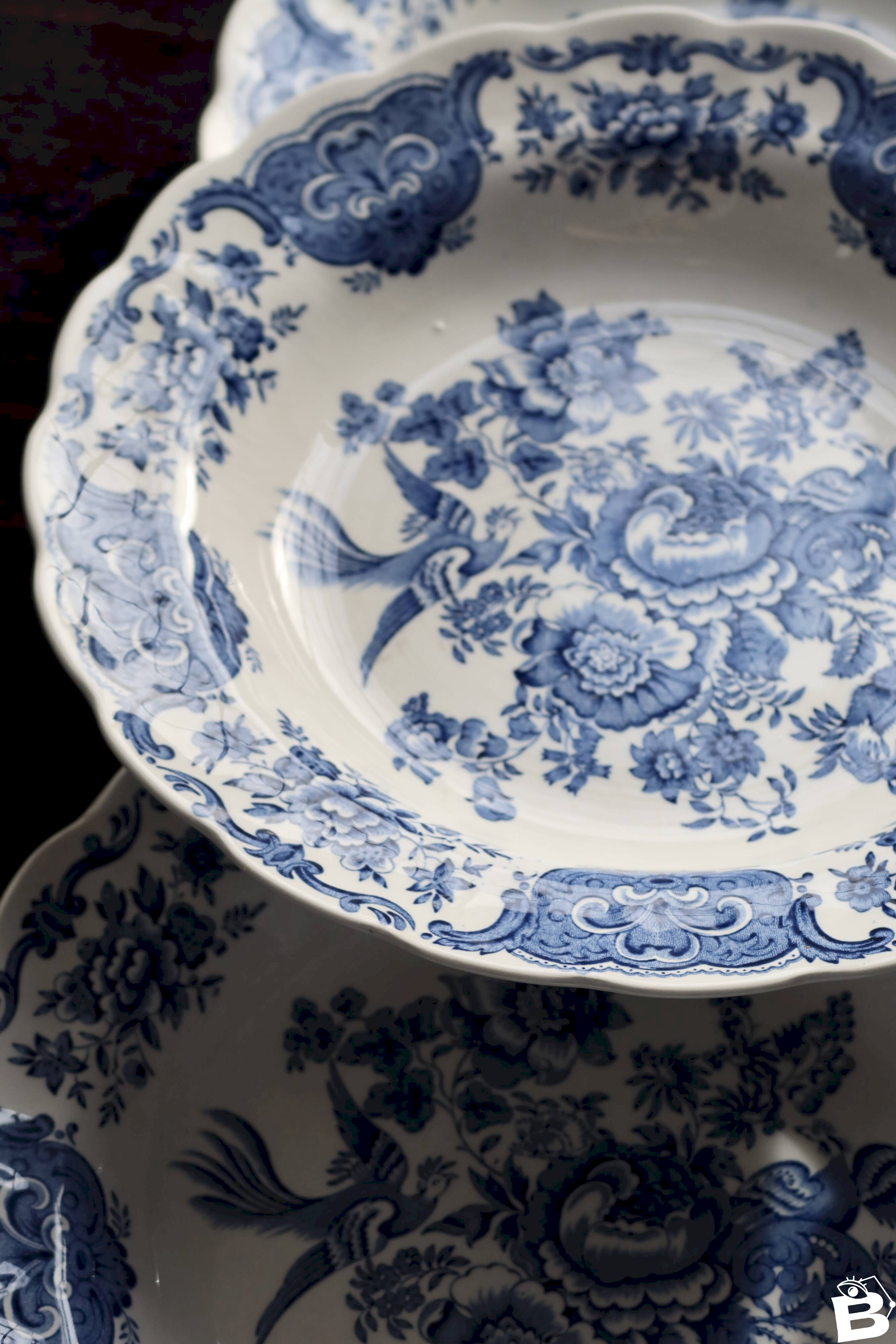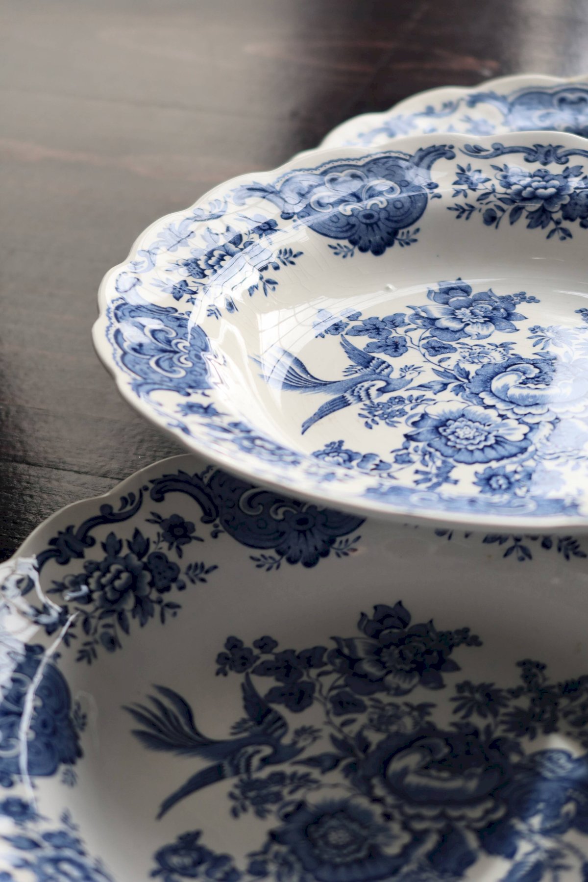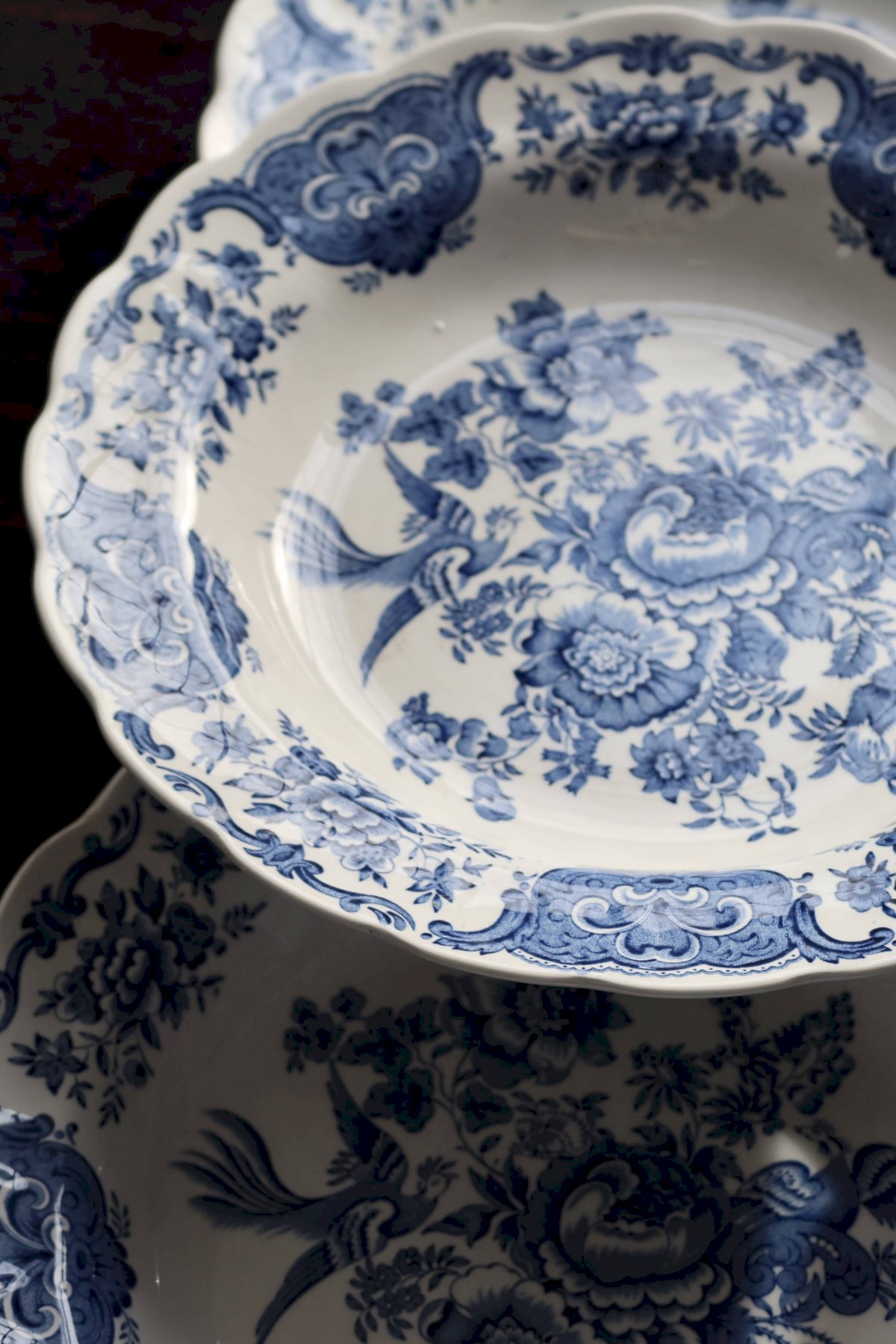 Set of six English porcelain soup plates by Ridgway, "Windsor" blue and white pattern: central bouquet, floral garland, and molded scalloped rim. Very fresh condition for the age, with some micro traces of use and rare firing spots. Two identical sets available to make up to 12 pieces. Dimensions: 24cm in diameter. L: 24 W: 24 H: 2