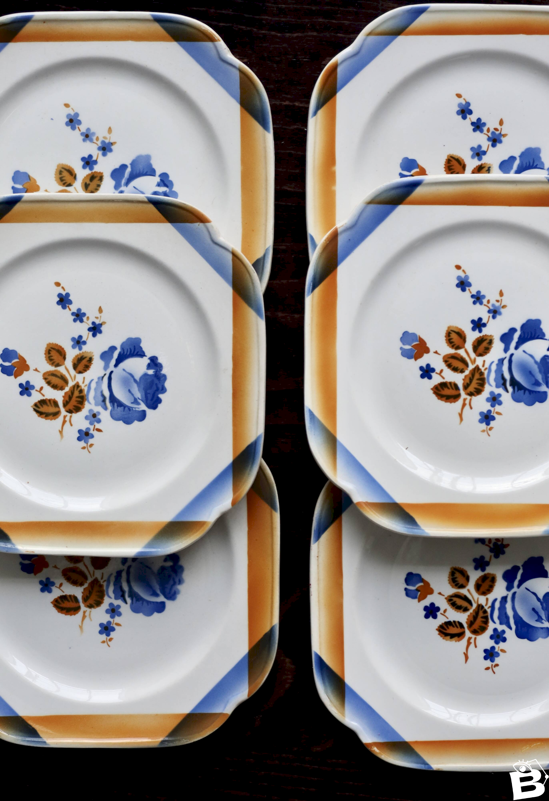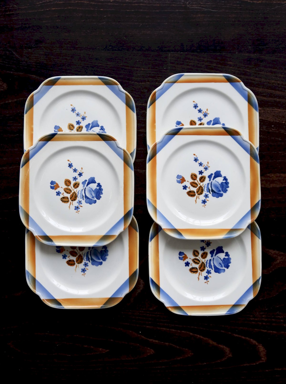 Set of six square dessert plates made of earthenware, decorated with a blue and ochre floral pattern enhanced by graphic borders at the corners.