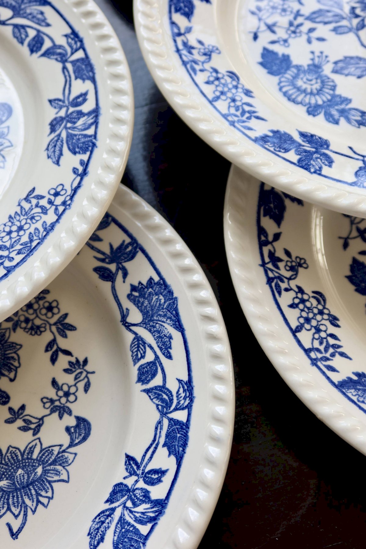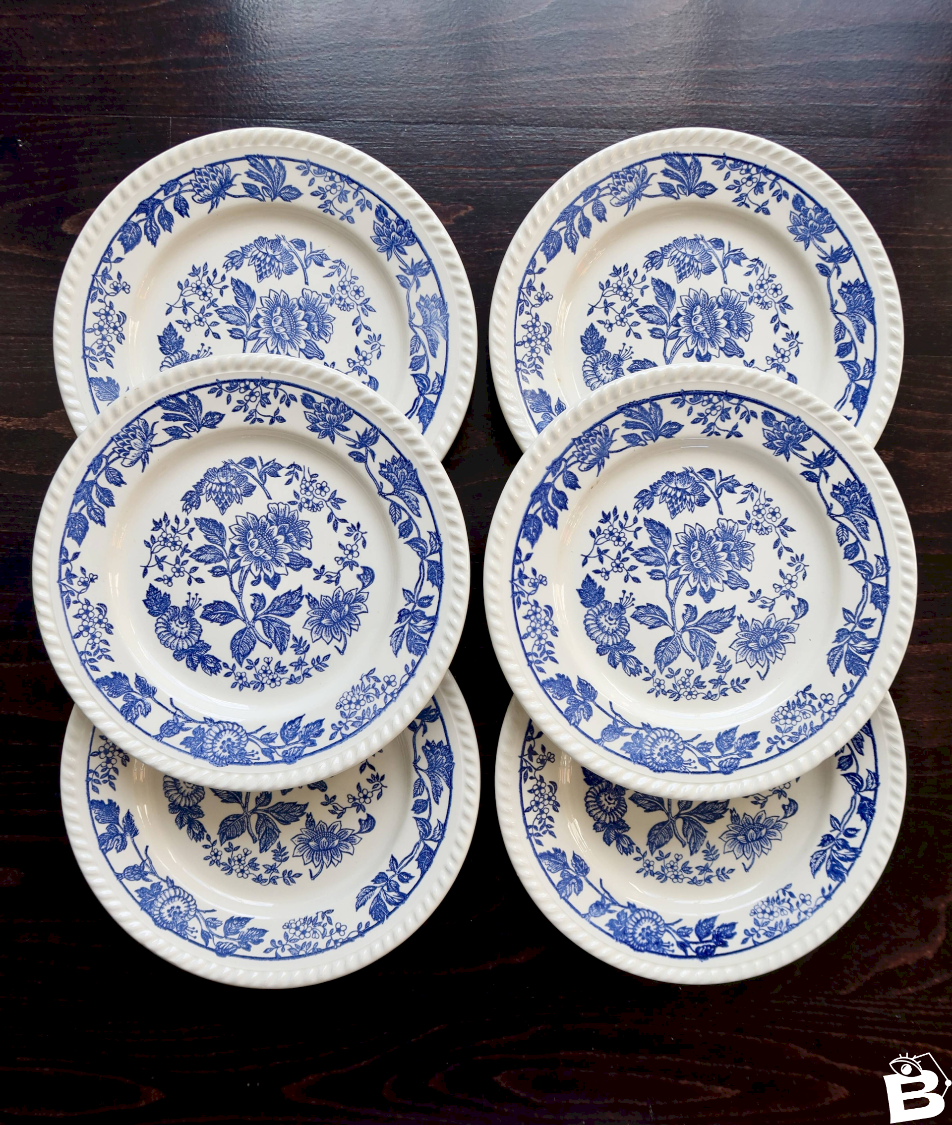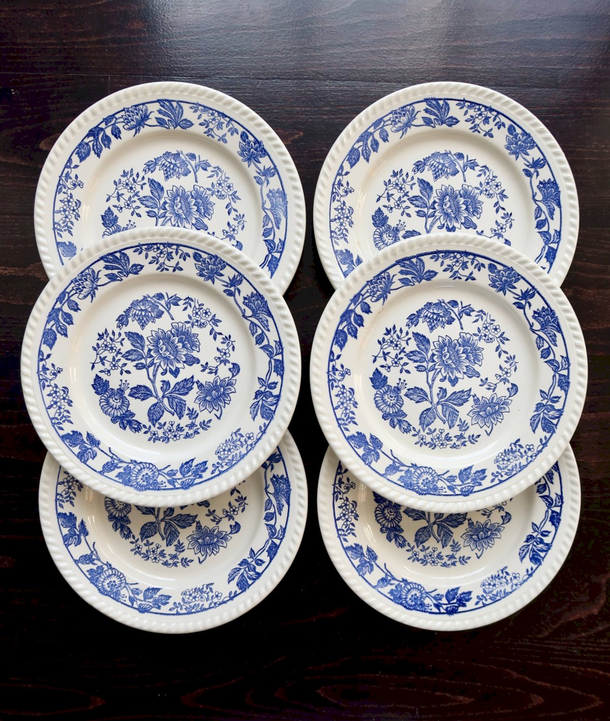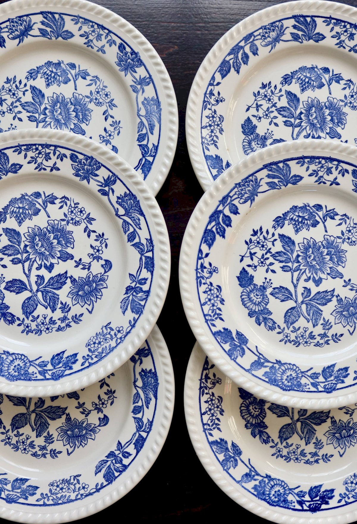 6 vintage white porcelain flat plates with a blue floral pattern Ceramic
