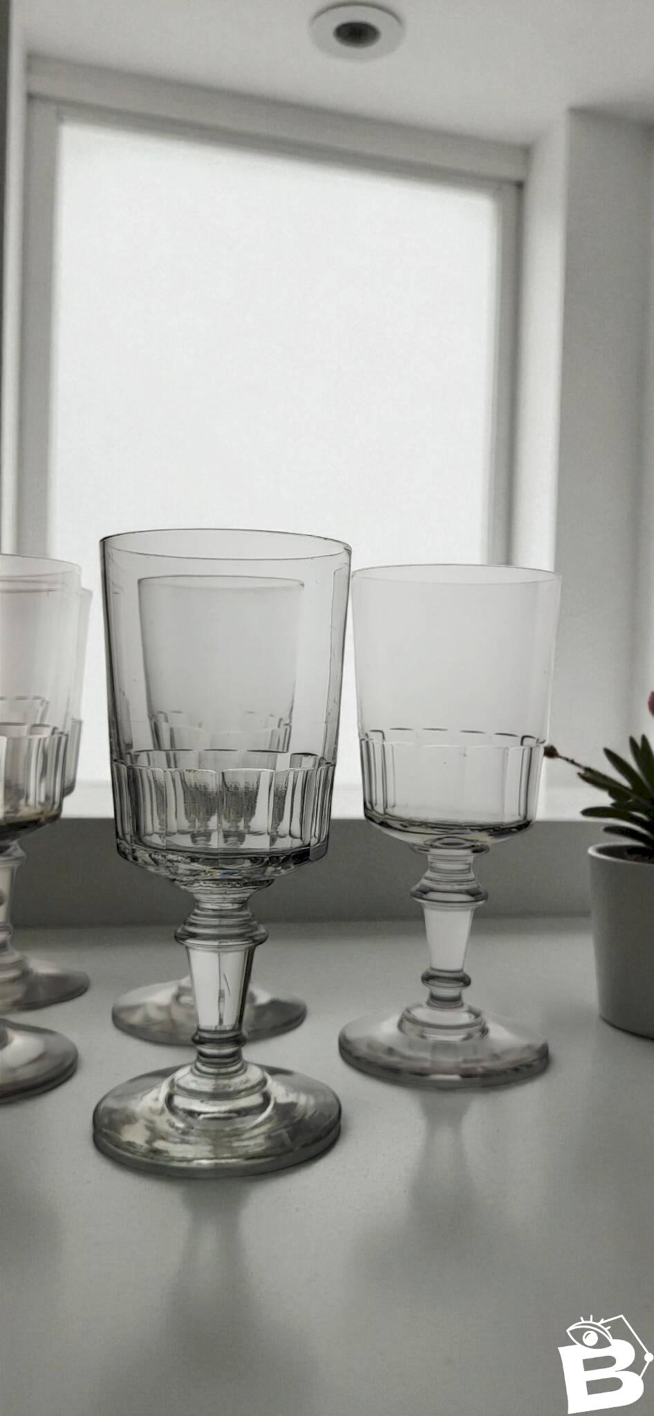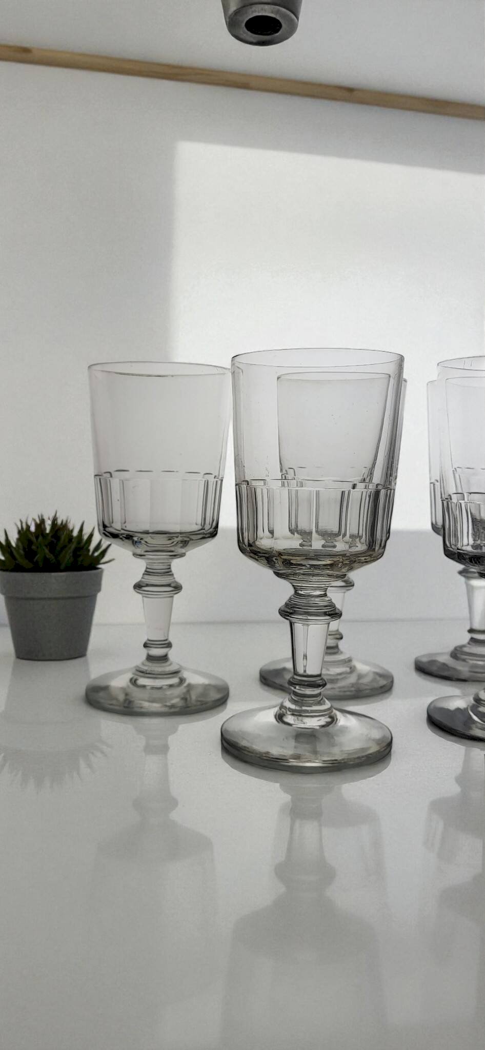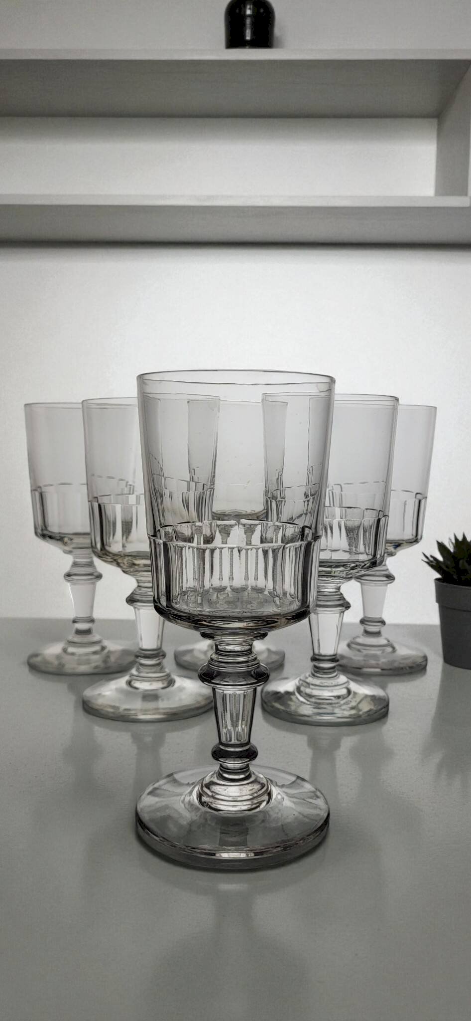 6 Water / wine glasses model Mirabeau / Glass Fine 19th century early 20th century. Cut faceted design. Height 15.5 cm. Diameter at the rim 7 cm. They are all in good condition without chips, not faded. Careful packaging and fast delivery. L: 7 W: 7 H: 15
