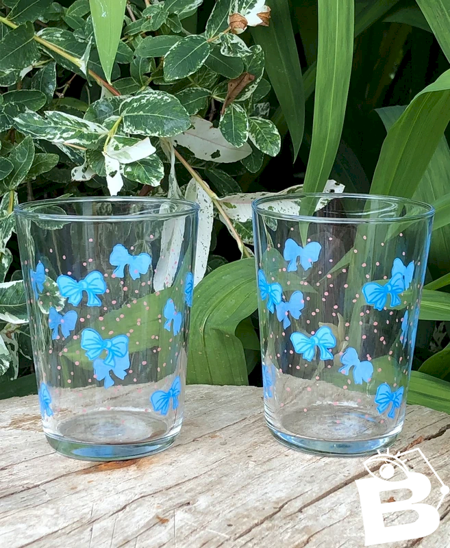 2 water glasses from the 1960s with small blue bow patterns in excellent condition. Height 8.5 cm, Diameter 6.5 cm.