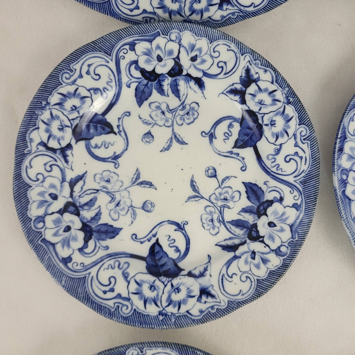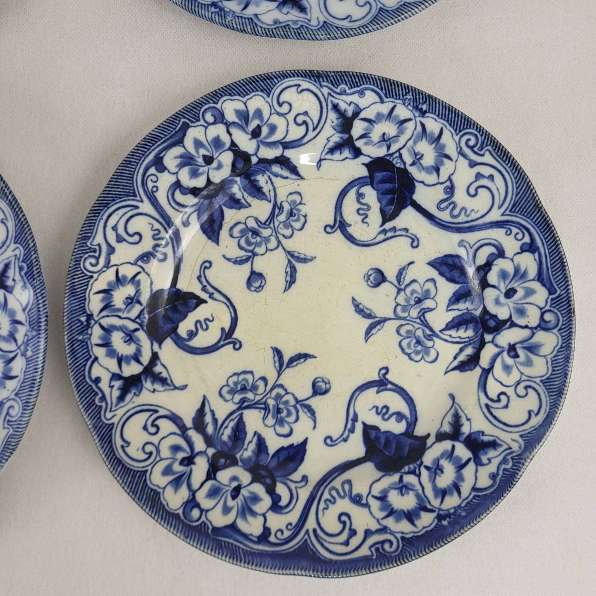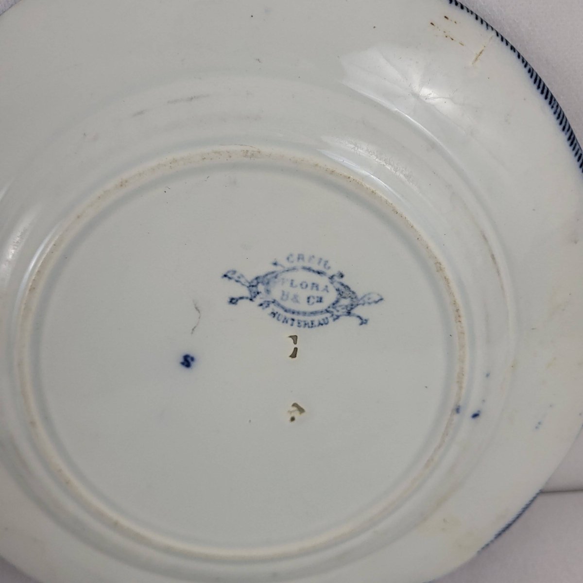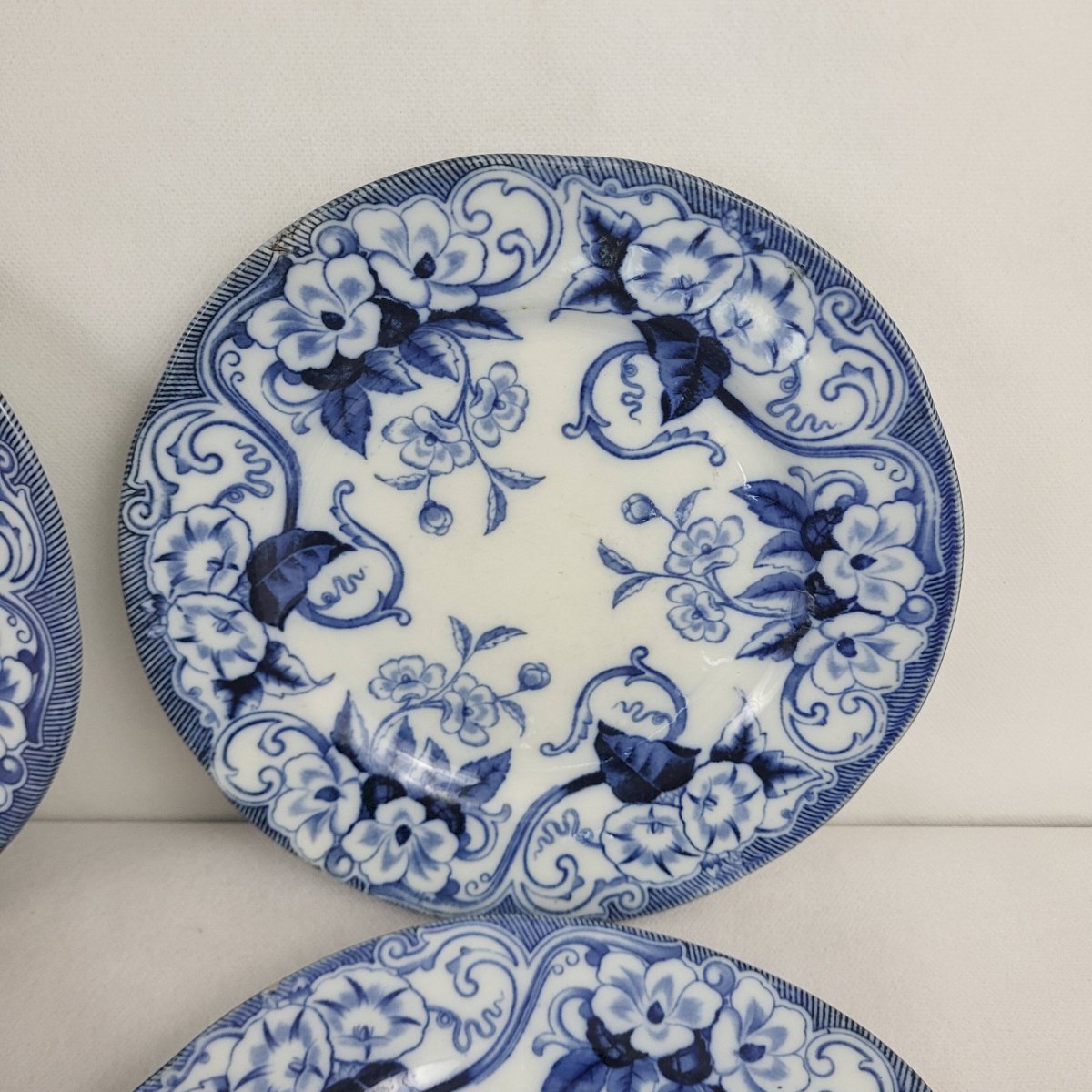 6 flat plates Creil & Montereau Flora. 6 flat faience plates from Creil & Montereau model Flora, 19th century. Diameter 23 cm. Height 2.2 cm. One chip on the set of 6 and one earthenware plate. Chips on the additional plate. Normal use and age. Careful packaging and fast delivery. L: 23 W: 23 H: 2