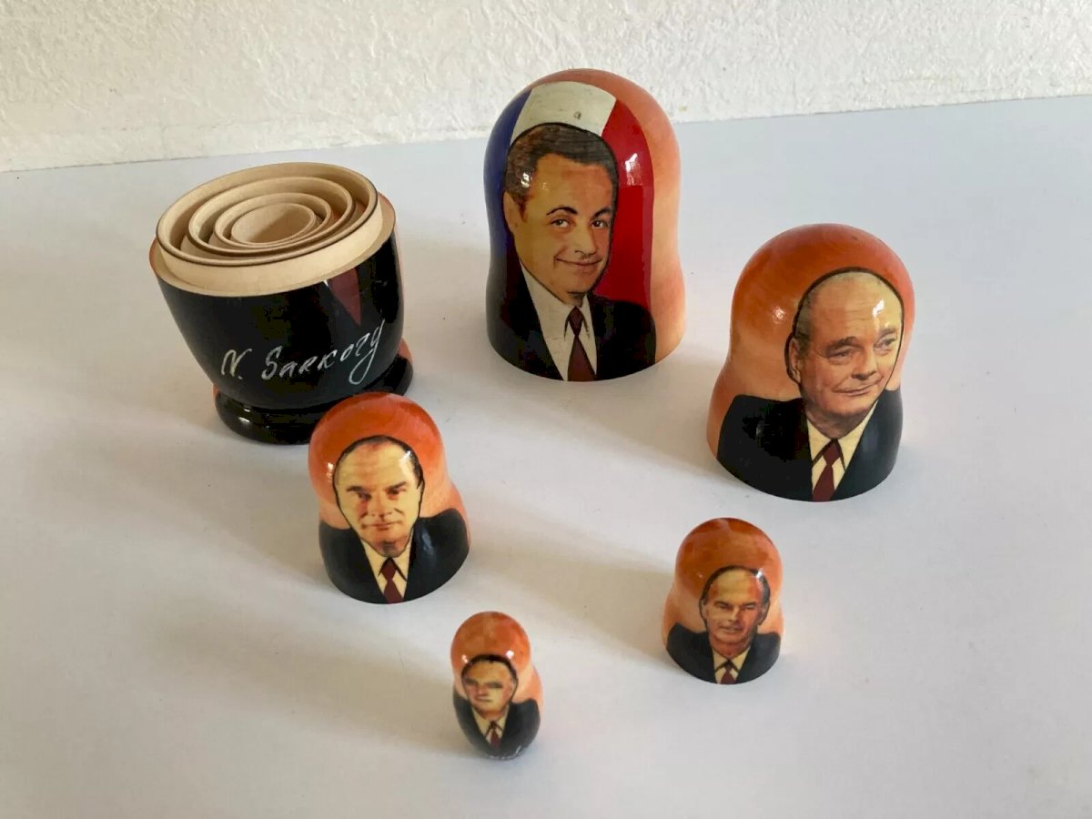♥ 5 Russian Dolls French Presidents France Sarkozy, Chirac, Mitterrand, Giscard, Pompidou ♥ Slight crack See photo No. 7 The tallest height 17 cm Condition: Used item. Please consult the seller's description for more details ... Used item. the possible imperfections. Country of origin: France