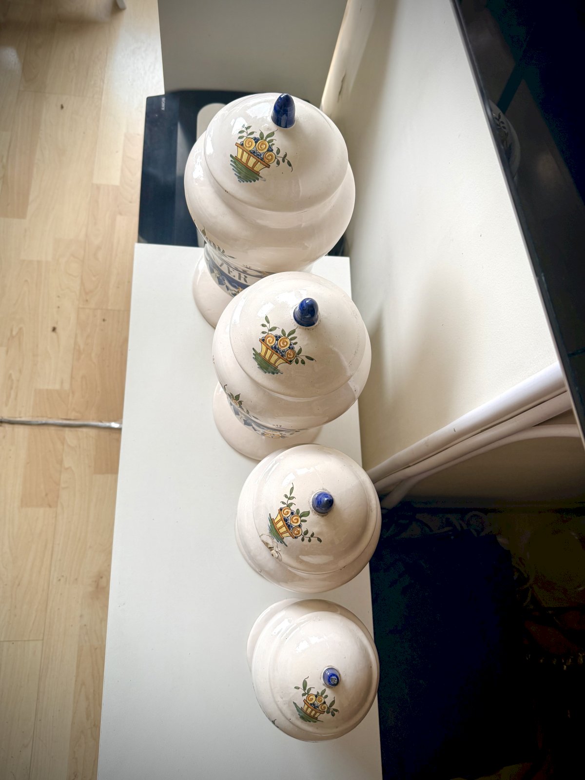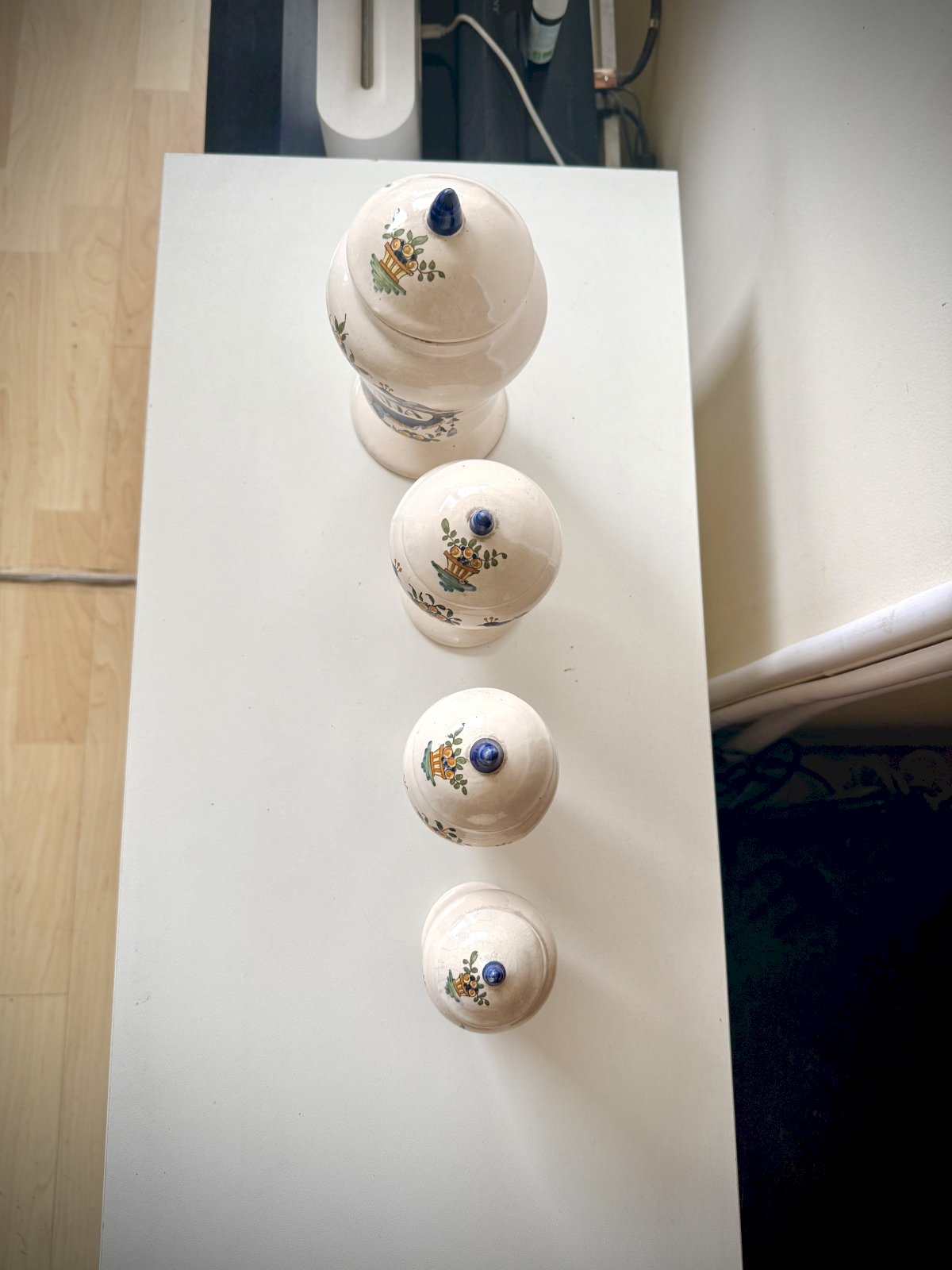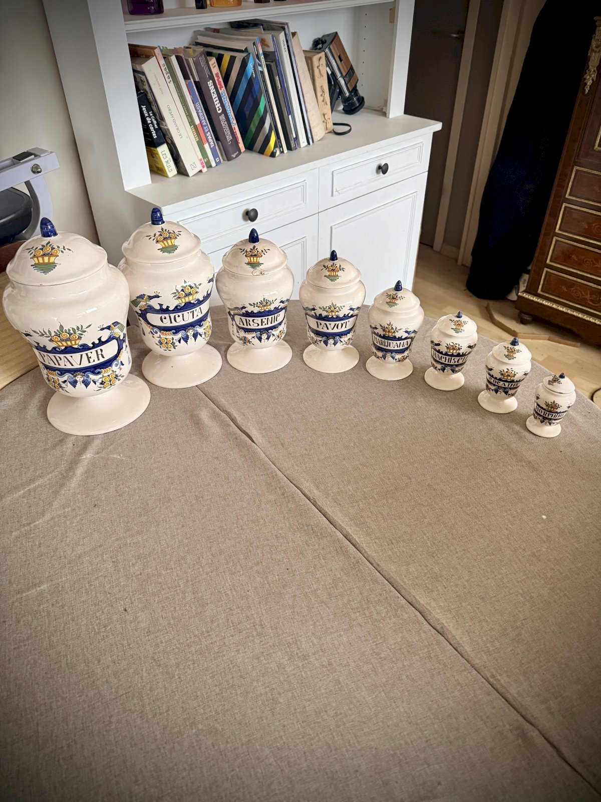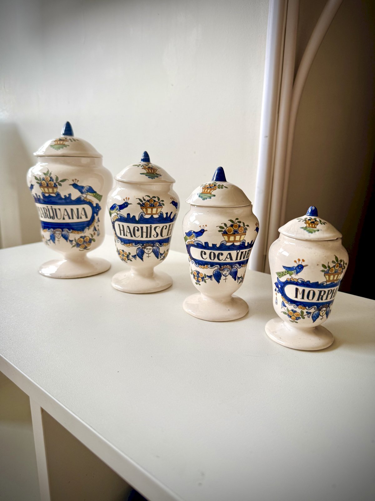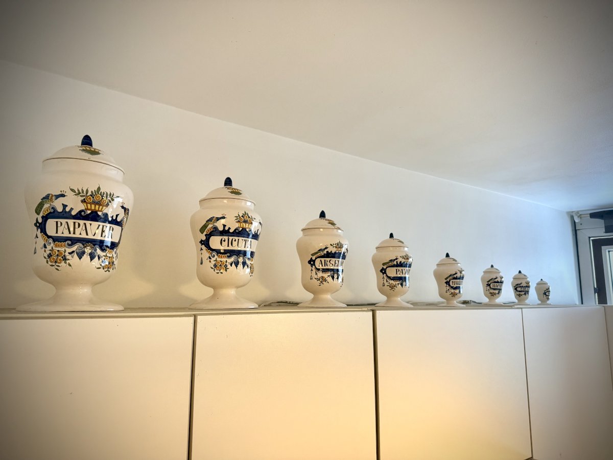 Beautiful series of ceramic pharmacy jars signed AK