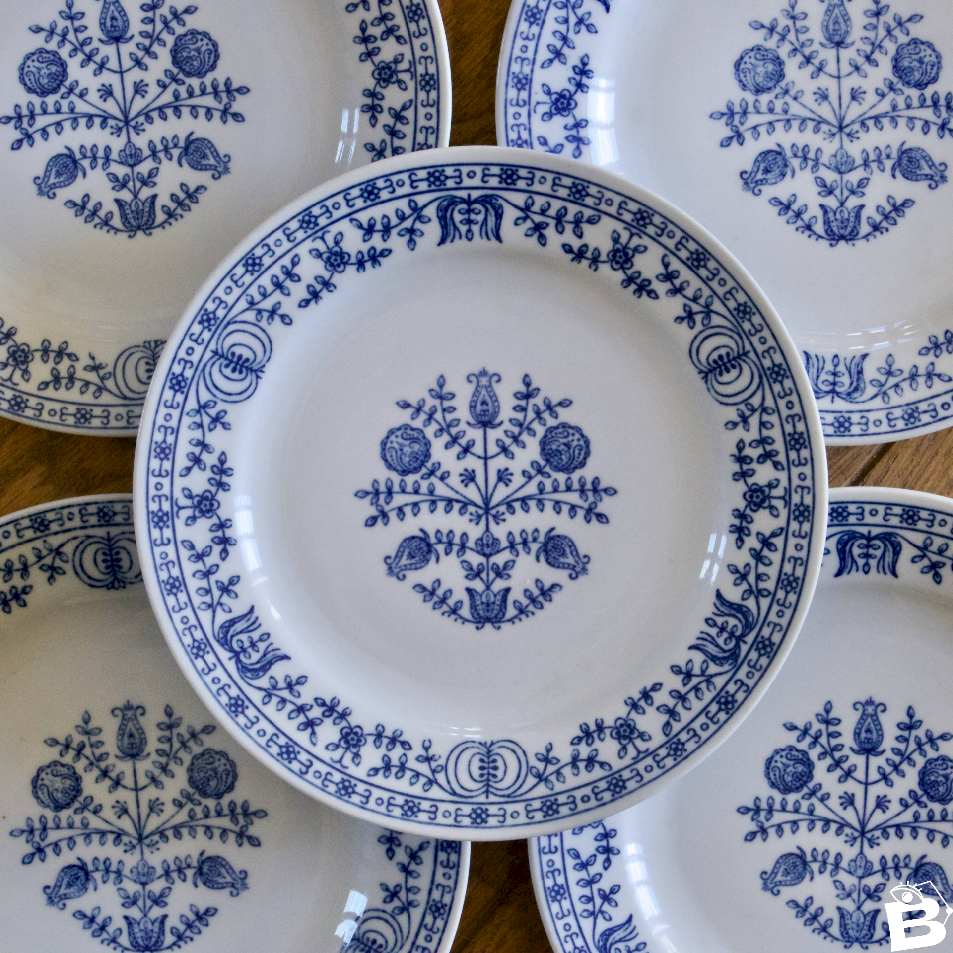 Set of 8 vintage dessert plates made of German porcelain signed Kahla, German Democratic Republic, circa 1980. Founded in 1844, the Kahla porcelain factory, located in Thüringen, is one of the most significant porcelain manufacturers in Germany. Beautiful cobalt blue decor combining geometric patterns and vegetation. Bright white porcelain that contrasts well with the deep blue design. In very good condition. The dessert plates as well as the oval plate from the same service are also available; see our other listings. ? 19 cm. ✨ Very careful shipping. ✨ Professional shop. ✨ You will receive an invoice and benefit from customer service after each purchase. ✨ We have other listings online, feel free to take a look. 12/25. L: 19 l: 19 H: 19