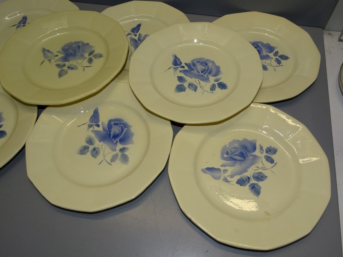 8 Digoin Sarreguemines plates in cream color featuring a blue rose and bud in the center (Diameter 23 cm) - please note a small chip on the edge of one, 3 have small brown marks, and one is slightly larger and thicker with a more intense color - (see photos) found items, attic finds - Ref. 1V240718/353 Diameter 22.5 cm & 1 Diameter 23 cm - Weight 2.8 kg. To contact me, my email address: SHIPPING POSSIBLE VIA MONDIAL RELAY or COLISSIMO upon request VERY GOOD PACKAGING GUARANTEED THANK YOU for CAREFULLY LOOKING AT ALL the PHOTOS as THEY ARE AN INTEGRAL PART of the DESCRIPTION and ALLOW YOU TO SEE the ITEM AT ITS BEST with ITS POSSIBLE SMALL DEFECTS -