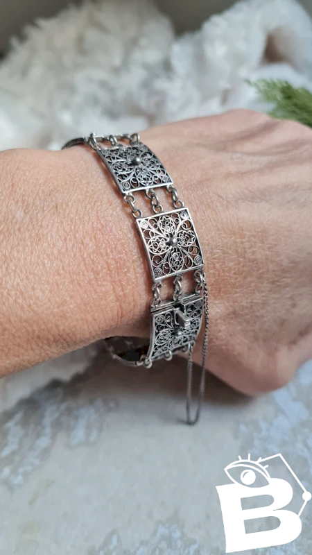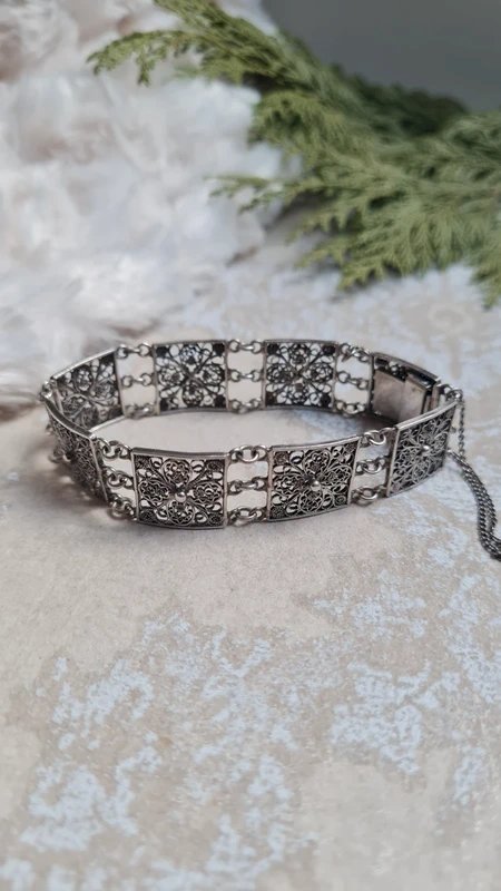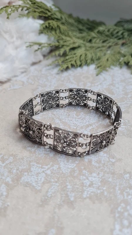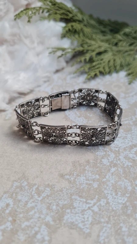 Above 25€, please choose a carrier if possible. Take the opportunity to buy in bulk: - 5 items - 10% - 10 items - 20% - 20 items - 30%. Please look carefully at the photos to see the imperfections. Dimensions: Length: 17 cm, Width: 1.5 cm. #bracelet #chic #gift #collection #jewelry #silverjewelry #silverbracelet #silver #filigreebracelet #filigree #silverfiligree