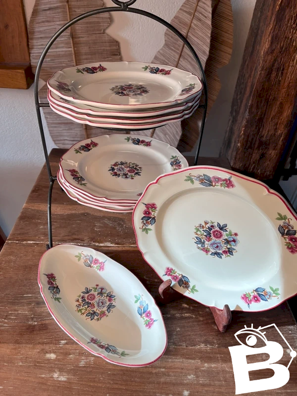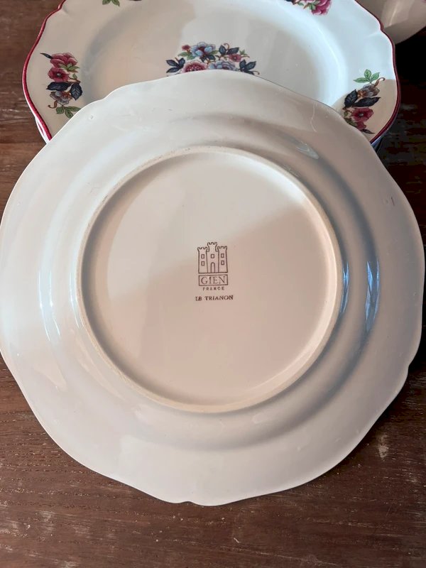 9 flat plates and 1 dish from the Gien pottery model Le Trianon (1971) in white earthenware with polychrome floral patterns, red rim.
