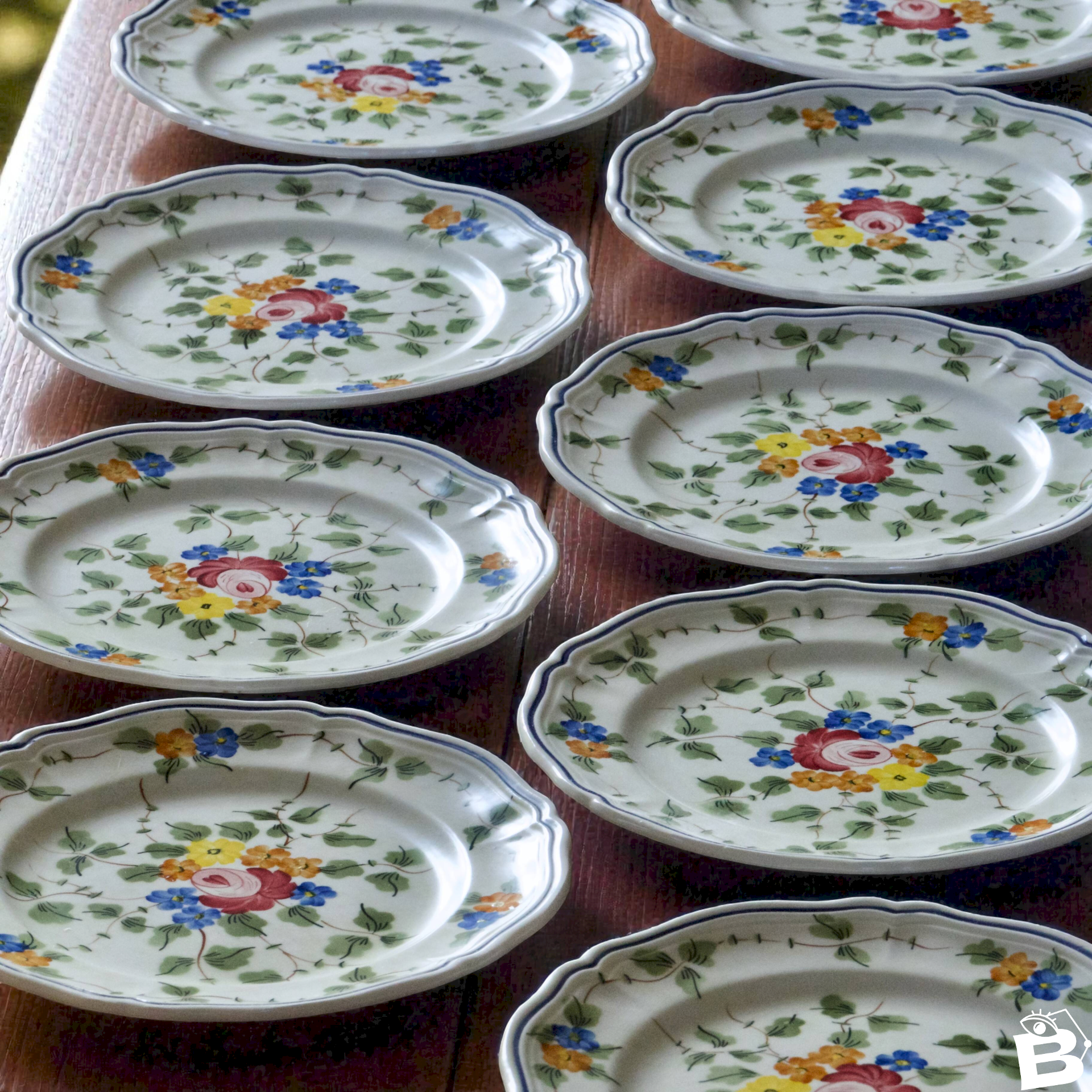 Set of 9 beautiful vintage dessert plates stamped Longchamp, Nemours collection. Sublime multicolored floral decor delicately hand-painted, small flowers in yellow, blue, raspberry, and ochre, scalloped rim. They are thick and sturdy, high-quality plates. In very good condition. The large flat plates from the same collection are also available, see our other listings. ? 19.5 cm in diameter. ✨ Very careful shipping. ✨ Professional store. ✨ You will receive an invoice and benefit from customer service after each purchase. ✨ We have other listings online, feel free to take a look. 01/26.