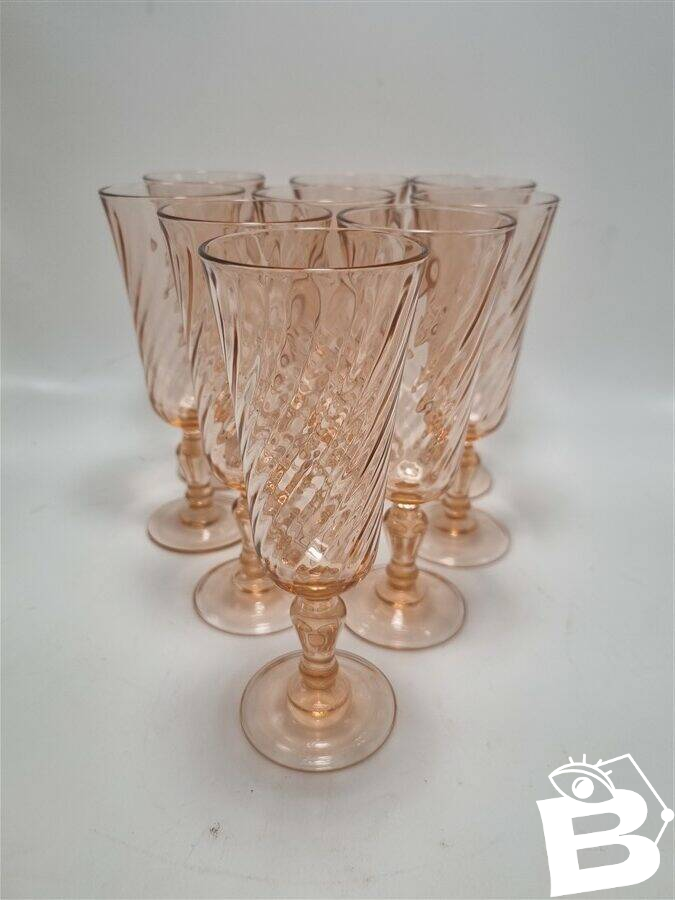 Set of 9 vintage rosaline glass flutes. Height: 16.4 cm. Width: 6 cm. Depth: 10.3 cm. Weight of the lot: approximately 1.5 kg. L: 6 W: 10.3 H: 16.4