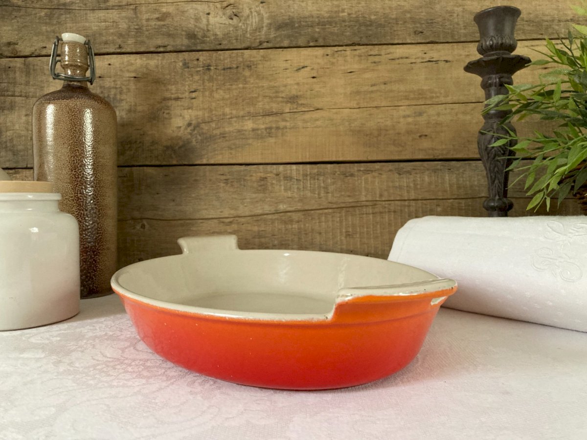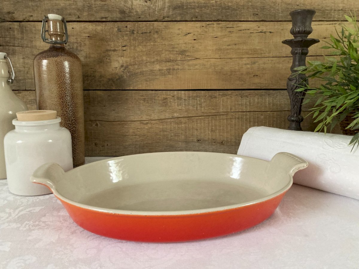 ⚜️ Vintage Orange Enamelled Cast Iron Oval Dish Style Le Creuset ⚜️ France Length 32 cm, Height 5 cm Condition: Used: Item has been used. Item shows some signs of superficial wear, ... Used: Item has been used. Item shows some signs of superficial wear, fully operational and working correctly. It may be a demonstration model or an item returned to the store after a short period of use. any imperfections. Color: Orange Type: Baking Dish Material: Enamelled Cast Iron Height: 5 Shape: Oval Diameter: 32 Country of origin: France