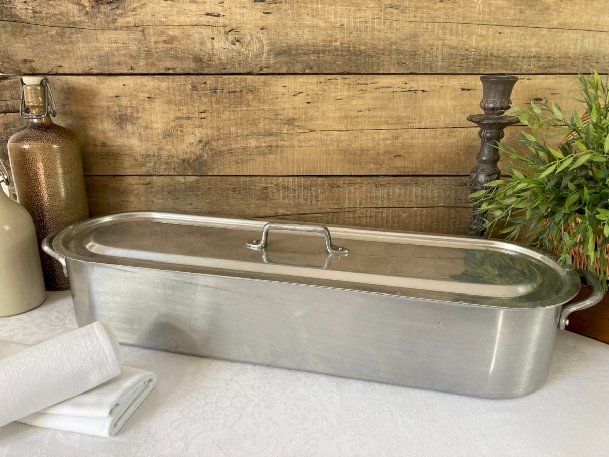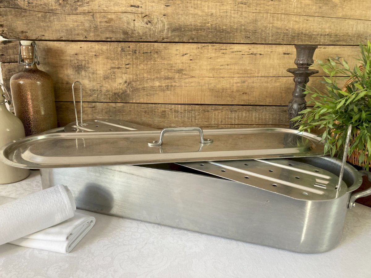⚜️ Vintage Large Aluminum Fish Poacher ⚜️ Length 62 cm, Height without lid 12 cm Condition: Used: Item has been used. Item shows some minor surface wear... Used: Item has been used. Item shows some minor surface wear, fully operational and functioning correctly. It may be a demonstration model or an item returned to the store after a short period of use. any possible imperfections. Material: Aluminum Country of origin: France