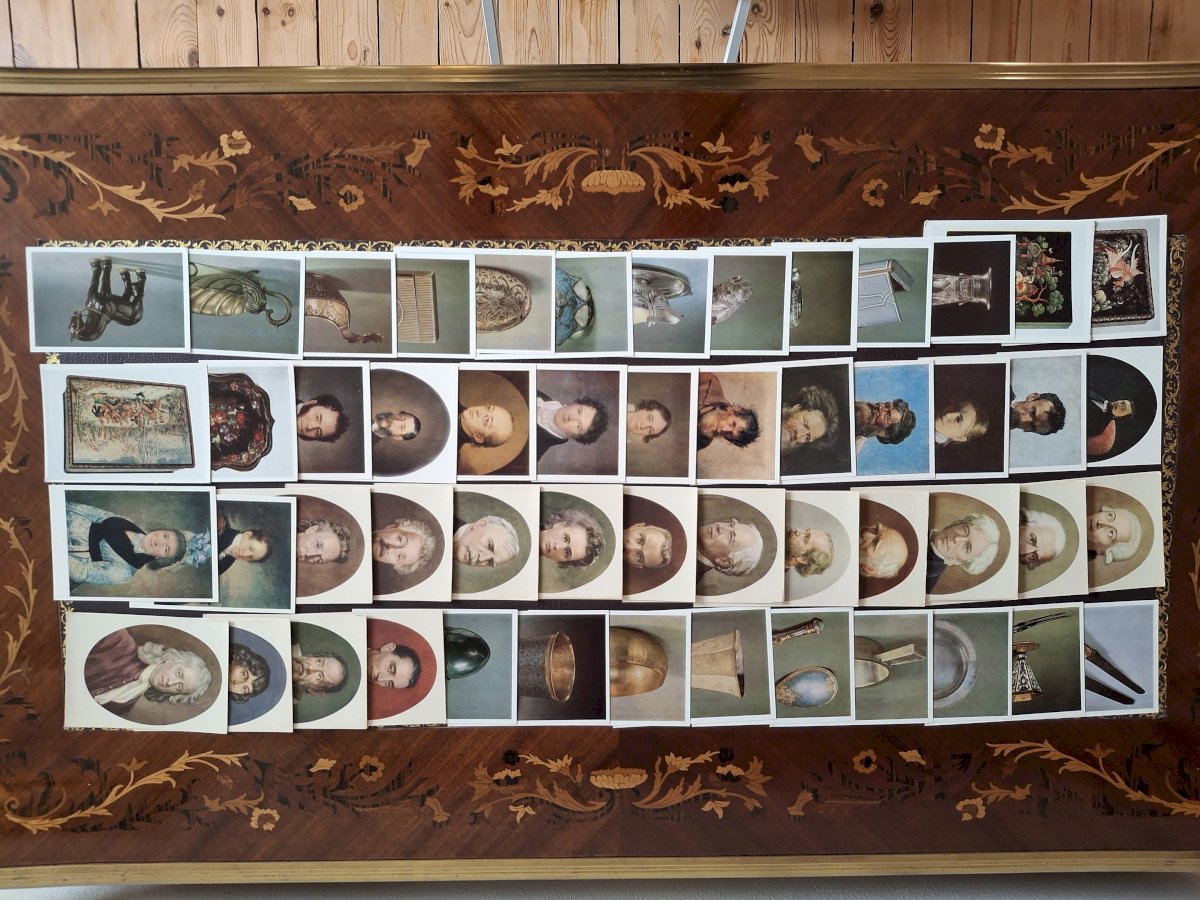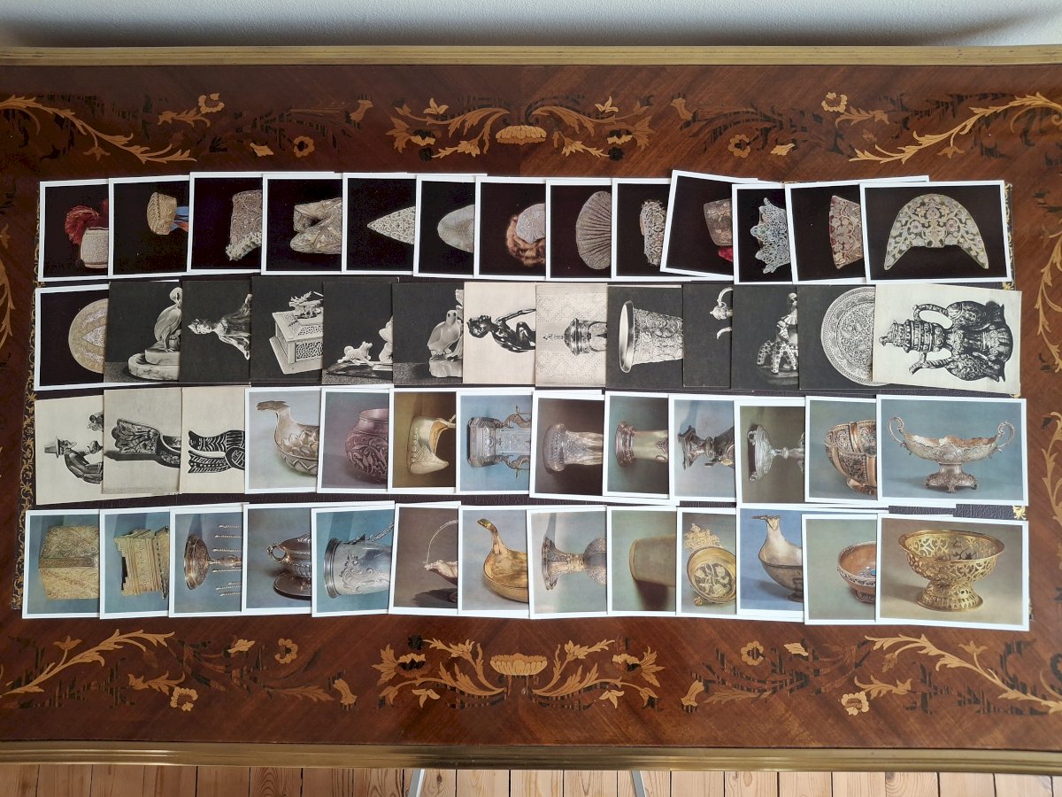 In detail, I counted 160 paintings, plus 28 portraits, 55 cards depicting fabrics or tapestries, 16 featuring costumes, 192 focusing on precious objects or antiques, and 48 other cards with various subjects; see photo 11, which has a long caption on the back, leaving little room for text; see photo 12.