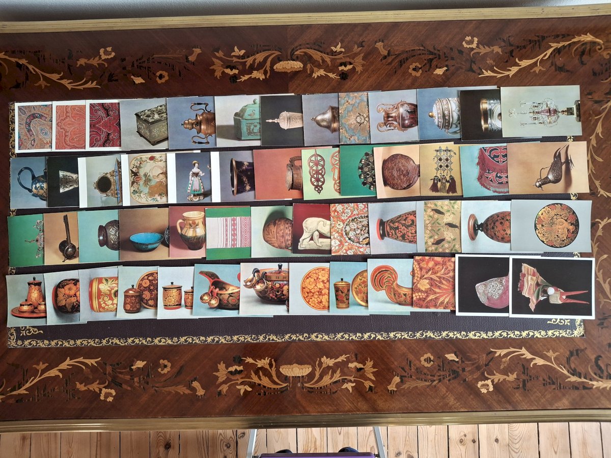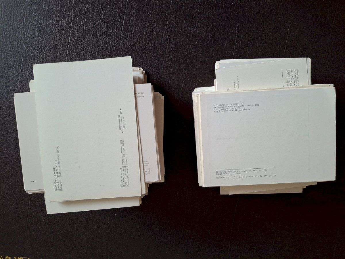 A lot of over 500 postcards from the former USSR featuring paintings or objects preserved in Soviet museums. This now corresponds to the territory of Russia, but it seems to me that there are a few cards from what is now Uzbekistan and maybe from Ukraine; I apologize for not being able to distinguish them. There are also 2 or 3 cards printed in the USA but with Cyrillic text.