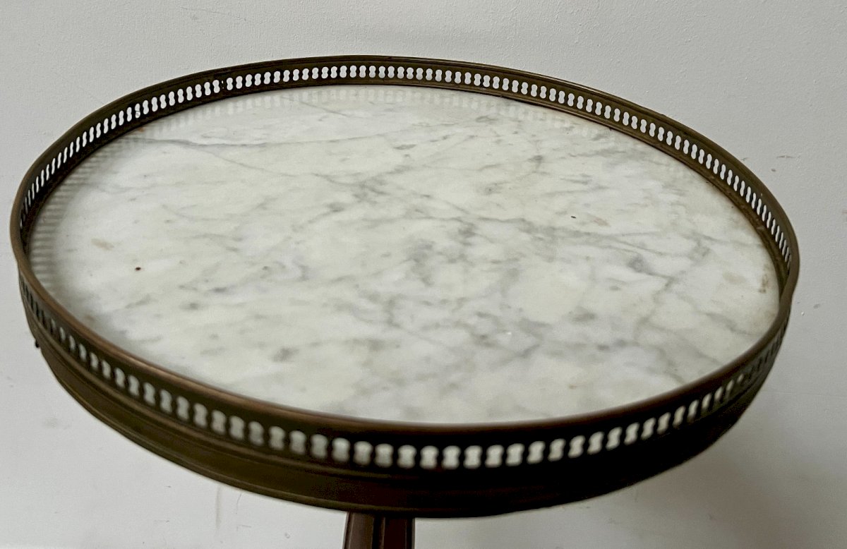 Set of three Louis XVI style gueridons Tripod base in stained beech White veined marble top with brass gallery Good condition Dimensions H 53 cm x diameter 35 cm / 30 cm / 29 cm XX century Type: gueridon Country of origin: France Height: 53 Material: Marble Length: 35 Width: 35 Shape: Round