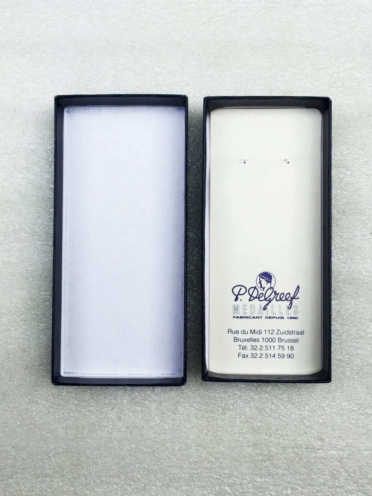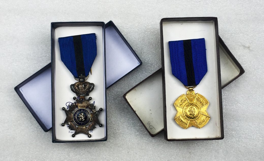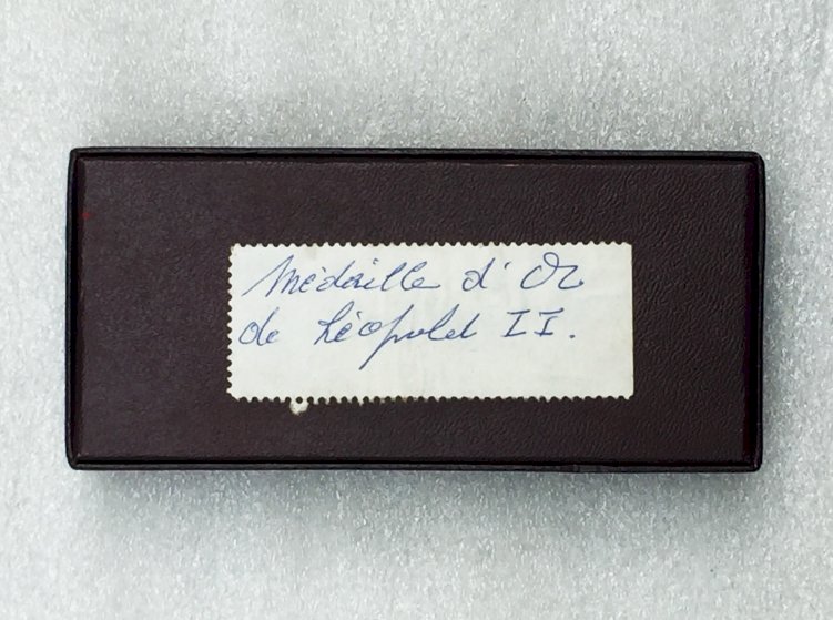 Very beautiful and luxurious cross/knight medal of the Order of Leopold II DE GREEF in Brussels + gold medal with double motto (French + Flemish, after 1952) in its original box as well. Enamelled cross in gilded bronze. With patina and signs of aging. Very pleasant to hold and even more to observe in a display case. Very rare and 100% original.