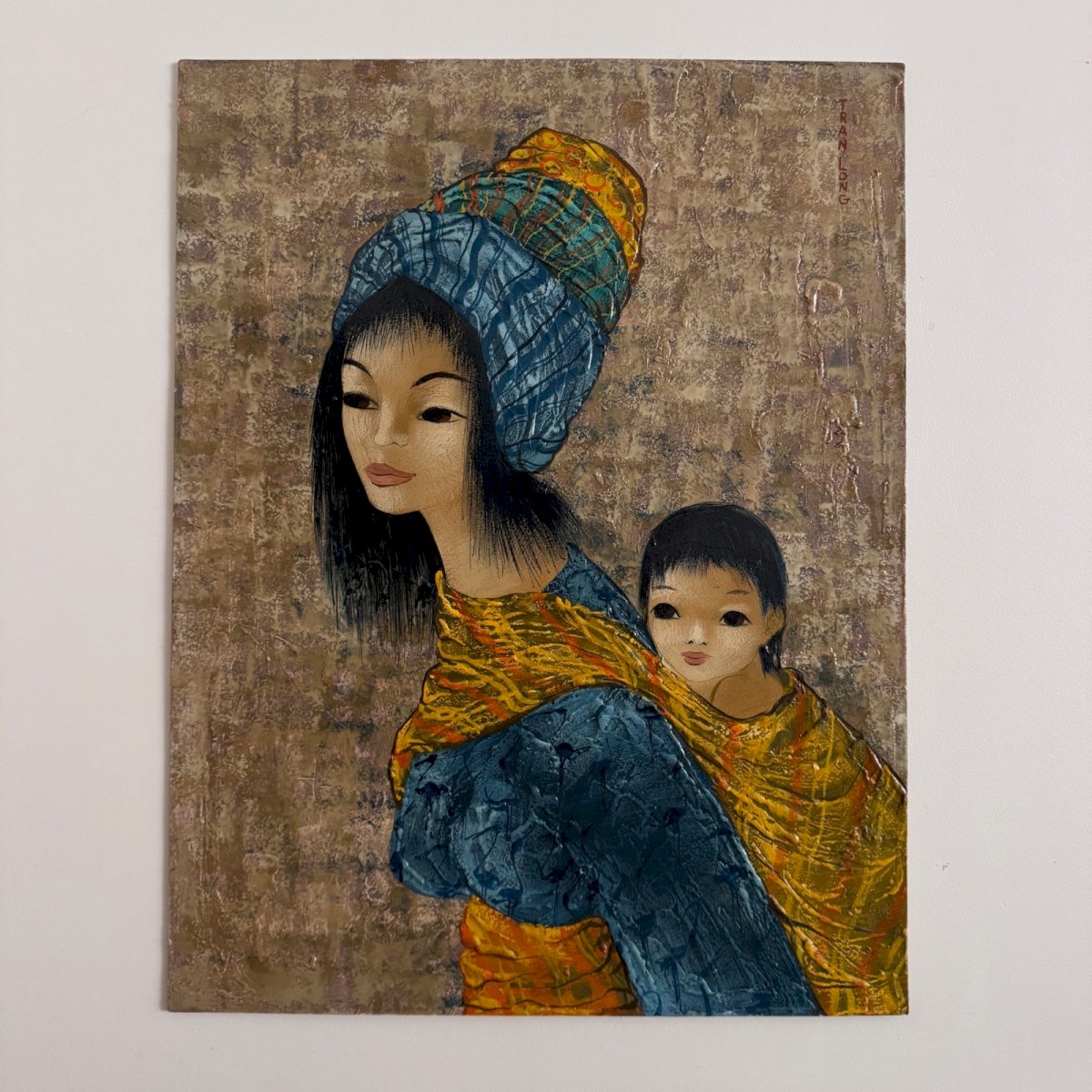 Acrylic on cardboard by Tran Long, a mother holding her child A5759. This acrylic on paper was created by Tran Long and is typical of this artist. The work is in superb condition. Mara Tran Long, born Marinette Védry, adopted her Vietnamese husband’s surname as her artist name. Her work, initially focused on realistic subjects, has evolved into a more imaginative style, where refined drawing and depth of color dominate, while still being centered on Asian inspiration. A prolific artist, she has exhibited her works at the Belle Gabrielle Gallery in Montmartre, the Moyon Avenard Gallery in Nantes and Aix-les-Bains, as well as the Espace 2000 in Brussels. Her recognition extends beyond borders with exhibitions in Los Angeles, Tokyo, and Oslo. Our photos allow you to appreciate the quality of the work. For condition, please refer to the detailed photos. Feel free to zoom in. The photos are an integral part of the description. Dimensions: Height: 65 cm Width: 50 cm Thickness: 0.1 cm S: 7BEEFFF1 P: 1616353 I remain at your disposal for any questions. Country of origin: France Authenticity: Unknown Weight: Unknown Type: Acrylic Height: 65 cm Style: Not specified Genre: Unknown Length: cm Features: Signed Width: 50 cm Theme: Child