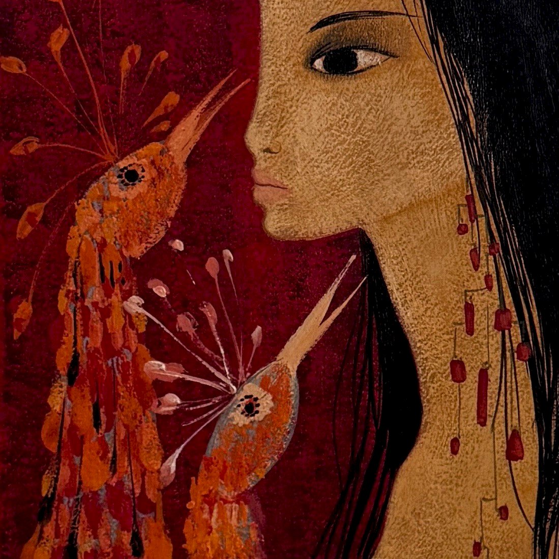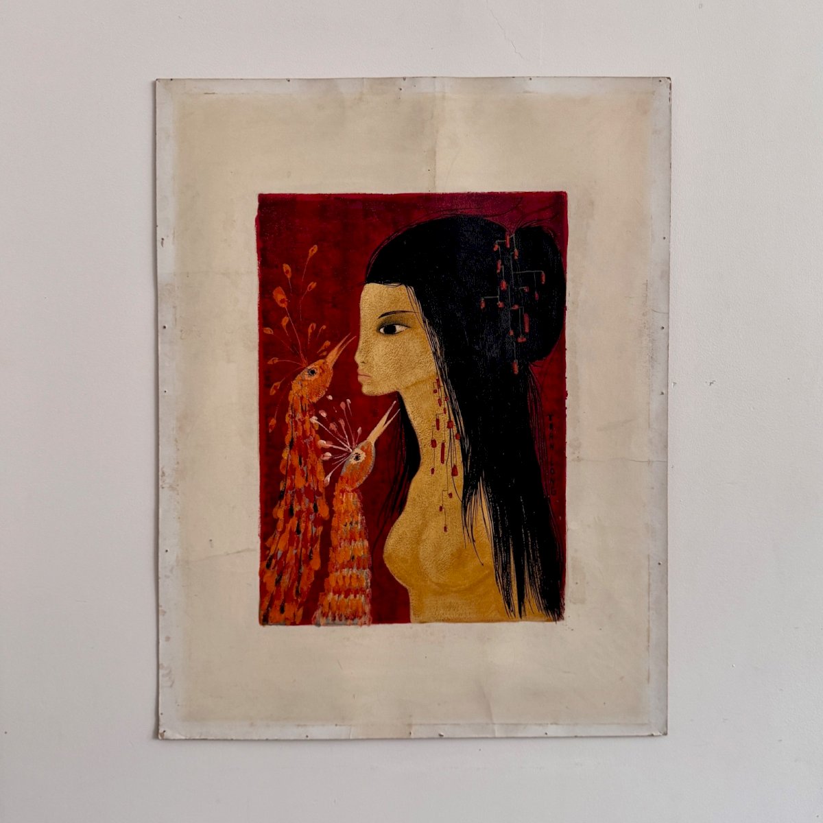 Acrylic on paper naked girl with peacock heads by Tran Long 20th century A5758