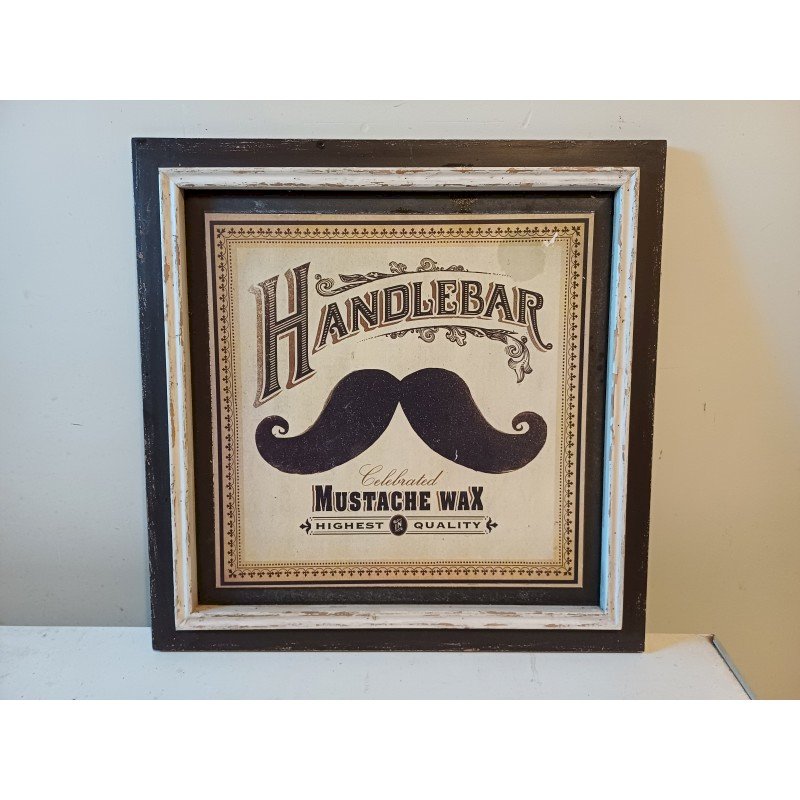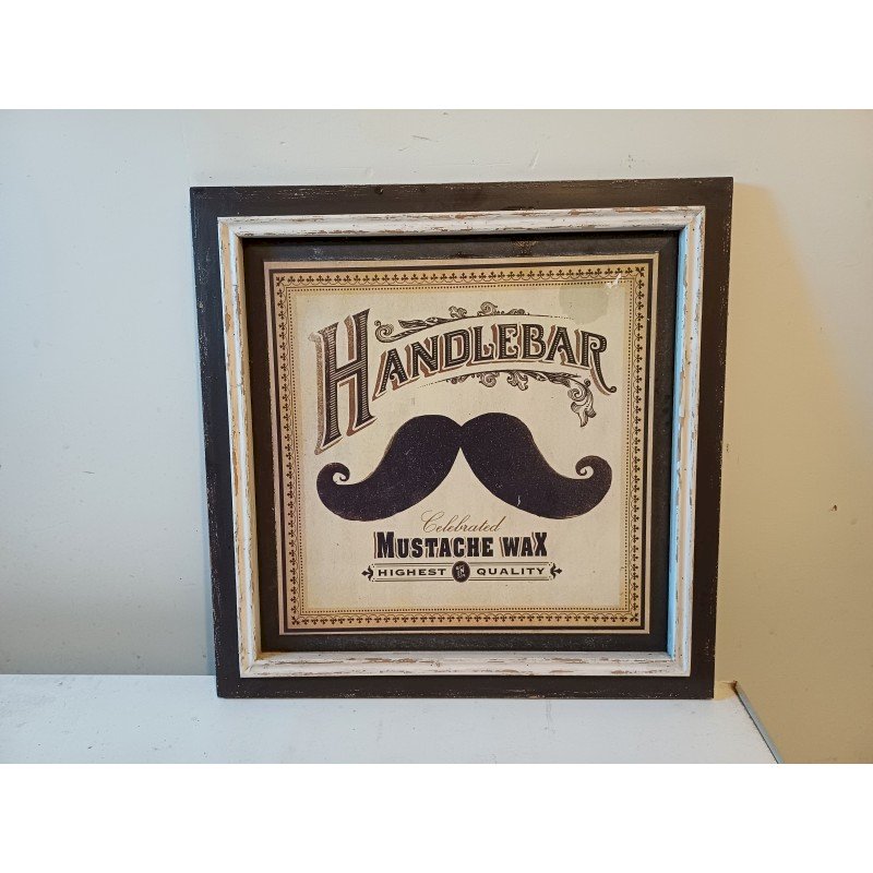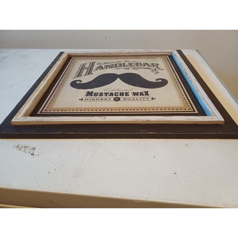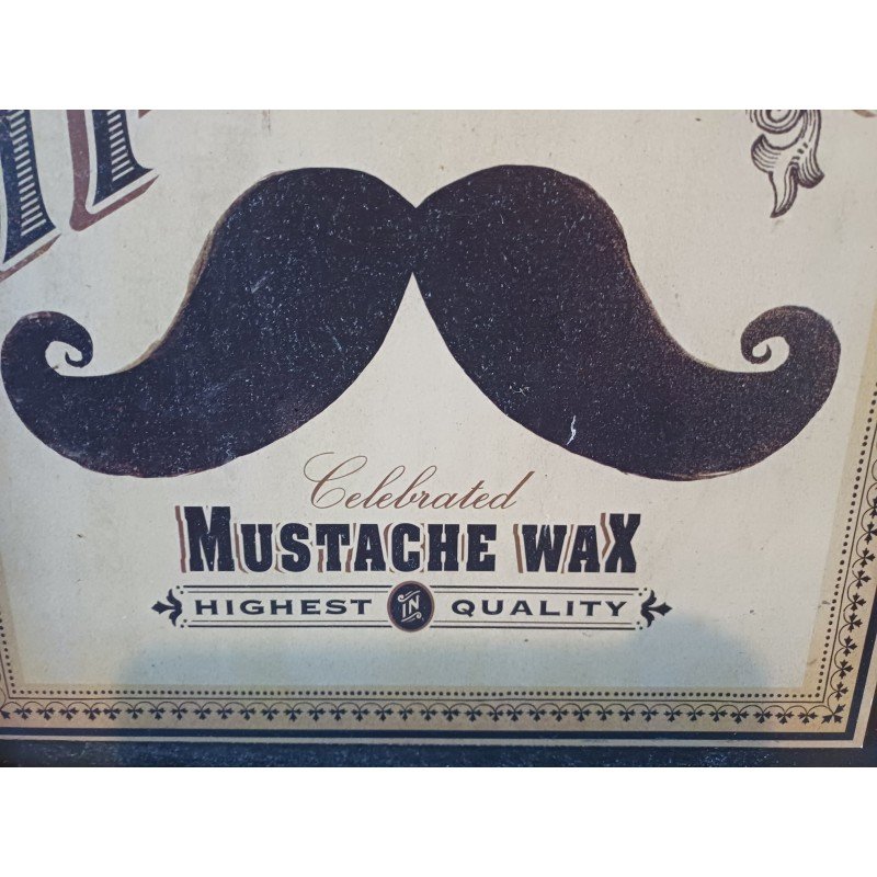Advertising Decoration Wooden Barber Hairdresser, Handlebar Mustache Wax, Paper Print, length and width: 51 cm by 51 cm, thickness: 2 cm, weight: 1.6 kg, very good condition.
