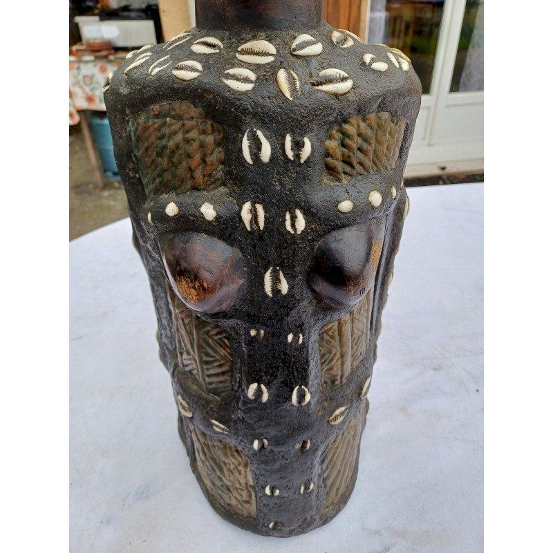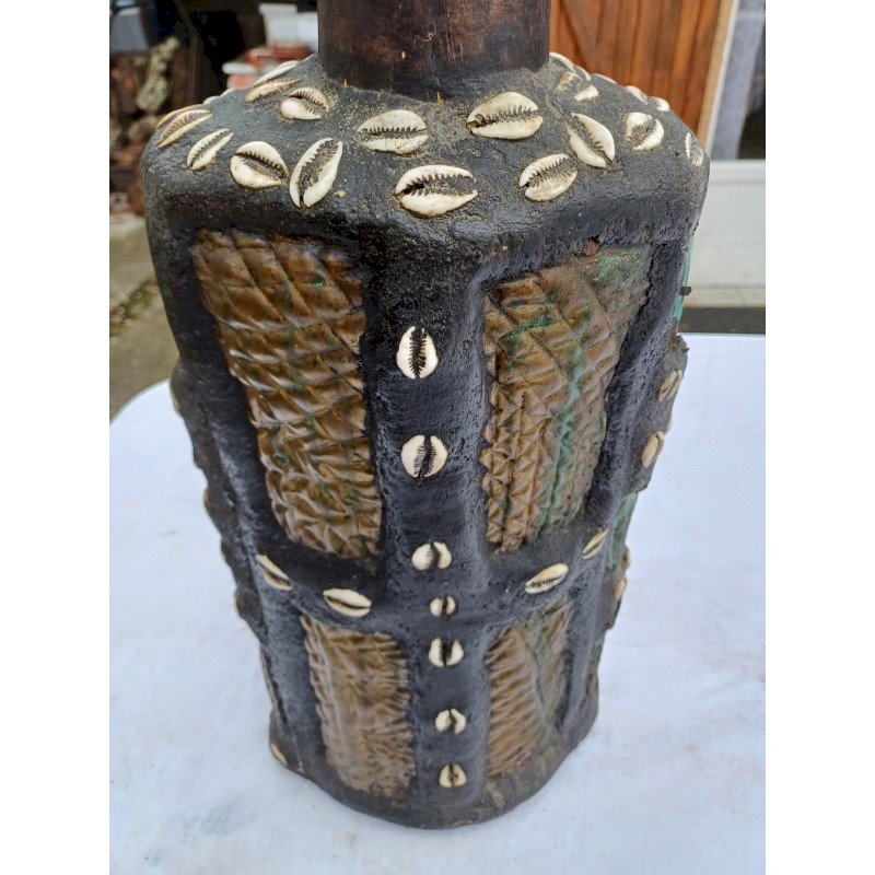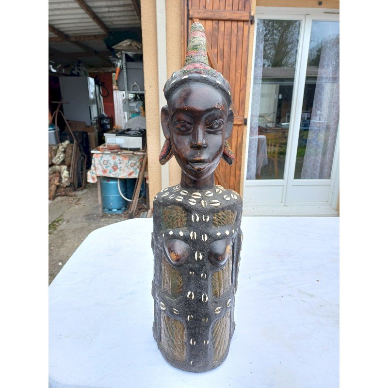 African Woman Statue in Wood, brass, beads, shells, Height: 74 cm, Length and Width: 21.5 cm by 20 cm, Weight: 6.2 kg, very good condition.
