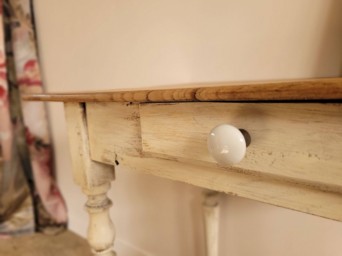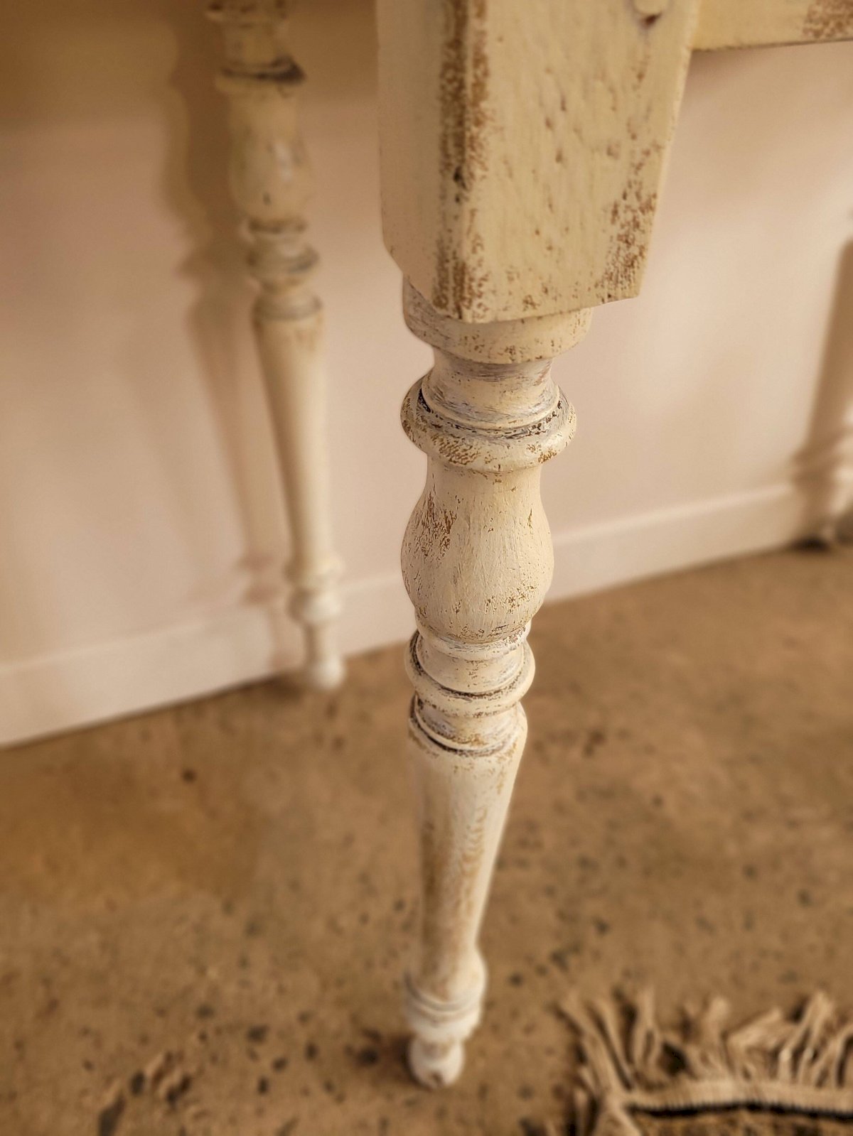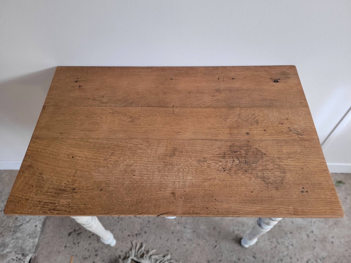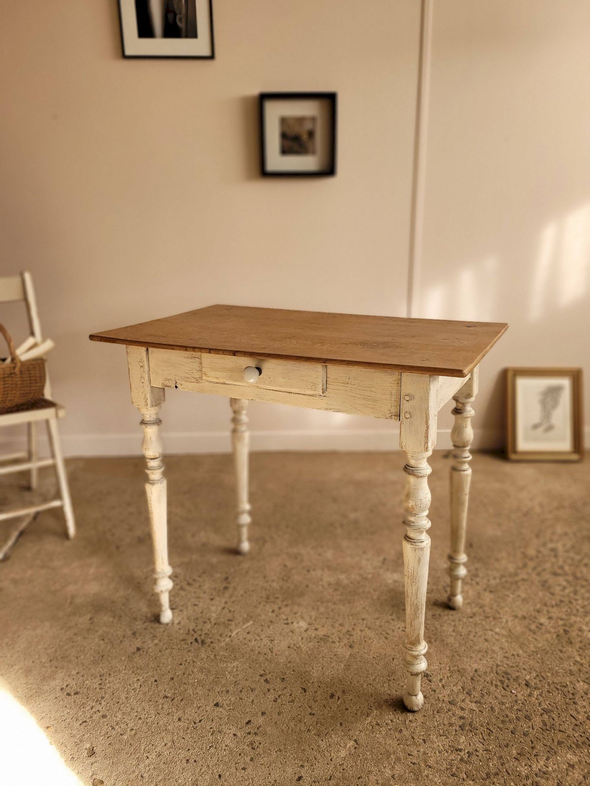 We love its patina, its turned wooden legs, its rustic style, its incredible charm! As a desk or a small side table in an entryway or kitchen, we can easily imagine it in a home! In good overall condition. Dimensions: 80 X 73 X 49 cm (W X H X D). W: 80 D: 49 H: 73