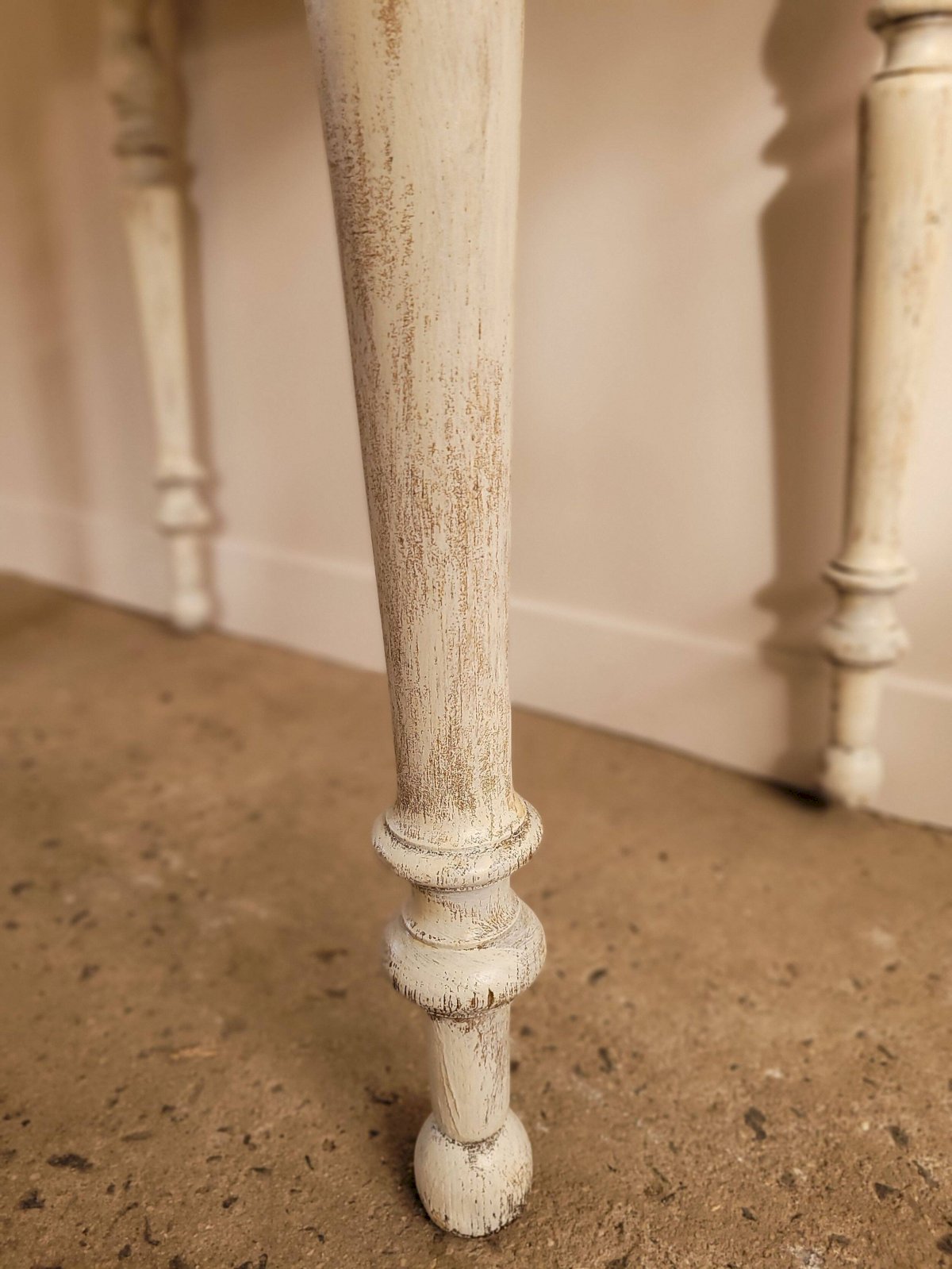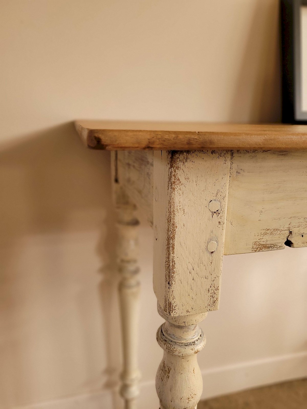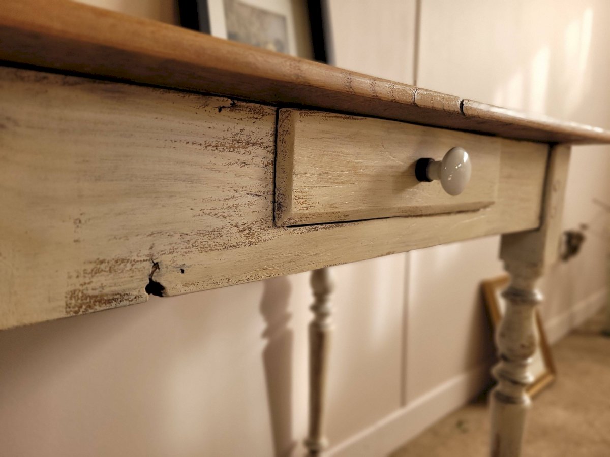 We love its patina, its turned wooden legs, its rustic style, its incredible charm! As a desk or a small side table in an entryway or kitchen, we can easily imagine it in a home! In good overall condition. Dimensions: 80 X 73 X 49 cm (W X H X D). W: 80 D: 49 H: 73