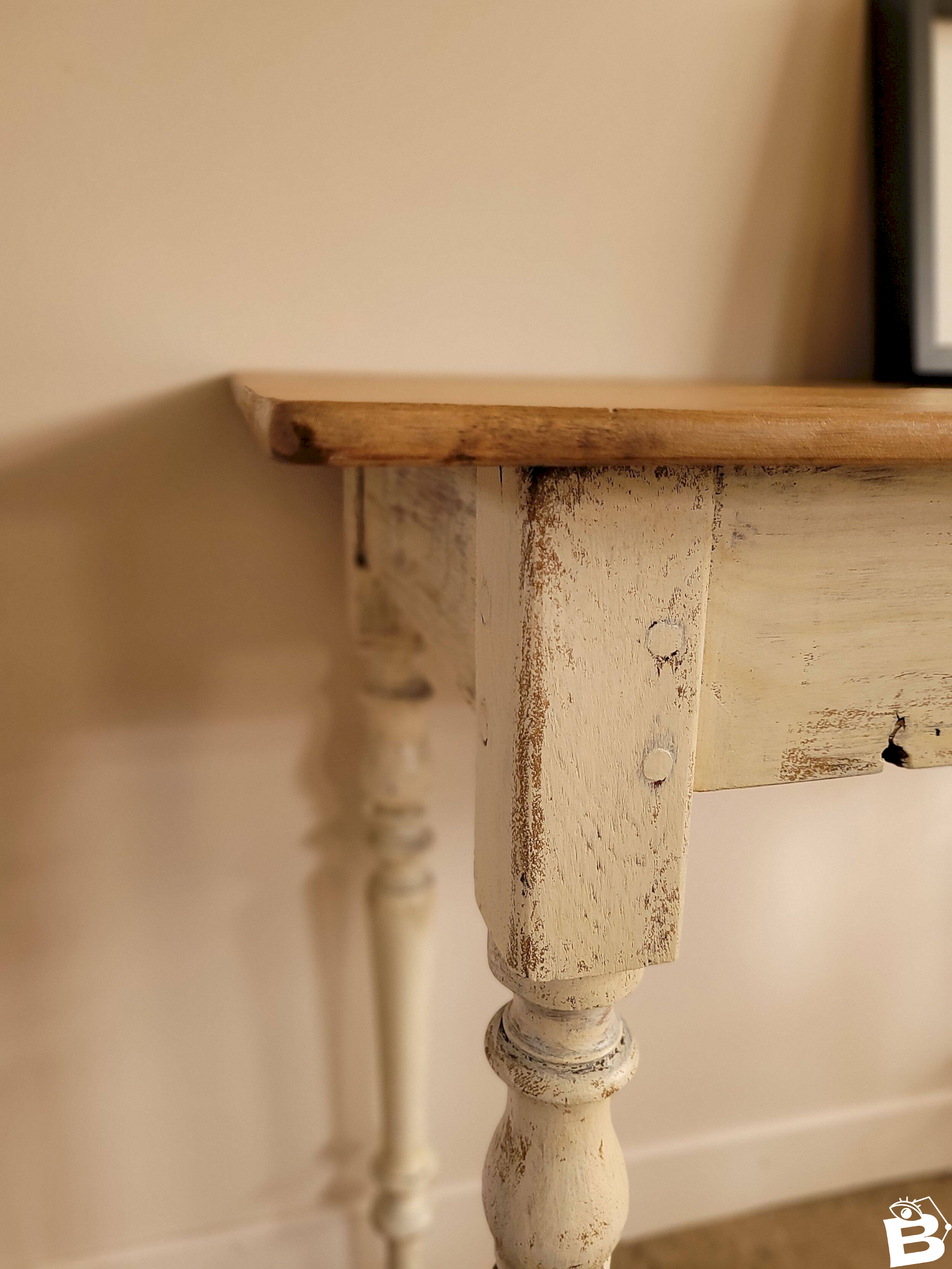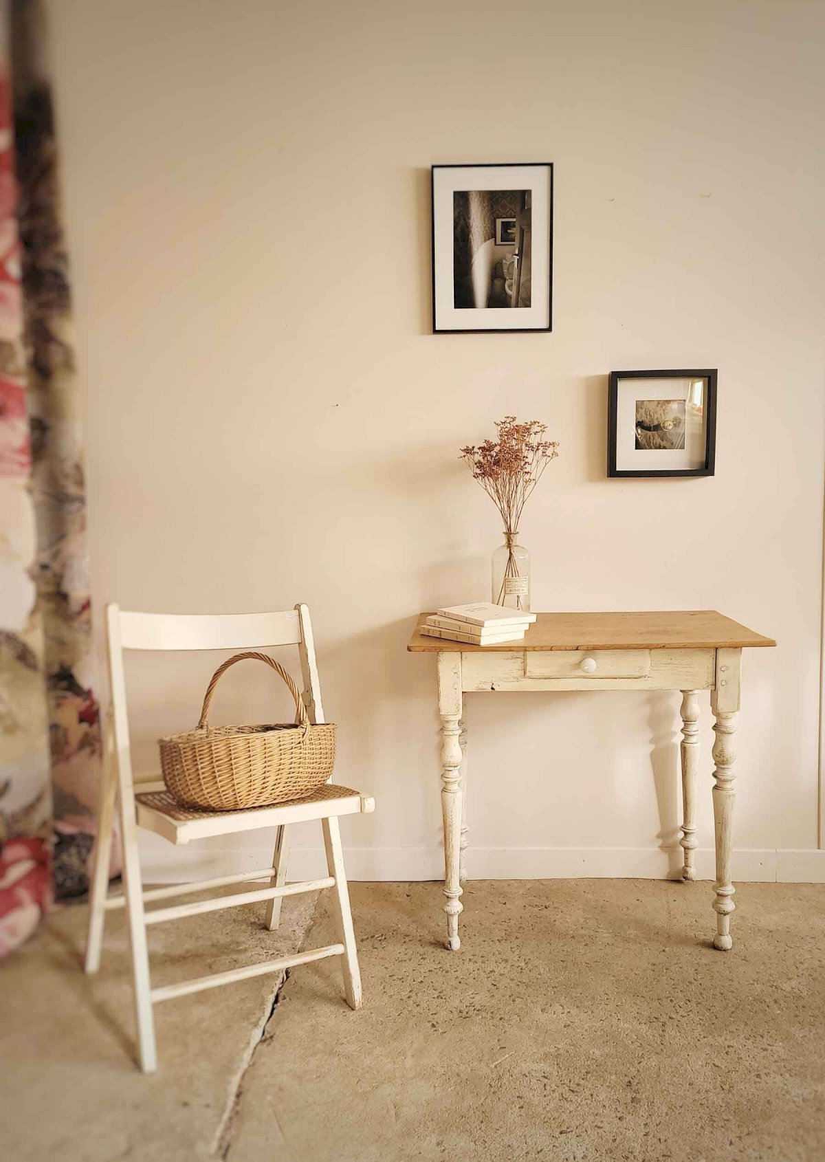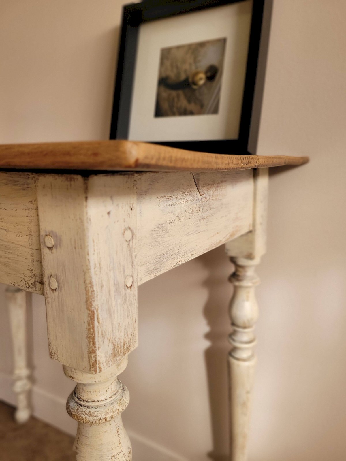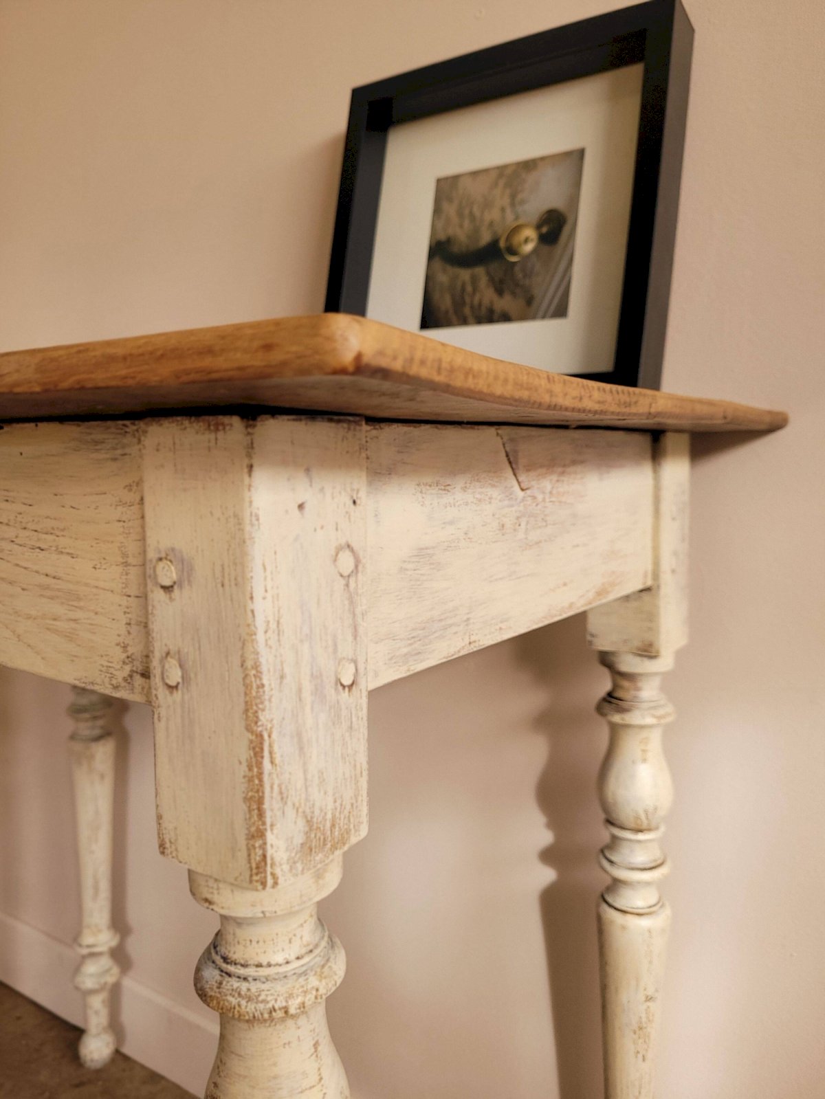 We love its patina, its turned wooden legs, its rustic style, its incredible charm! As a desk or a small side table in an entryway or kitchen, we can easily imagine it in a home! In good overall condition. Dimensions: 80 X 73 X 49 cm (W X H X D). W: 80 D: 49 H: 73