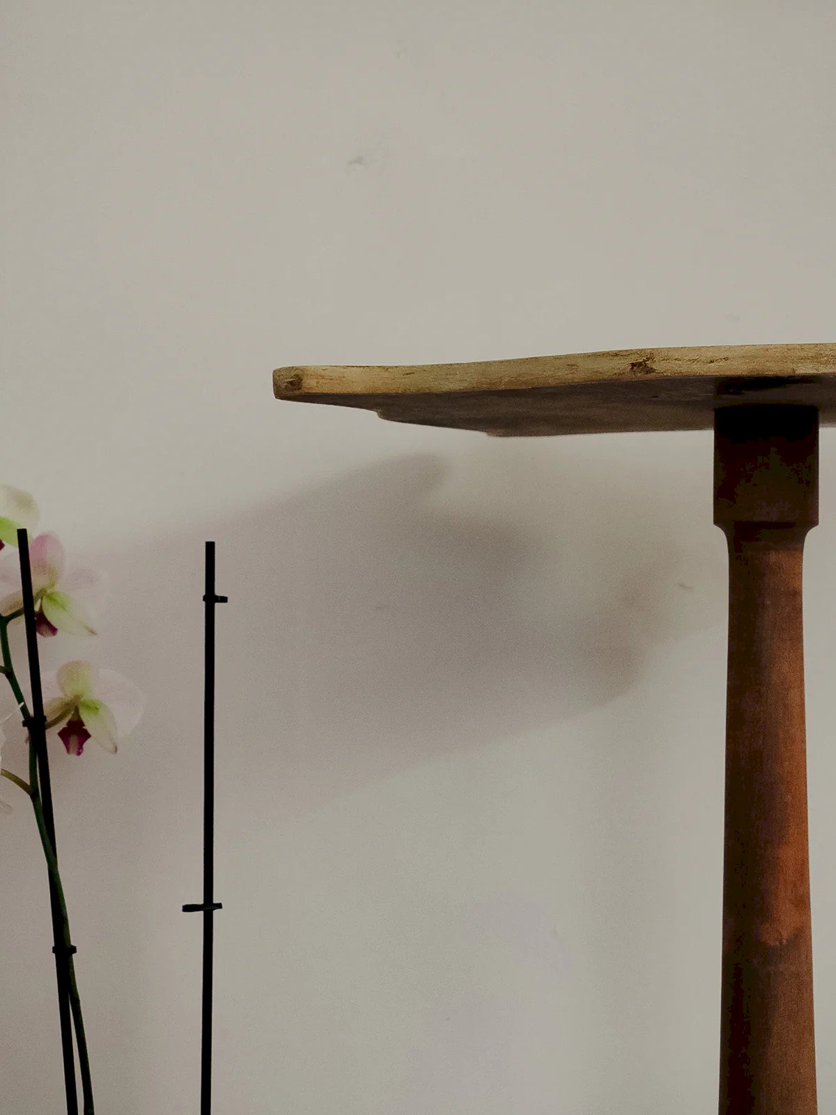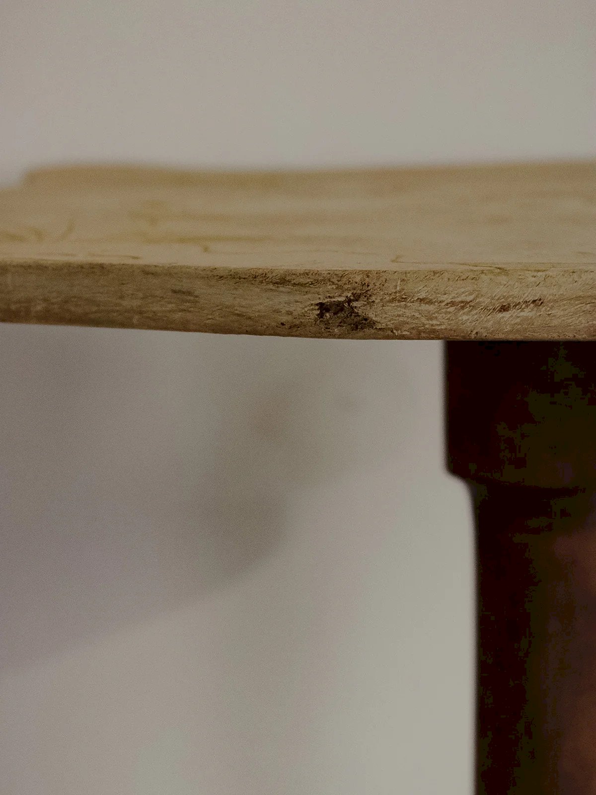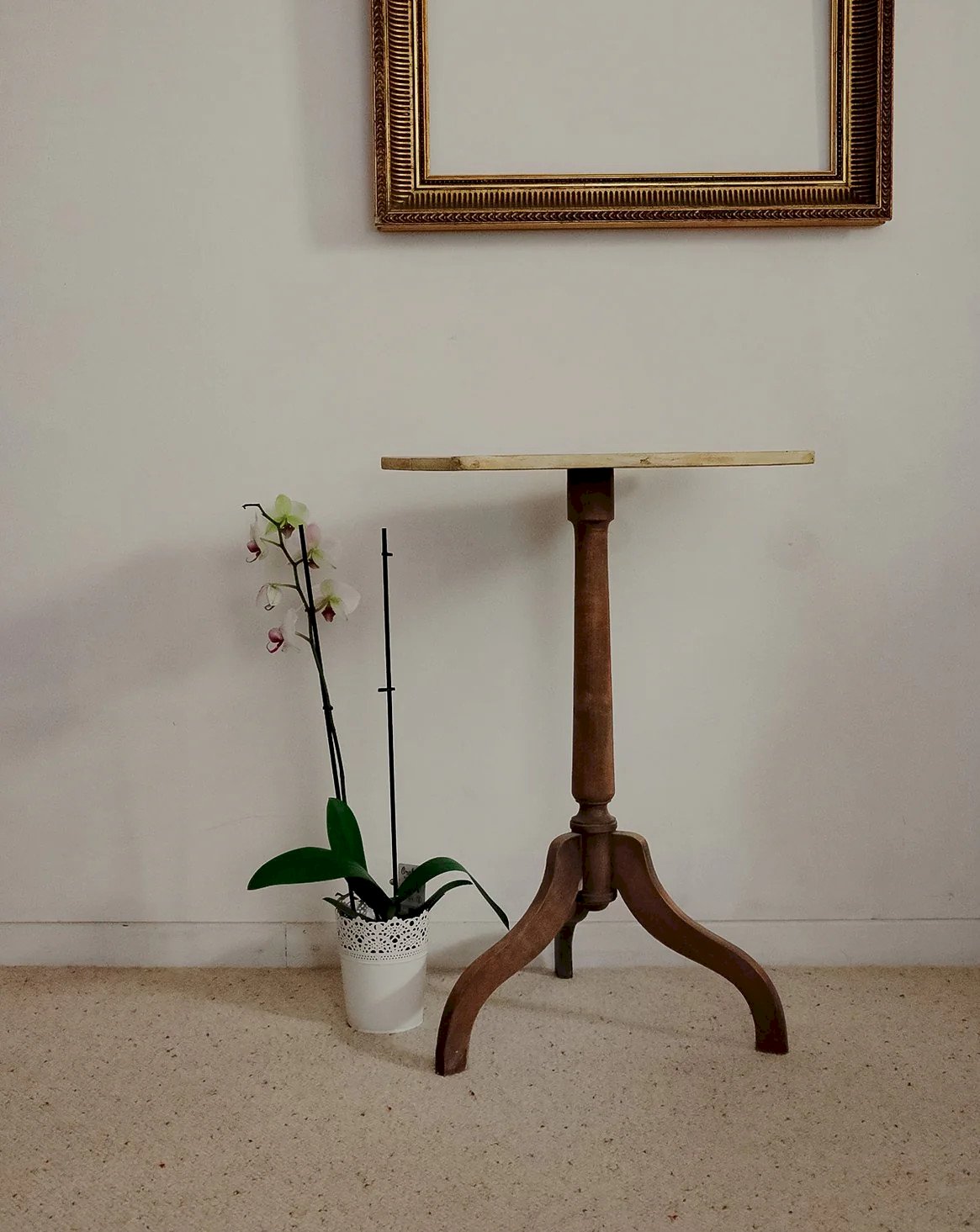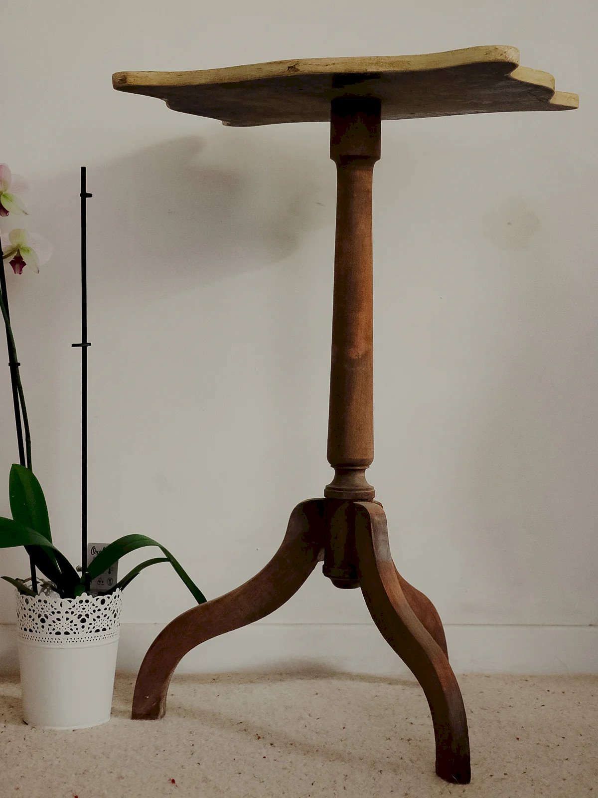 Discover this solid cherry wood side table with a delicate character, where the natural wood foot interacts with a repainted top adorned with a golden engraved motif. Its compact silhouette and slender proportions make it an ideal bedside table for holding a lamp, a vase, or a tea tray, subtly enhancing the entryway, living room, or a bedroom. The combination of solid wood and decorative restoration creates a warm and refined atmosphere, both understated and full of charm. Length: 44 cm Width: 33 cm Height: 71 cm Condition: Used: An item that has been used. The item shows some superficial signs of wear, ... Used: An item that has been used. The item shows some superficial signs of wear, fully operational and functioning correctly. It may be a display model or an item returned to the store after a short period of use. any potential imperfections. Brand: Debongout Type: Vintage product Material: Cherry wood Custom: Side tables Style: Country
