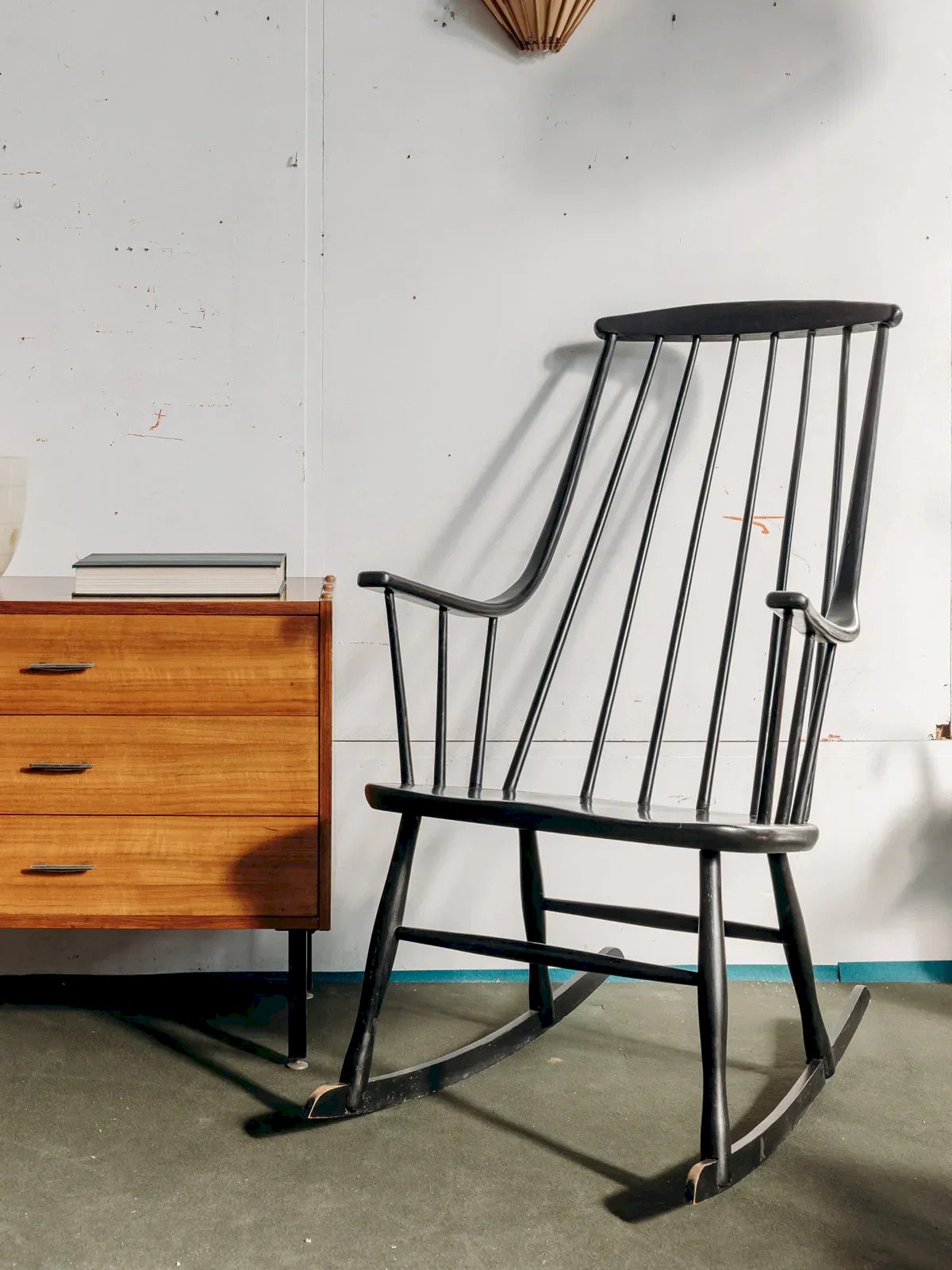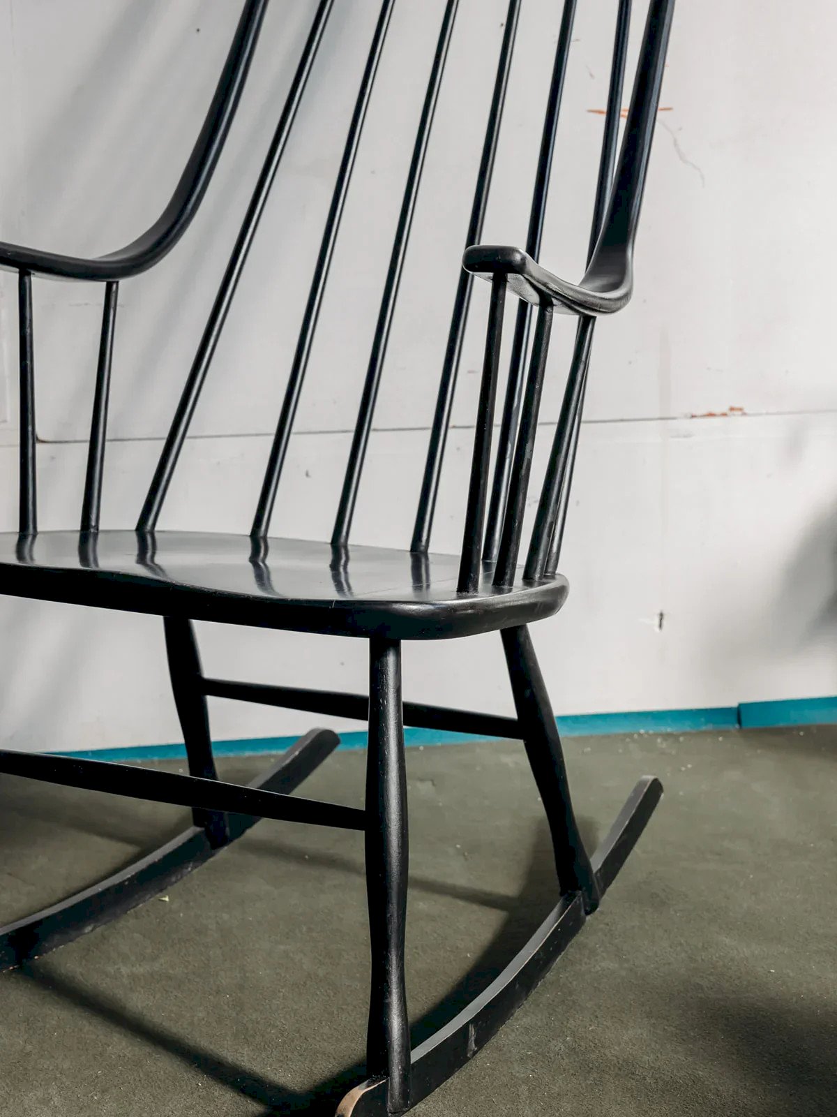 Offer yourself an iconic piece of Scandinavian design with this Grandessa black rocking chair, designed by Lena Larsson for Nesto. Made of beech in the 1960s, this chair features curved armrests that combine comfort and aesthetics. Its Mid-Century style, imbued with an authentic patina, reflects its history and vintage charm. Although there are a few signs of wear, they in no way detract from the elegance of this unique furniture piece. A true must-have for lovers of exceptional designs. Length: 57 cm Width: 84 cm Height: 111 cm Seat height: 41 cm A brief history of the rocking chair The rocking chair made its appearance in English families in the 18th century. It reflects the new way of living in society that seeks more comfort and frivolity in their daily lives. The family-run Thonet factory took hold of the model to reinvent the rocking chair using the steam-bent wood technique. The rocking chair caused a sensation in Europe and was imported to the United States, where it became a staple of the American Empire style. Its gentle rocking motion is perfect for letting your thoughts drift away with a good cup of tea! Condition: Used: An item that has been used. The item shows some superficial signs of wear... Used: An item that has been used. The item shows some superficial signs of wear, fully operational and functioning correctly. It may be a demonstration model or an item returned to the store after a short period of use. Any imperfections. Color: Multicolor Height: Beech, Wood Width: Rocking chair Brand: Debongout Type: Thrifted product Material: Beech, Wood Style: Country.