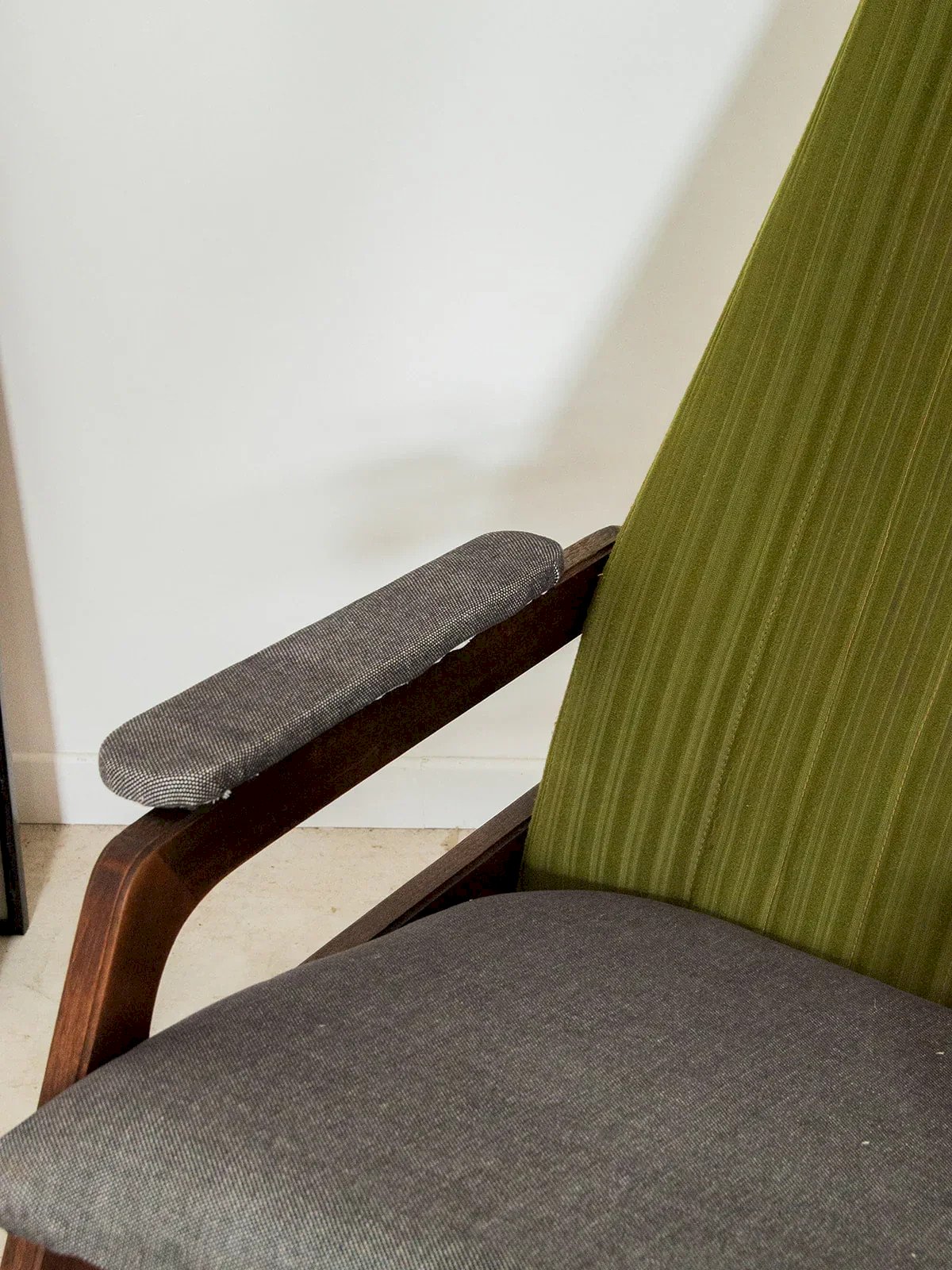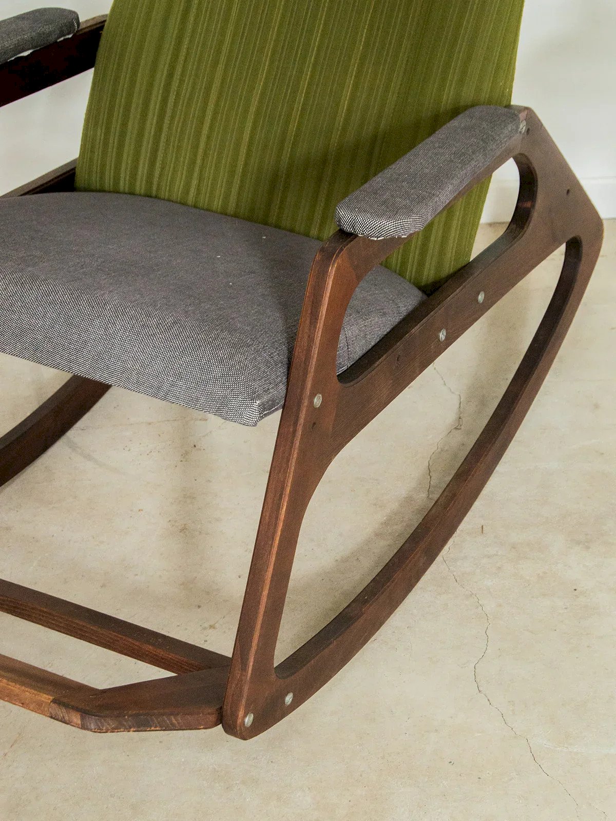 This dark wood rocking chair stands out as a centerpiece in your home, combining comfort and elegance. Its green and gray fabric adds a modern touch while harmoniously blending with different decor styles. Perfect for relaxing with a book or rocking through your moments of tenderness, this rocking chair is a must-have to create a warm and inviting atmosphere in your home. Enjoy the subtle marriage between wood and contemporary shades, which invites serenity and relaxation. Web exclusive, the meeting will take place at your home! Length: 52 cm Height: 108 cm Seat height: 51 cm Seat depth: 48 cm A little history of the rocking chair: It was in the 18th century that the rocking chair made its appearance in English families. It reflects the new way of life of a society aspiring to more comfort and frivolity in their daily lives. The family-owned Thonet factory seized the model to reinvent the rocking chair using the technique of bent wood shaped by steam. The rocking chair gained popularity in Europe and was imported to the United States, where it became essential to the American Empire style. Its gentle swaying is perfect for letting your dreams wander with a good cup of tea! Condition: Used: Item that has been used. Item showing some signs of superficial wear, fully operational and functioning correctly. It may be a demonstration model or an item returned to the store after a short period of use. potential imperfections. Color: Multicolor Height: Wood, Fabric Width: Rocking chair Brand: Debongout Type: Vintage product Material: Wood, Fabric Style: Country