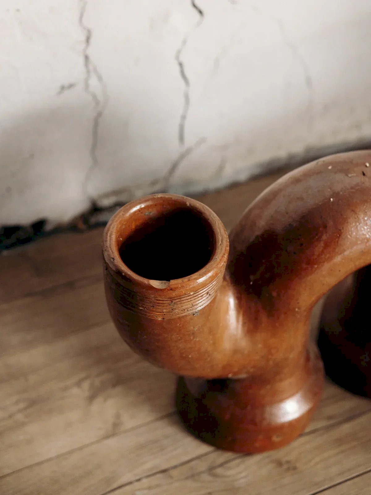 Discover this brown pipe-shaped ceramic, an object that is both original and elegant. Its meticulous finish and warm hue add a touch of charm to your interior decor. Whether as a centerpiece on a shelf or as a decorative element on the floor, this ceramic piece will capture all eyes. Perfect for contemporary design enthusiasts, it easily fits into various interior styles. Length: 50 cm Width: 15 cm Height: 45 cm Condition: Used: Item that has been used. Item showing some signs of superficial wear, fully operational and functioning correctly. It may be a demonstration model or a return to the store after a short period of use, with potential imperfections. Brand: Debongout Type: Thrifted product Material: Ceramic Style: Contemporary