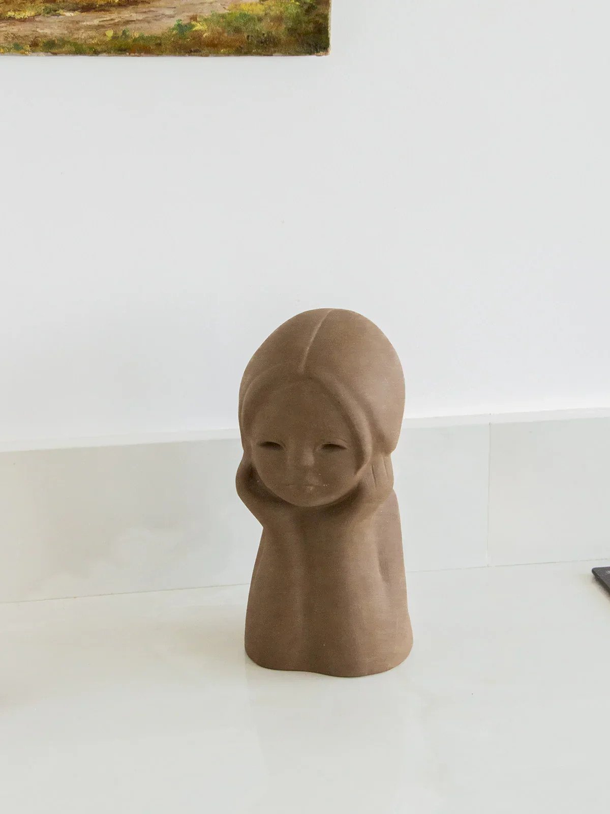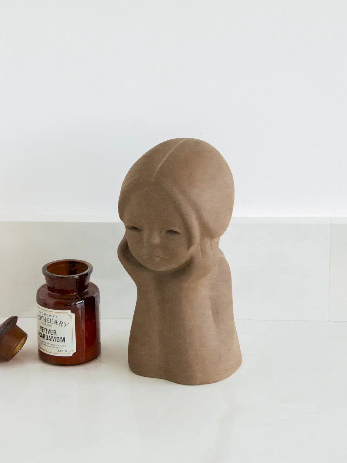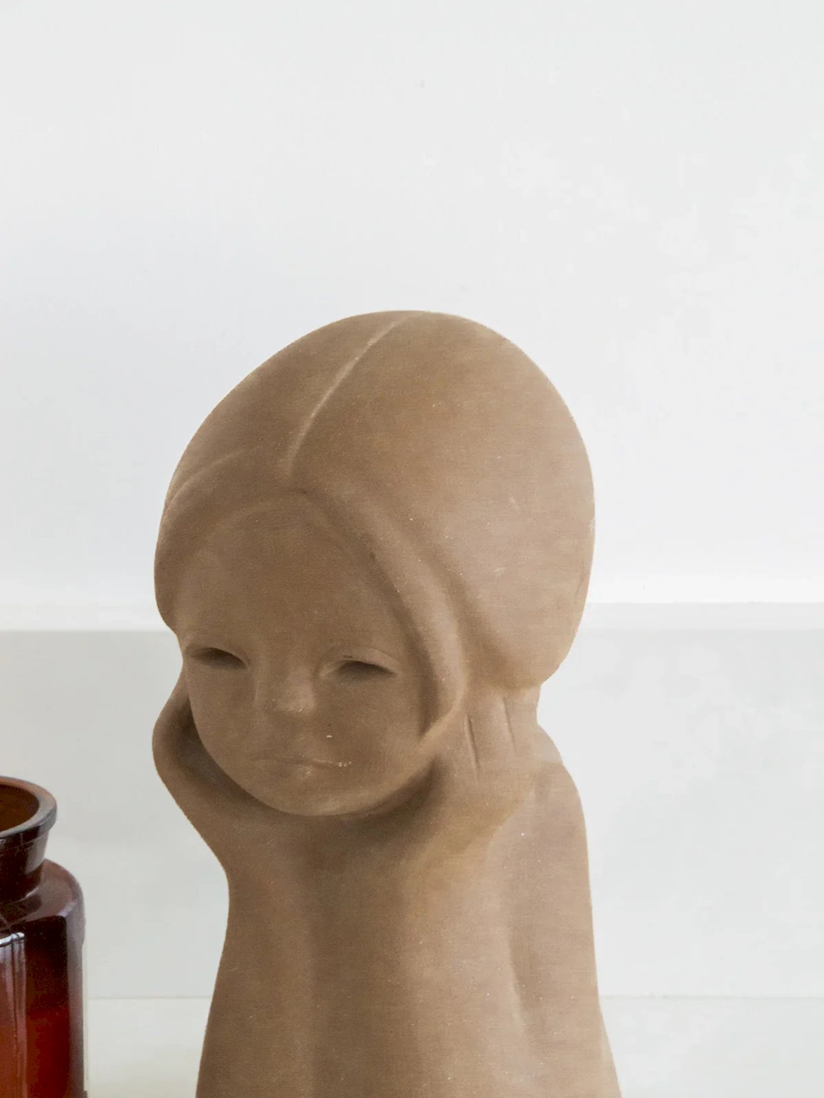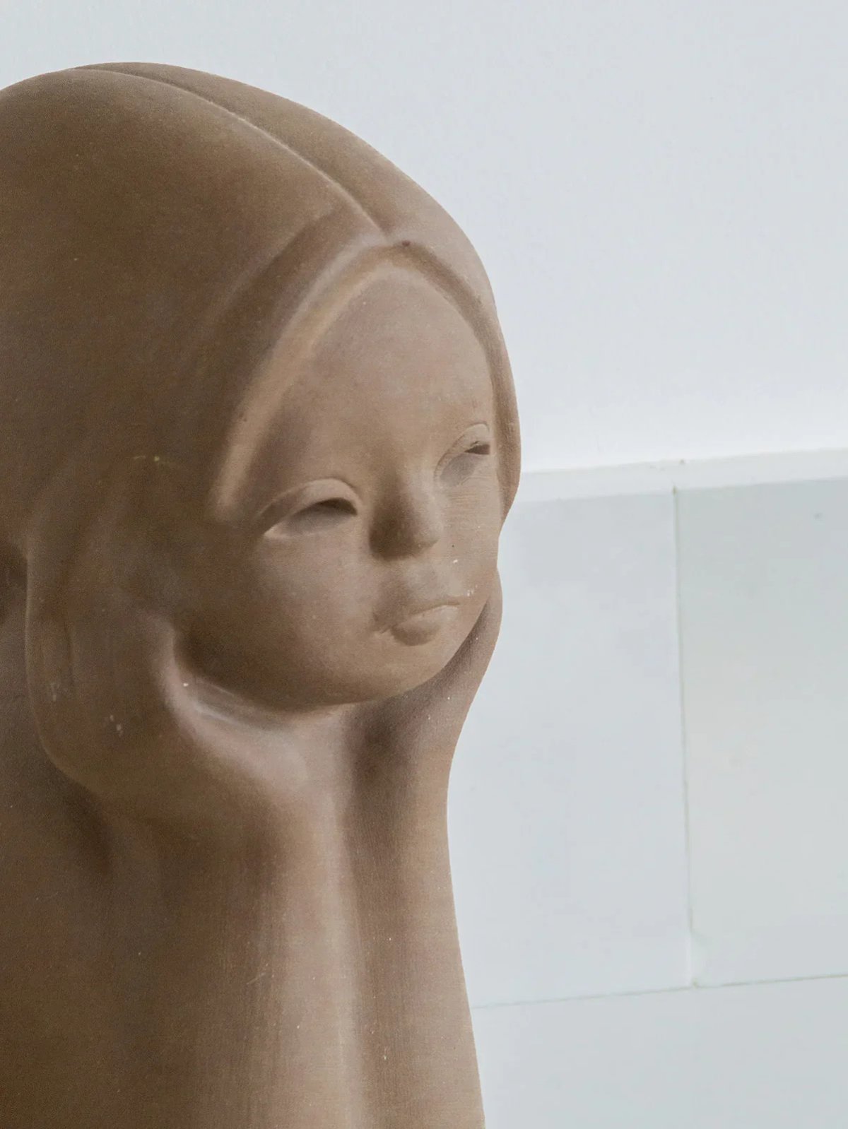 Discover this charming ceramic bust representing a young girl, her head delicately resting on her hands. The pretty braid skillfully sculpted at the back adds a touch of timeless elegance to this piece. Made in the 1960s in the USSR by the brand Tekt, this decorative ceramic object in a soft earth tone evokes a unique style that will enhance your interior. A piece that is both artistic and rich in history. Length: 24 cm Width: 14 cm Height: 13 cm Condition: Used: Item has been used. Item shows some superficial signs of wear, ...Used: Item has been used. Item shows some superficial signs of wear, fully operational and functioning correctly. It may be a demonstration model or an item returned to the store after a short period of use, including any potential imperfections. Brand: Debongout Type: Thrifted Product Material: Ceramic, Terracotta Style: Contemporary