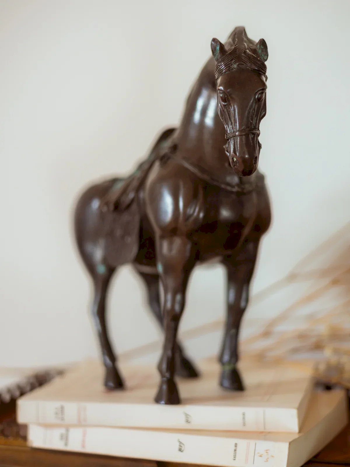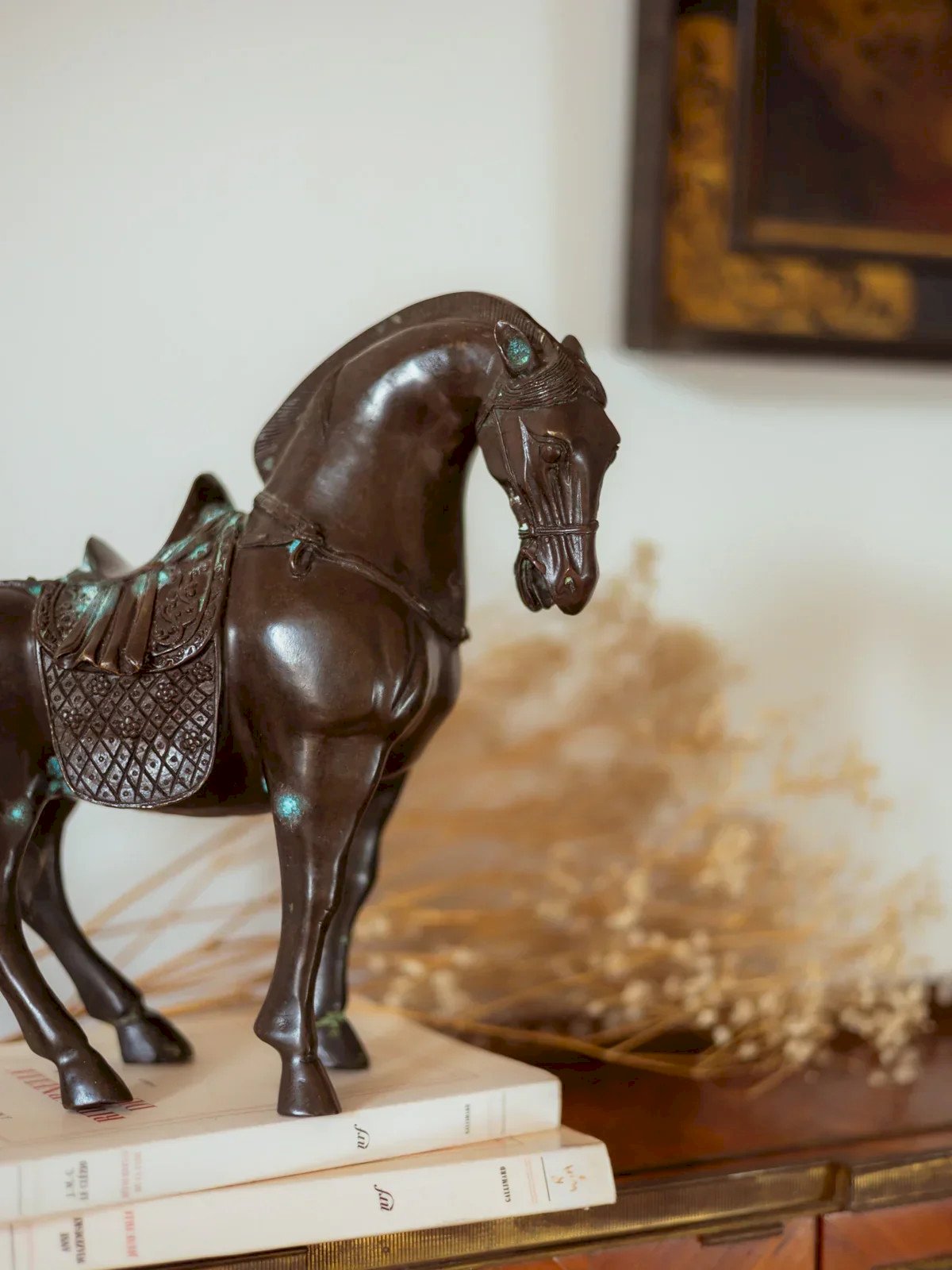 Invite a breath of elegance with this bronze horse, a figurative sculpture with lively lines and a warm patina. Its dense material and chiseled finish provide a sculptural presence, ideal for anchoring a living room, library, or office, where it will catch the eye without dominating the space. It combines a classic style with discreet modernity and creates a soft, contemplative atmosphere conducive to the refined decoration of polished interiors. Decorative object. Length: 30 cm Width: 11.5 cm Height: 26 cm Condition: Used: Item that has been used. Item showing some superficial signs of wear, ... Used: Item that has been used. Item showing some superficial signs of wear, fully operational and functioning correctly. It may be a demonstration model or an item returned to the store after a short period of use. the possible imperfections. Brand: Debongout Type: Curated product Material: Bronze Style: Contemporary