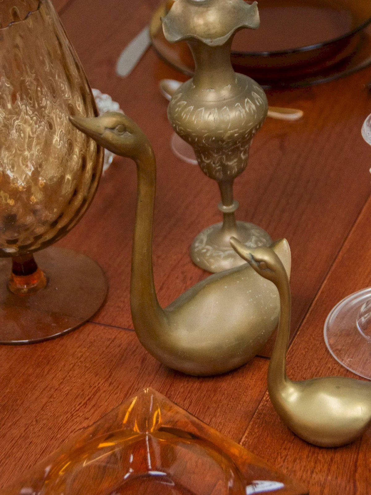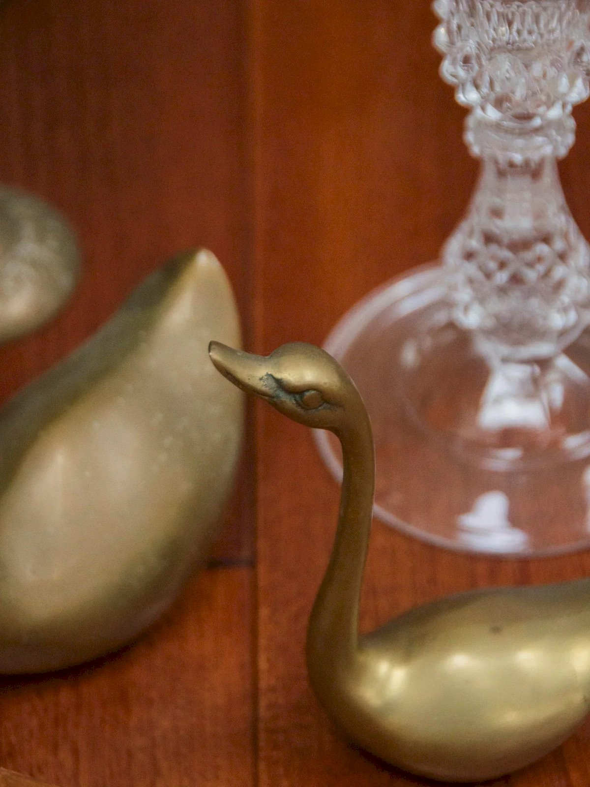 Invite a touch of elegance with this pair of golden brass swans, presented in a small/large duo. The polished brass captures the light and highlights their stylized lines, providing a subtle and refined accent. Placed together on a console, a bookshelf, or a coffee table, they create a balanced display and play with scale contrast to structure the space. A versatile decorative accessory, they infuse a warm and contemplative atmosphere into your interior. Large swan: Length: 6 cm Width: 12 cm Height: 21 cm Small swan: Length: 8 cm Width: 5 cm Height: 14 cm Condition: Used: Item has been used. Item shows some superficial signs of wear... Used: Item has been used. Item shows some superficial signs of wear, fully operational and functioning correctly. It may be a demonstration model or an item returned to the store after a short period of use, including any imperfections. Brand: Debongout Type: Vintage product Material: Brass Style: Contemporary