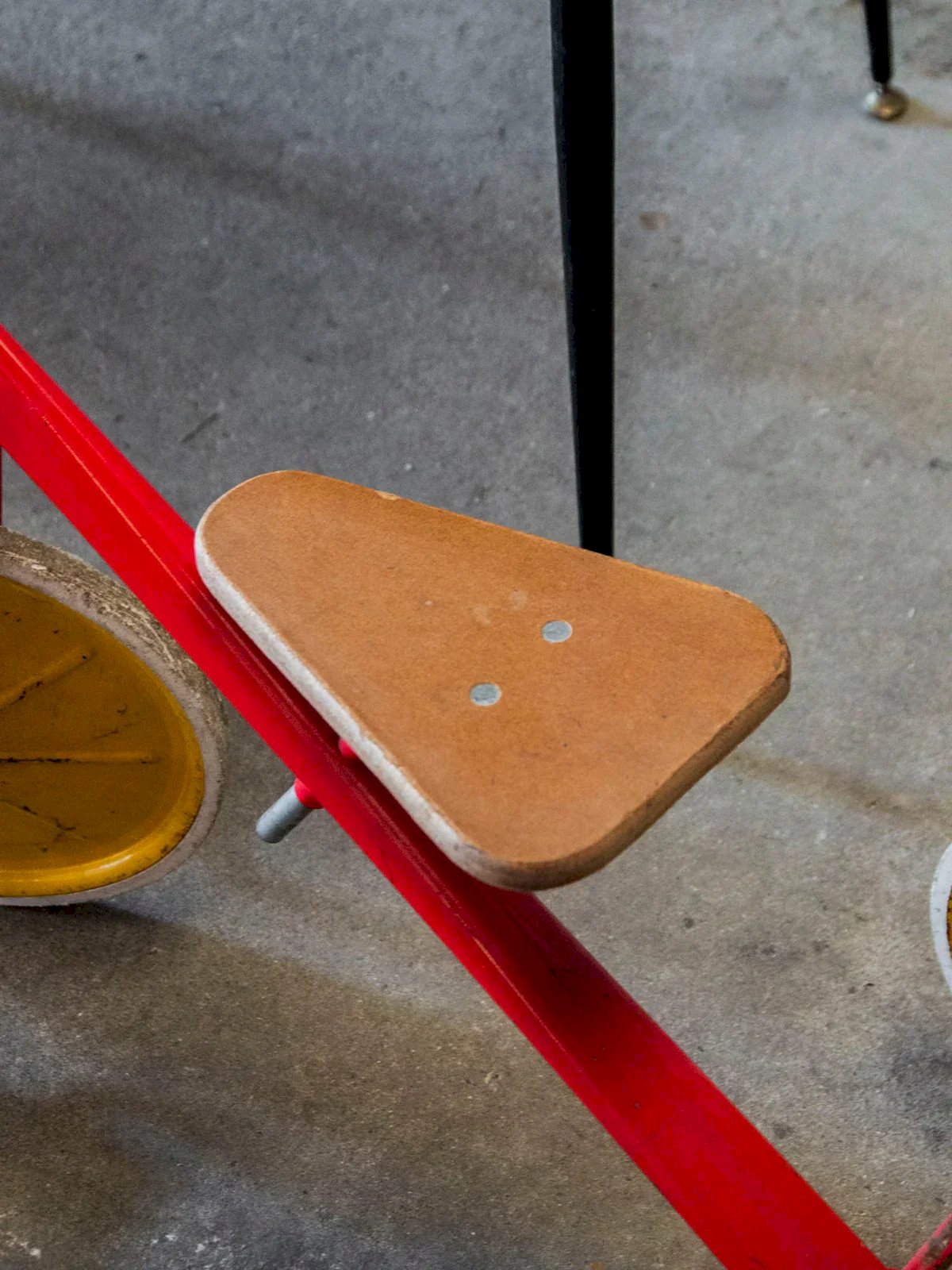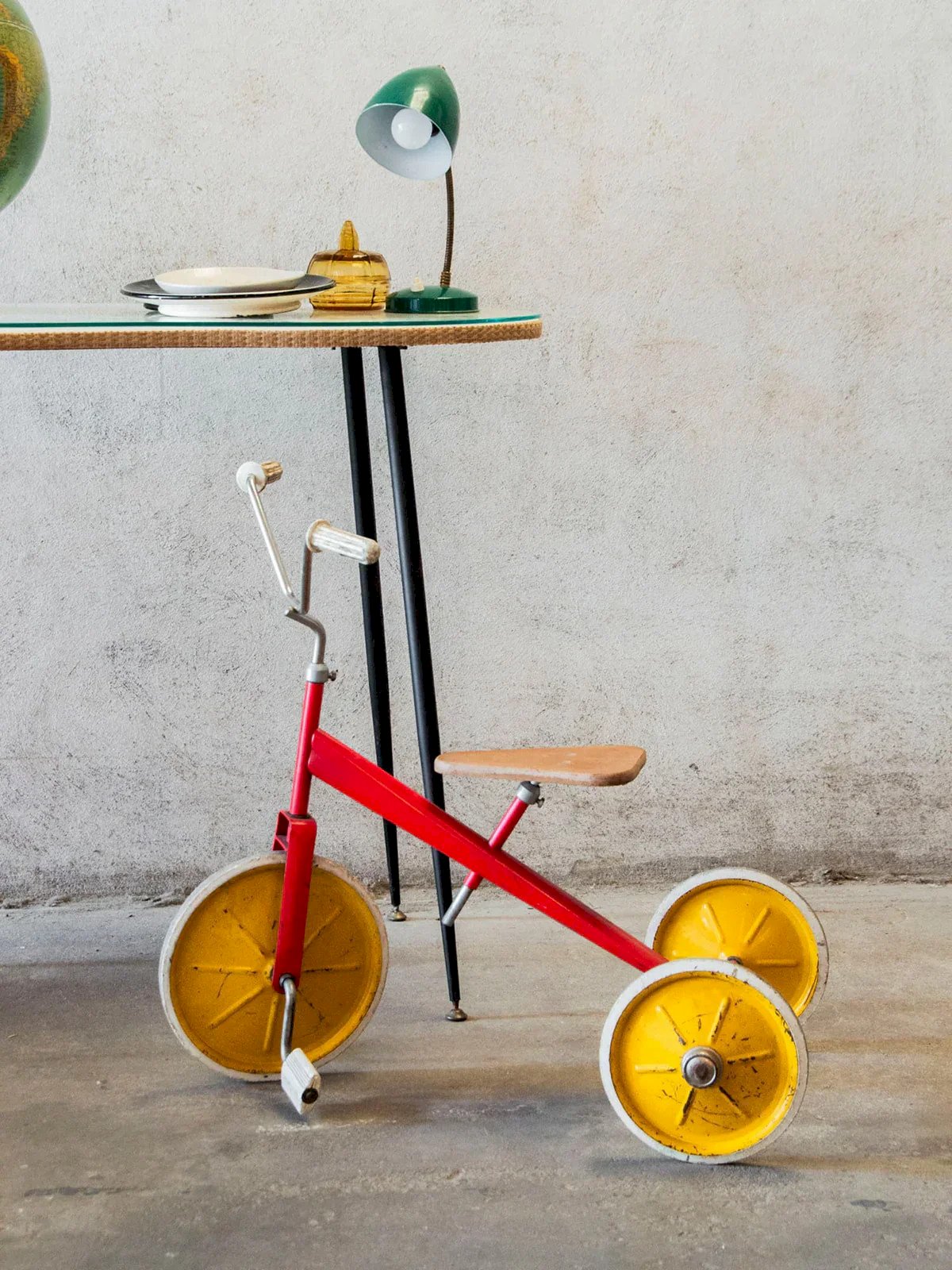 Discover the charming Wisa Gloria 1970 children’s tricycle, a piece that is both playful and decorative. With its retro design in bright yellow and red colors, this metal tricycle adds a touch of originality to a child’s room. It will also appeal to collectors and vintage decor enthusiasts. An object that elegantly combines style and functionality! Vintage item, decorative, it does not meet current safety standards. Length: 75 cm Width: 40 cm Height: 61 cm Seat height: 36 cm Condition: Used item. Item shows some superficial wear, fully operational and working correctly. It may be a demonstration model or a returned item after a short period of use. any imperfections. Brand: Debongout Type: Thrifted product Material: Metal, Wood Style: Contemporary