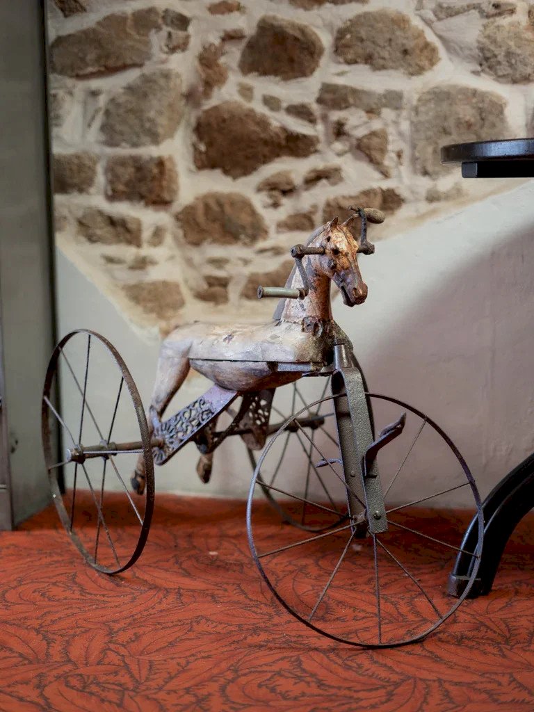 Dive into the bygone era with this vintage wooden tricycle, beautifully illustrating the charm of the 19th century. Featuring metal wheels, this children's toy showcases an authentic patina and traces of time that give it a unique character. A true collector's piece, it will appeal to enthusiasts of antique objects in search of authenticity and nostalgia. Bring a breath of history to your interior with this charming tricycle. Length: 93 cm Width: 48 cm Height: 66 cm Condition: Used: Item that has been used. Item showing some superficial signs of wear, fully operational and functioning correctly. It may be a demonstration model or an item returned to the store after a short period of use. Possible imperfections. Brand: Debongout Type: Thrifted Product Material: Wood, Metal Style: Contemporary