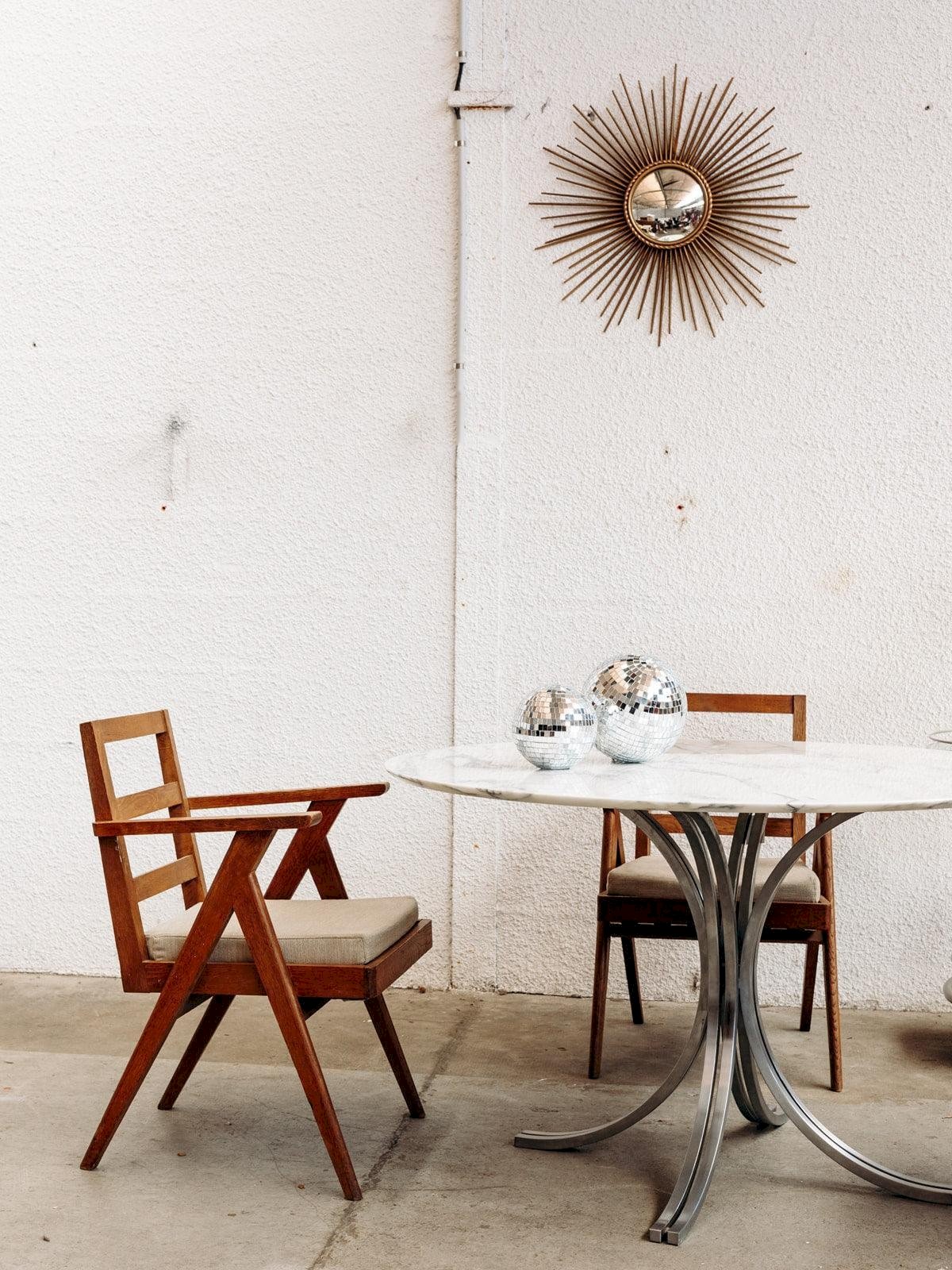 These wooden chairs with splayed legs, inspired by the Jeanneret style, have captivated us with their simple and refined elegance. Their sleek design fits perfectly in both a contemporary or minimalist decor as well as in a retro setting. Whether around a table, in a bedroom, or in front of a desk, they will be perfect for your home! Price per unit. Length: 49 cm Width: 48 cm Height: 80 cm Seat height: 39.5 cm Condition: Used: Item has been used. Item shows some signs of superficial wear... Used: Item has been used. Item presents some signs of superficial wear, fully operational and functioning correctly. It may be a display model or an item returned to the store after a short period of use. Possible imperfections. Color: Multicolor Height: Wood, Fabric Width: Chairs Brand: Debongout Type: Vintage product Material: Wood, Fabric Style: Contemporary