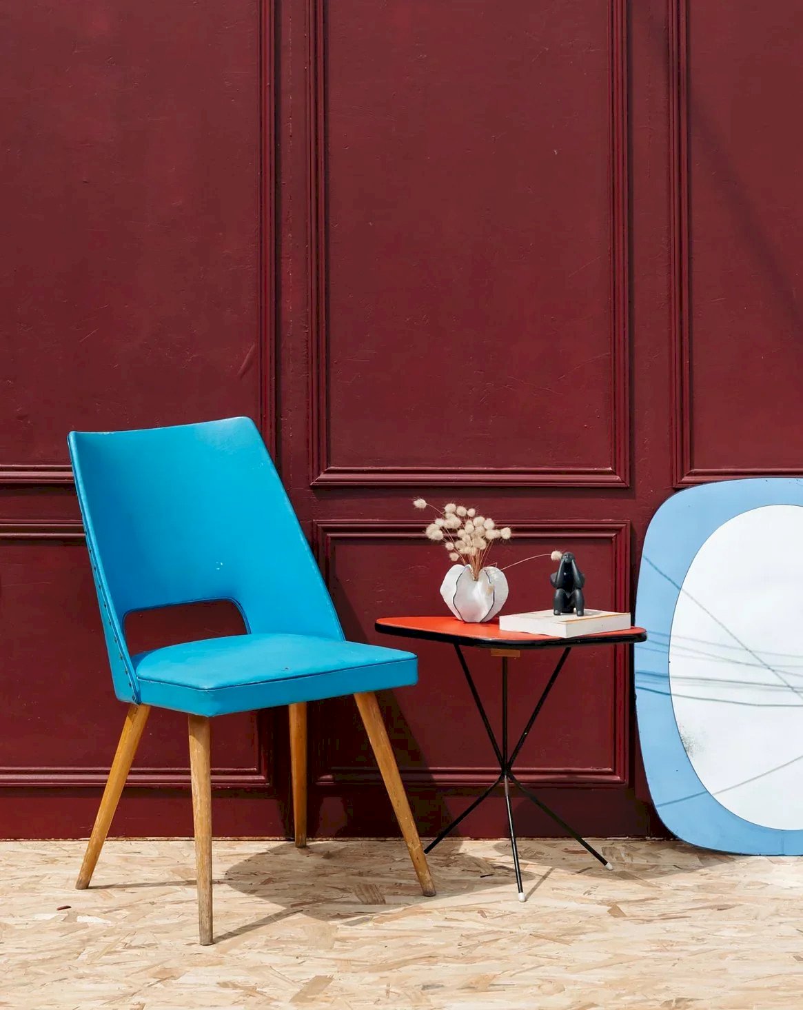 Bring a touch of Scandinavian style to your home with this blue faux leather chair with wooden compass legs. Its clean design and airy lines fit perfectly into a modern or vintage living room. Although it shows some signs of wear, its authentic charm and sturdiness make it both a practical and aesthetic piece of furniture. Ideal for a reading nook or around a table, this chair will appeal to decoration enthusiasts. Length: 43 cm Width: 48 cm Height: 80 cm Seat height: 41 cm Seat depth: 44 cm Condition: Used: Item has been used. Item shows some superficial signs of wear, fully operational and functioning correctly. It may be a demonstration model or an item returned to the store after a short period of use. Possible imperfections. Color: Multicolor Height: Faux leather, Wood Width: Chairs Brand: Debongout Type: Thrifted product Material: Faux leather, Wood Style: Contemporary