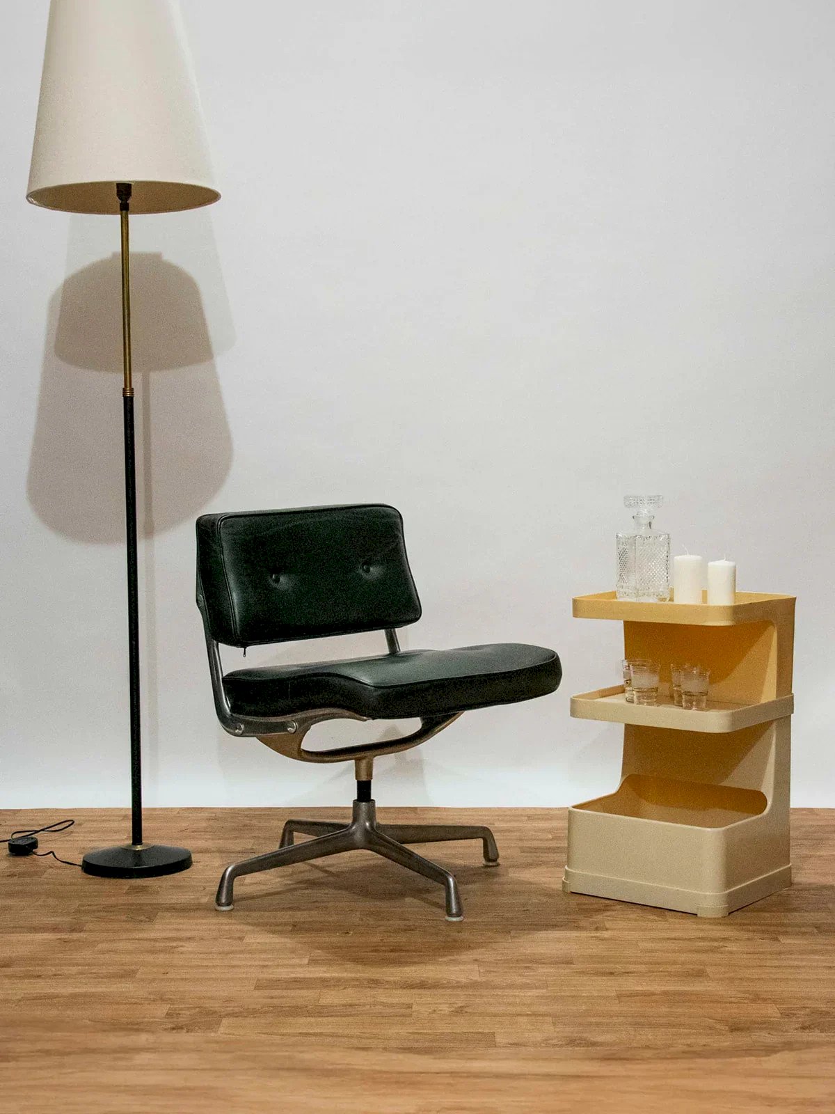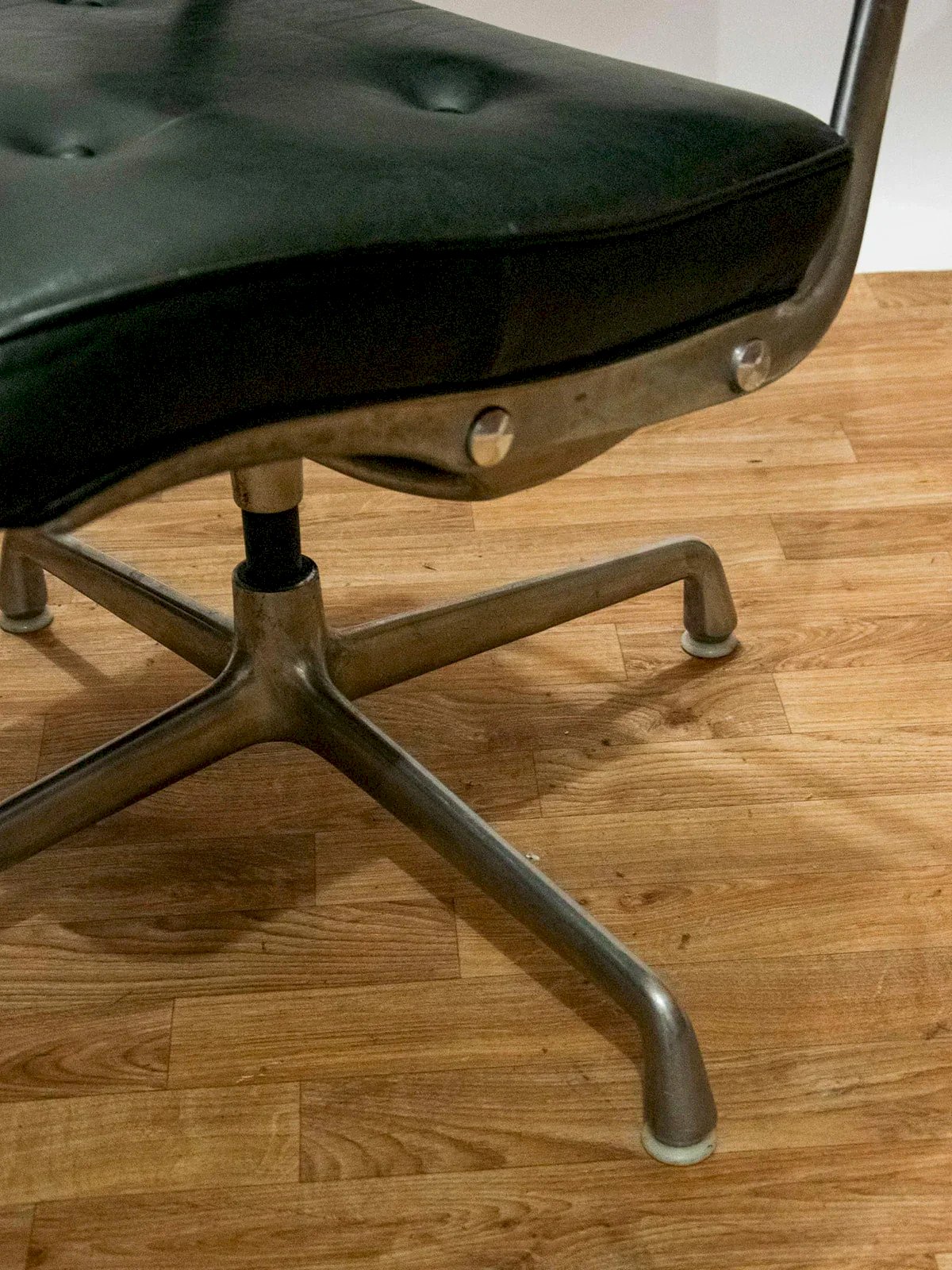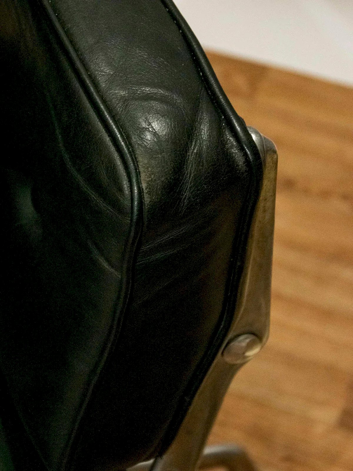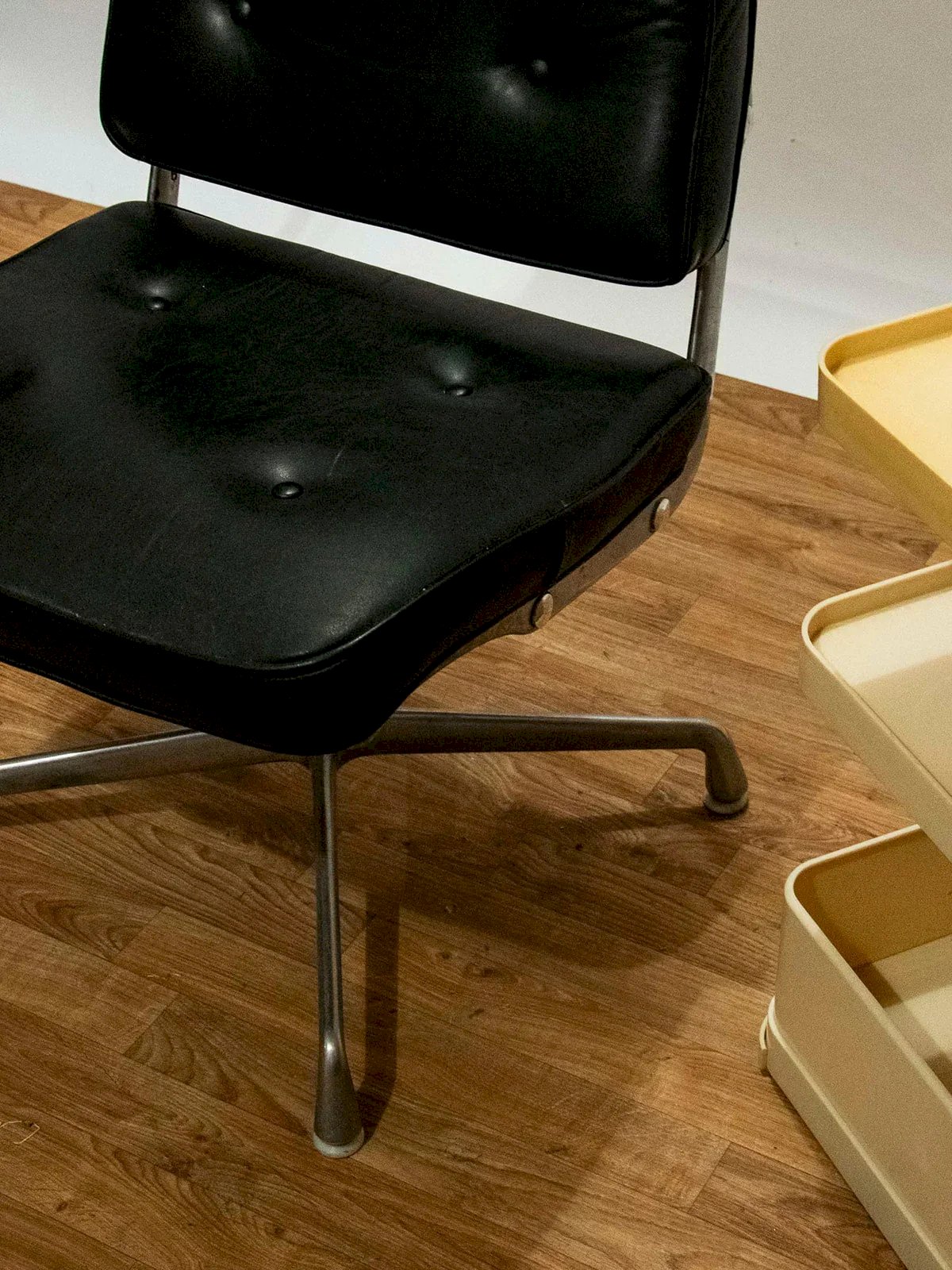 Discover the charming Intermediate Chair in black leather, inspired by the iconic Eames design. This elegant chair, which swivels, combines contemporary style with optimal comfort. With its sturdy metal base and high-quality black leather upholstery, it seamlessly integrates into any interior. Sold individually, three quantities are available. It is perfect for adding a touch of elegance to your living or working space. Width: 55 cm Height: 79 cm Seat height: 48 cm Depth: 56 cm Condition: Used: Item has been used. Item shows some superficial signs of wear... Used: Item has been used. Item shows some superficial signs of wear, fully operational and functioning correctly. It may be a display model or a returned item after a short period of use. any possible imperfections. Color: Multicolor Height: Leather, Metal Width: Chairs Brand: Debongout Type: Vintage product Material: Leather, Metal Style: Contemporary