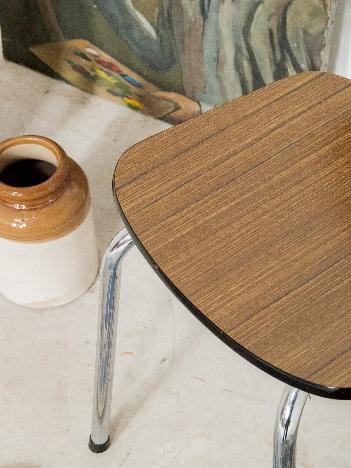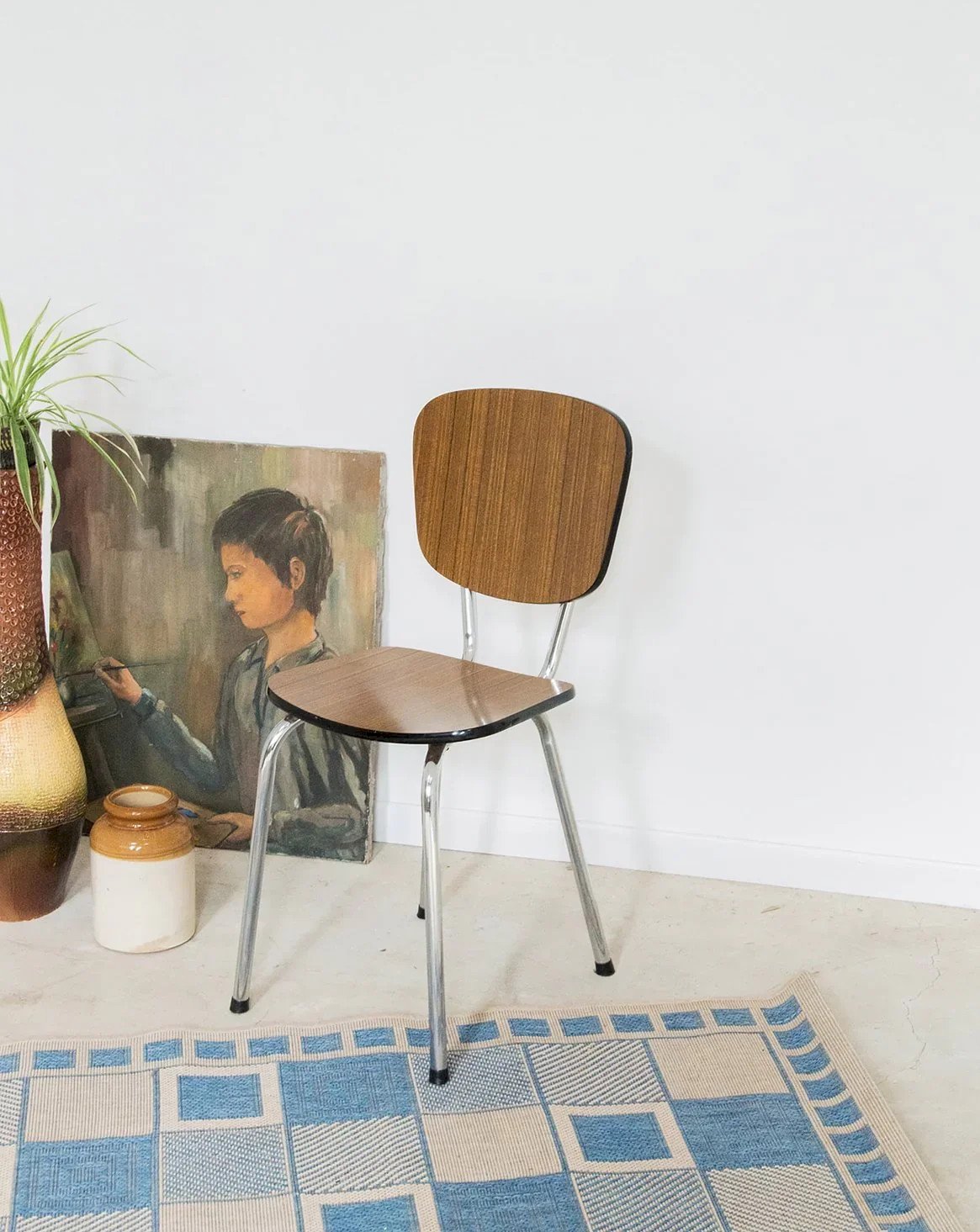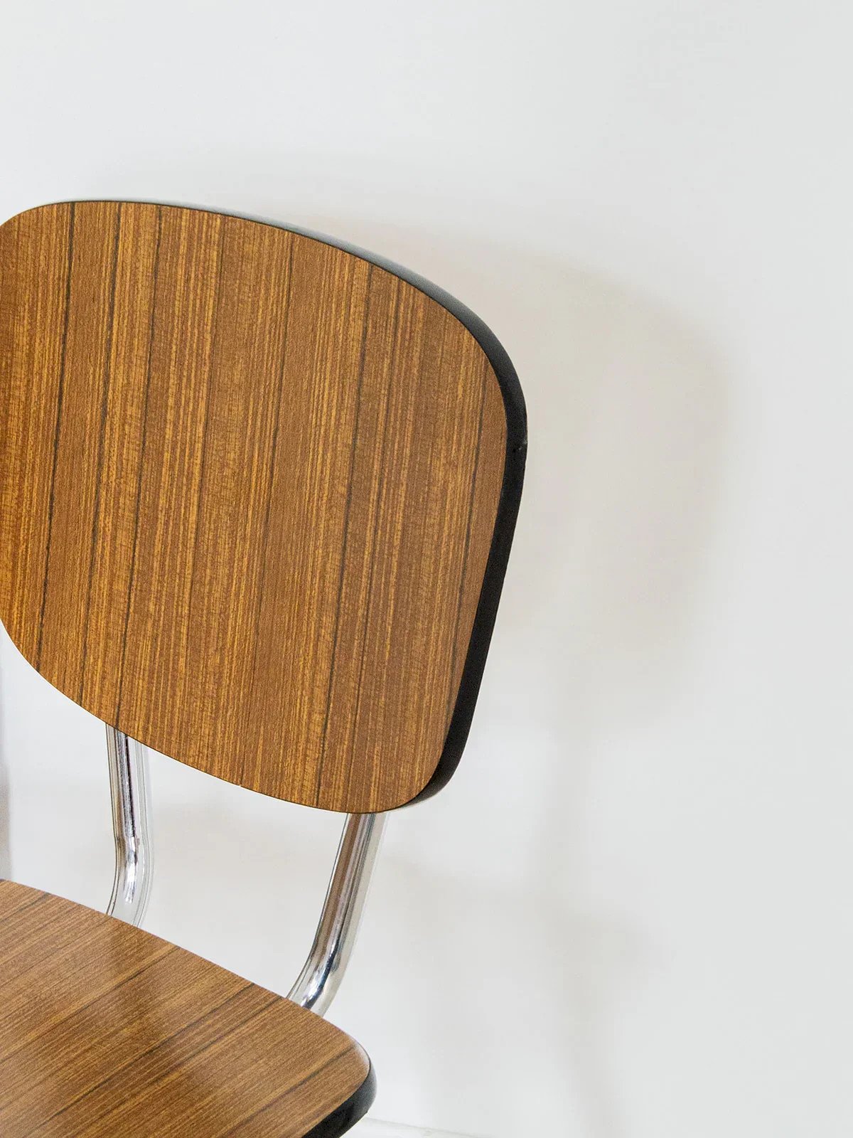 Add a retro touch to your interior with this brown formica chair featuring a high backrest. Crafted from sturdy metal, it combines comfort and elegance with its timeless vintage design. Perfect for the dining room or an office, this chair easily complements various decorating styles. Its comfortable seat and high back provide optimal support. Length: 37 cm Width: 33.5 cm Height: 81 cm Seat height: 46 cm Condition: Used: Item has been used. Item shows some signs of superficial wear... Used: Item has been used. Item shows some signs of superficial wear, fully operational and functioning properly. It may be a display model or an item returned to the store after a short period of use. any potential imperfections. Color: Multicolor Height: Formica, Metal Width: Chairs Brand: Debongout Type: Vintage product Material: Formica, Metal Style: Contemporary