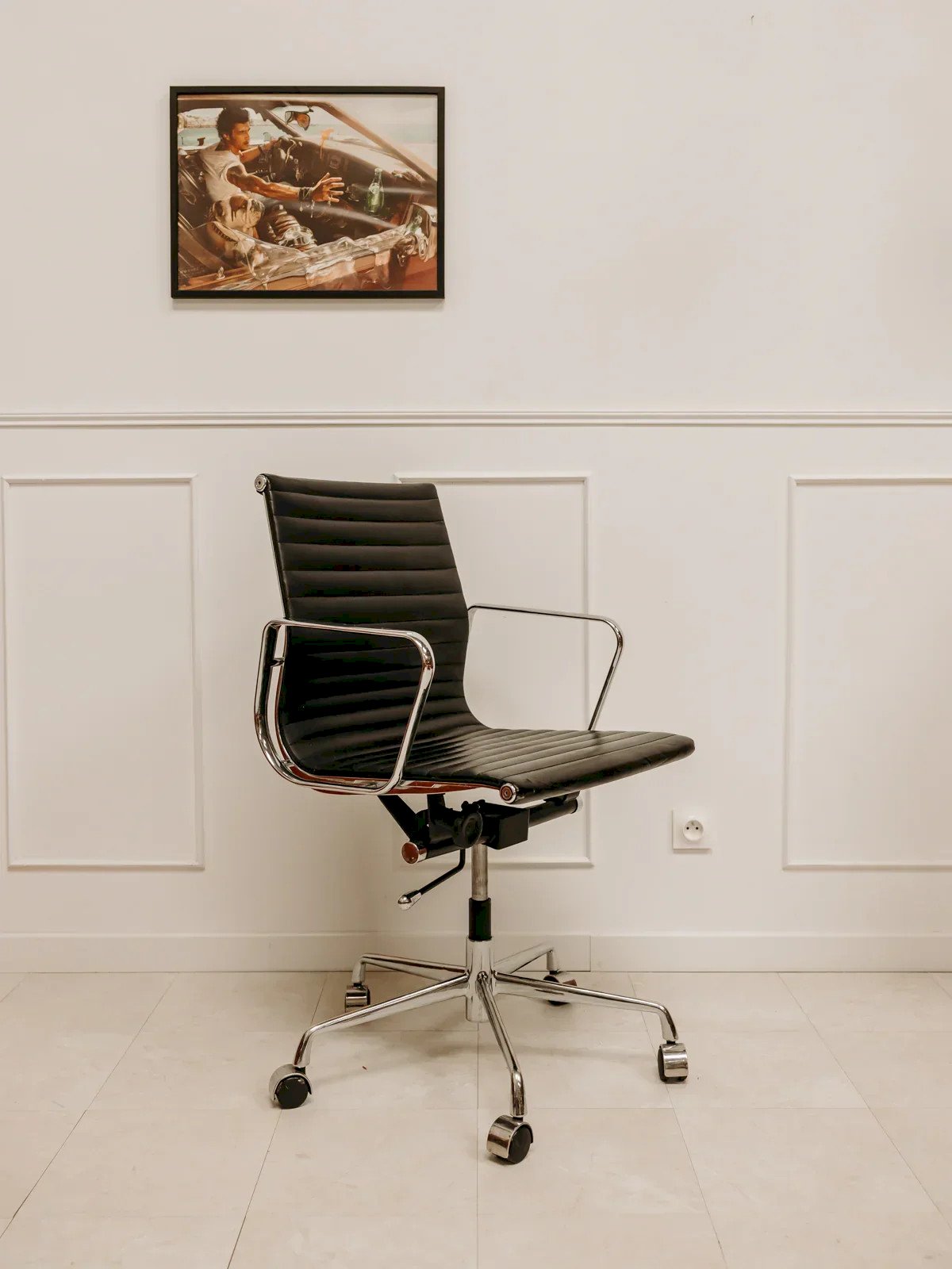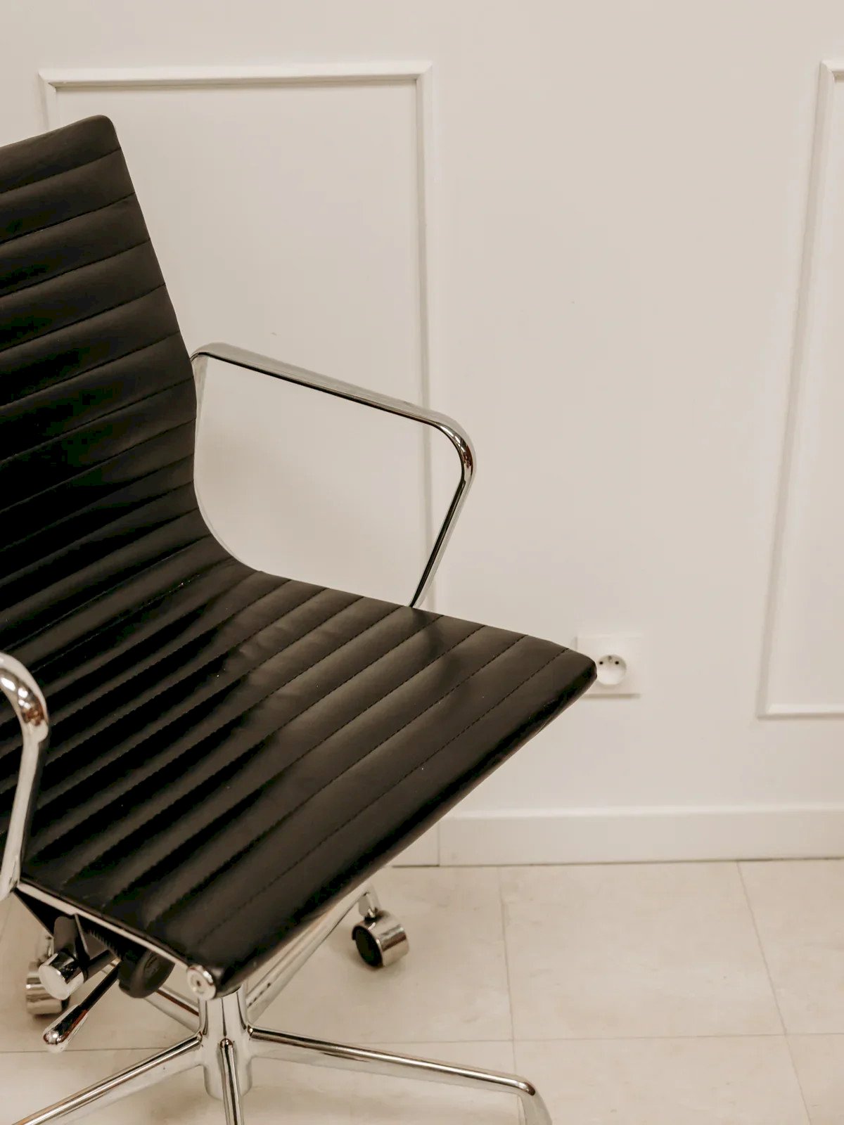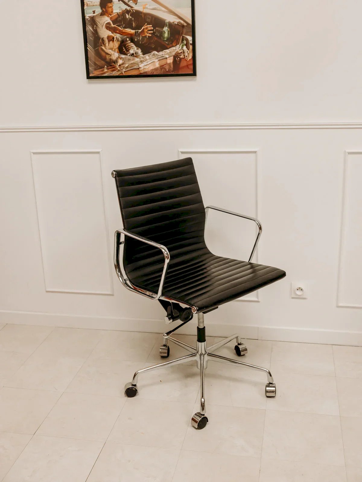 Adopt this faux leather office chair with modern lines and a comfortable seat, designed for a contemporary workspace. Its pleasant-to-the-touch faux leather upholstery and curved metal armrests bring a subtle elegance, while the wheeled base ensures mobility and stability. Height adjustable and compact in proportions, it easily slides under a desk or into a telecommuting corner. Ideal for daily work, it creates a studious and refined atmosphere in any interior. Width: 57 cm Depth: 57 cm Height: 99 cm Seat height: 55 cm Seat depth: 57 cm Seat width: 53 cm Condition: Used: Item has been used. Item shows some superficial wear marks, fully operational and functioning correctly. It may be a demonstration model or an item returned to the store after a short period of use, including any possible imperfections. Color: Multicolor Height: Faux Leather, Metal Width: Chairs Brand: Debongout Type: Vintage product Material: Faux Leather, Metal Style: Contemporary