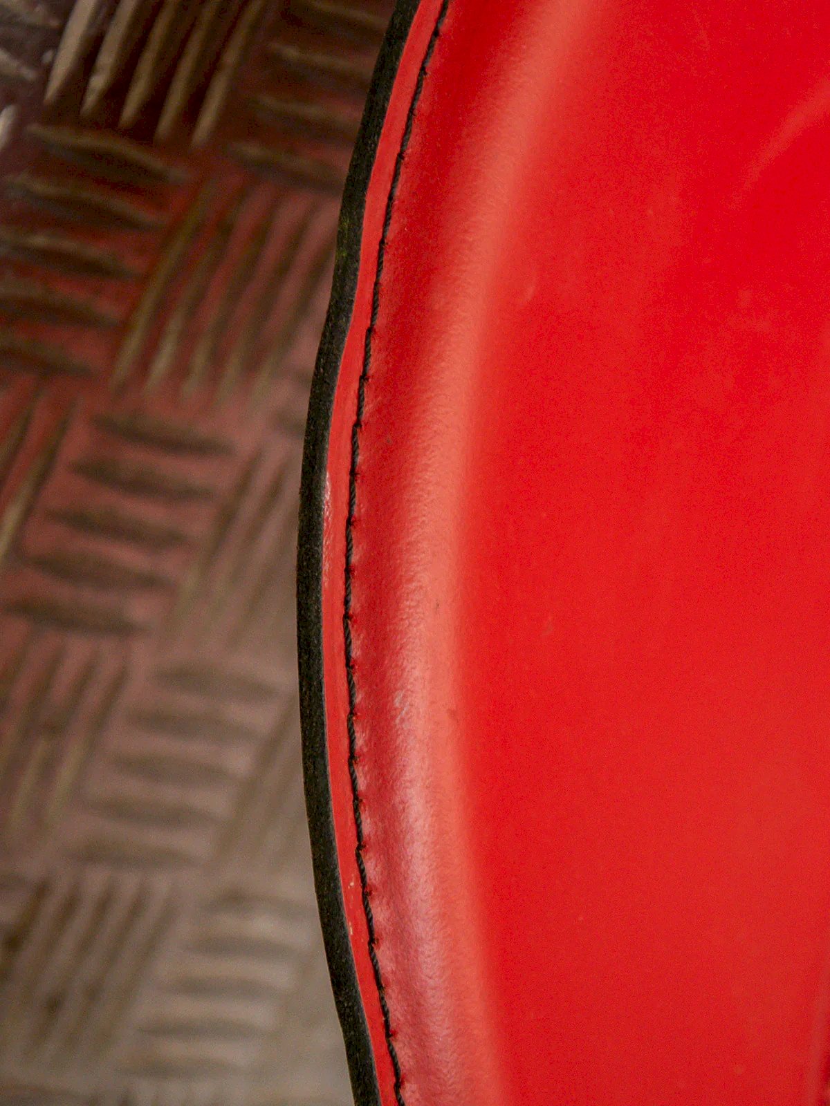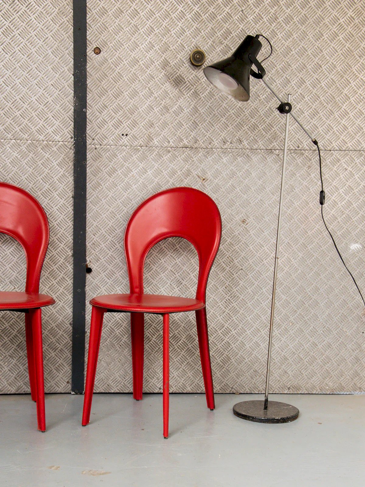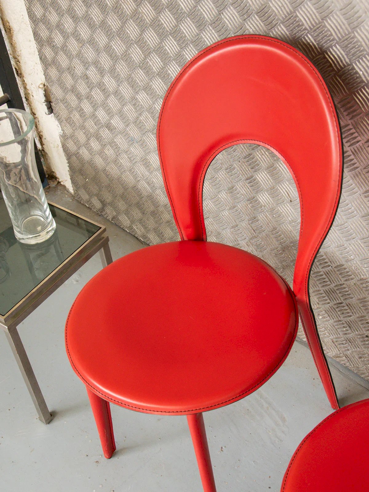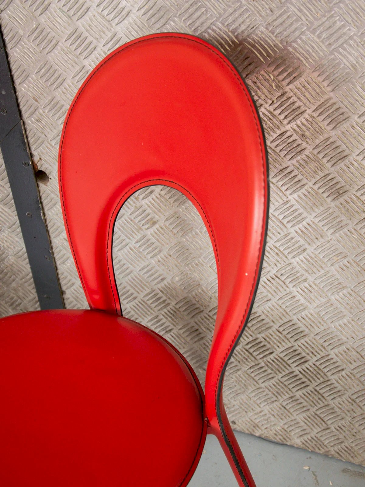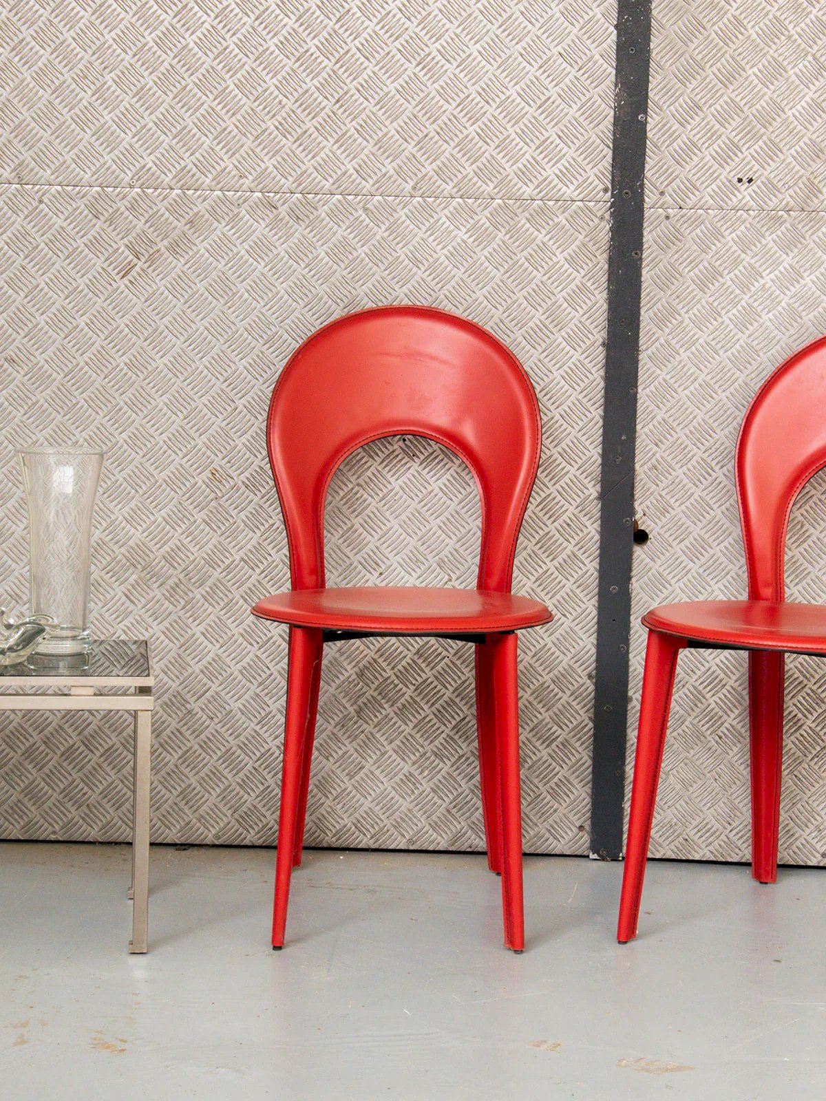 Add a touch of dynamism to your interior with this pair of red leather chairs. The seat, backrest, and leather legs are beautifully quilted with black, creating an elegant contrast. The black edges highlight the modern design of these chairs. The metal structure ensures strength and durability. Perfect for adding character to your space in an original way. Length: 42.5 cm Height: 86.5 cm Seat height: 46.5 cm Depth: 44 cm Condition: Used: Item has been used. Item shows some signs of superficial wear... Used: Item has been used. Item shows some signs of superficial wear, fully operational and functioning correctly. It may be a demonstration model or an item returned to the store after a short period of use. Any imperfections. Color: Multicolor Height: Leather, Metal Width: Chairs Brand: Debongout Type: Vintage product Material: Leather, Metal Style: Contemporary