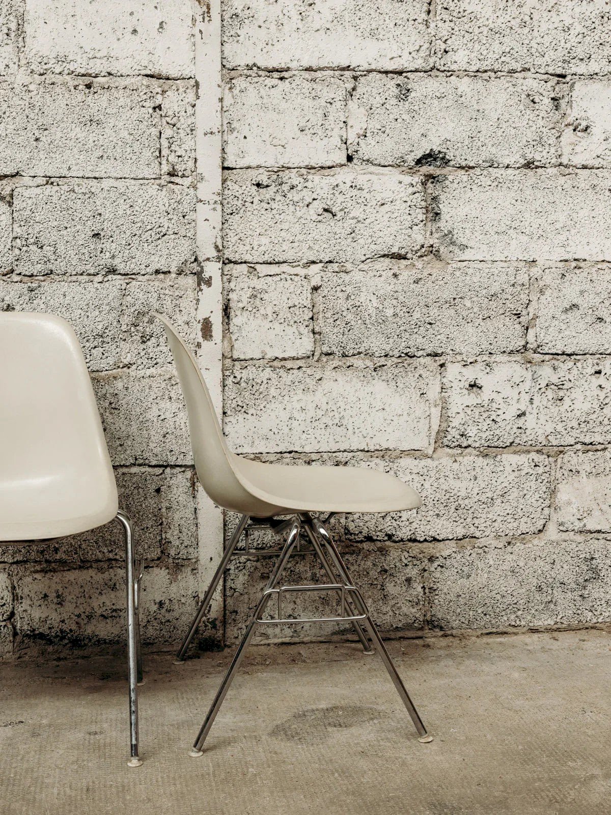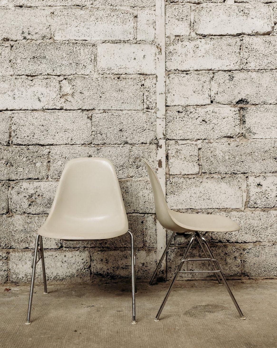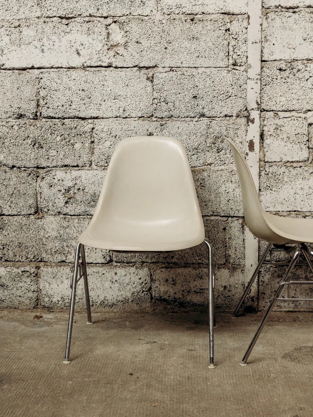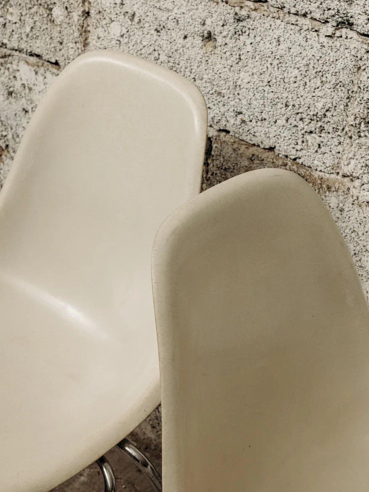 Discover this iconic chair from the 1960s, produced by Herman Miller and designed by the famous Eames designers. Its egg shell-colored fiberglass shell and chrome metal legs add a retro and modern touch to your interior. Some signs of time on the seat testify to its character and history. Practical, this chair is stackable for easy storage. A unique collector's item, combining design, comfort, and functionality, produced in Switzerland. Sold individually, 20 units are available. Length: 47 cm Width: 45 cm Height: 81 cm Seat height: 44 cm Condition: Used: Item that has been used. Item showing some signs of superficial wear, ...Used: Item that has been used. Item showing some signs of superficial wear, fully operational and functioning correctly. It may be a demonstration model or an item returned to the store after a short period of use due to any imperfections. Color: Multicolored Height: Fiberglass, Metal Width: Chairs Brand: Debongout Type: Vintage product Material: Fiberglass, Metal Style: Contemporary