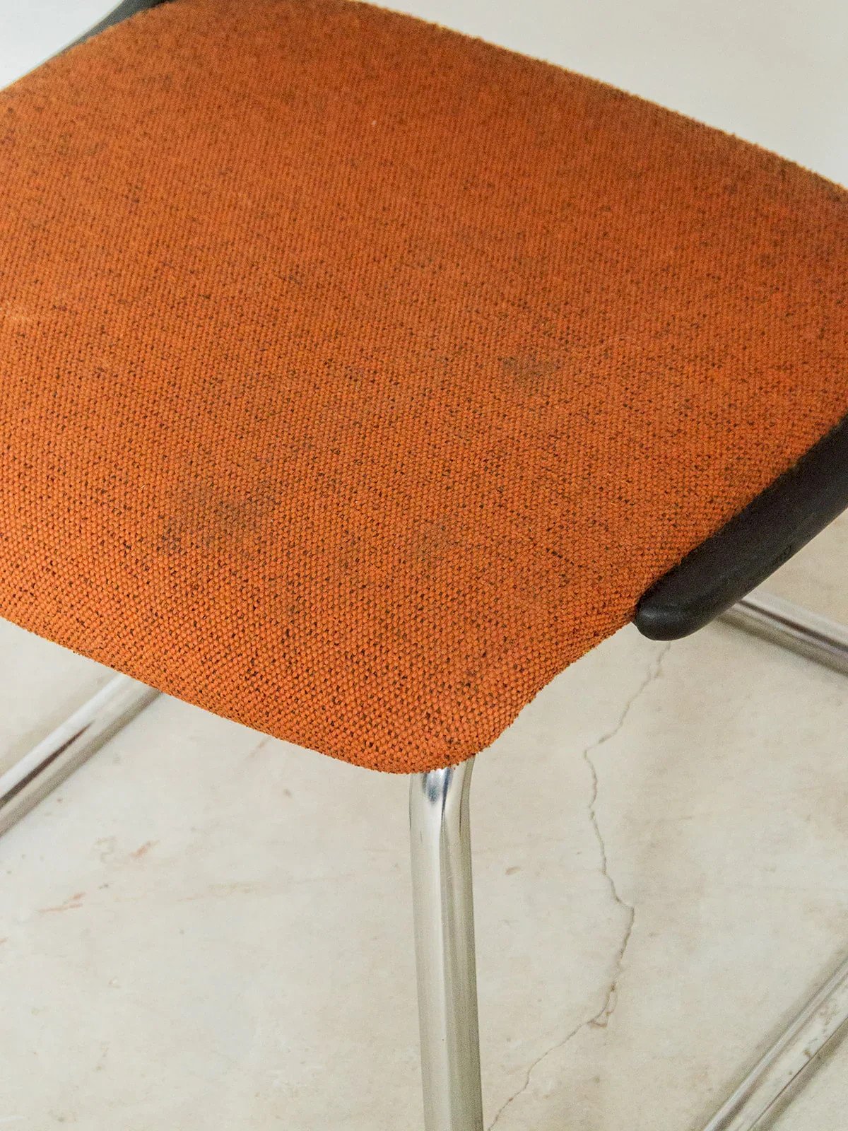 Discover the orange metal and fabric chair from Eurosit, a bold choice to add a touch of color to your interior. Although it has a small stain on the seat, this does not detract from its contemporary style and comfort. Ideal for a dining room or an office, this chair combines sturdiness and aesthetics while remaining affordable. A must-have for those looking to merge design and originality! Length: 44 cm Width: 44 cm Height: 73.5 cm Seat height: 44 cm Condition: Used: Item that has been used. Item showing some signs of superficial wear, fully operational and functioning properly. It may be a demonstration model or an item returned to the store after a short period of use. any possible imperfections. Color: Multicolored Height: Wood, Metal Width: Chairs Brand: Debongout Type: Thrifted product Material: Wood, Metal Style: Contemporary.