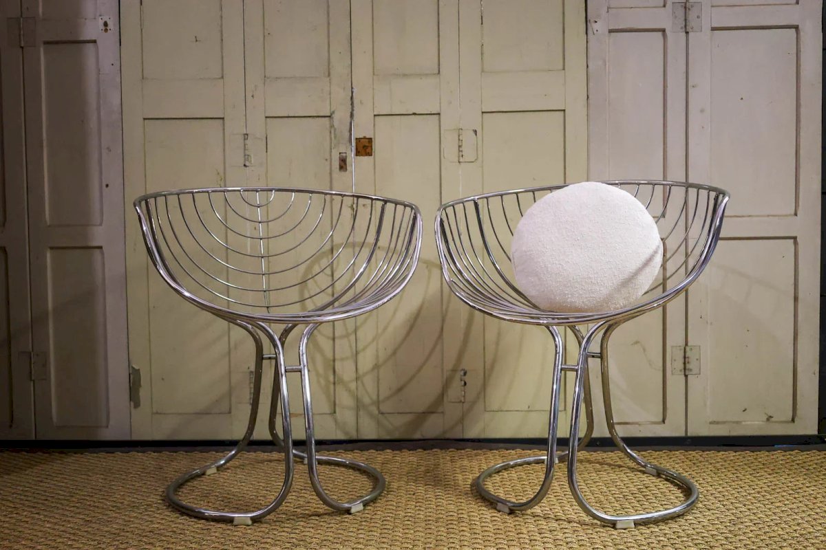 Adopt this pair of Pan Am style chairs designed by Gastone Rinaldi for RIMA, an embodiment of 70s design with a cosmopolitan charm. Their chrome structure creates an airy and graphic silhouette that will invigorate a dining room or a workspace. The seat, designed for immediate comfort, invites conversation and long, enjoyable evenings. These pieces add a retro-chic touch, ideal for creating a refined vintage atmosphere. Width: 61 cm Depth: 55 cm Height: 70 cm Seat height: 45 cm Backrest height: 70 cm Condition: Used: Item that has been used. Item showing some superficial wear marks... Used: Item that has been used. Item showing some superficial wear marks, fully operational and functioning correctly. It may be a demonstration model or an item returned to the store after a short period of use. possible imperfections. Color: Multicolor Height: Chrome, Metal Width: Chairs Brand: Debongout Type: Vintage product Material: Chrome, Metal Style: Contemporary