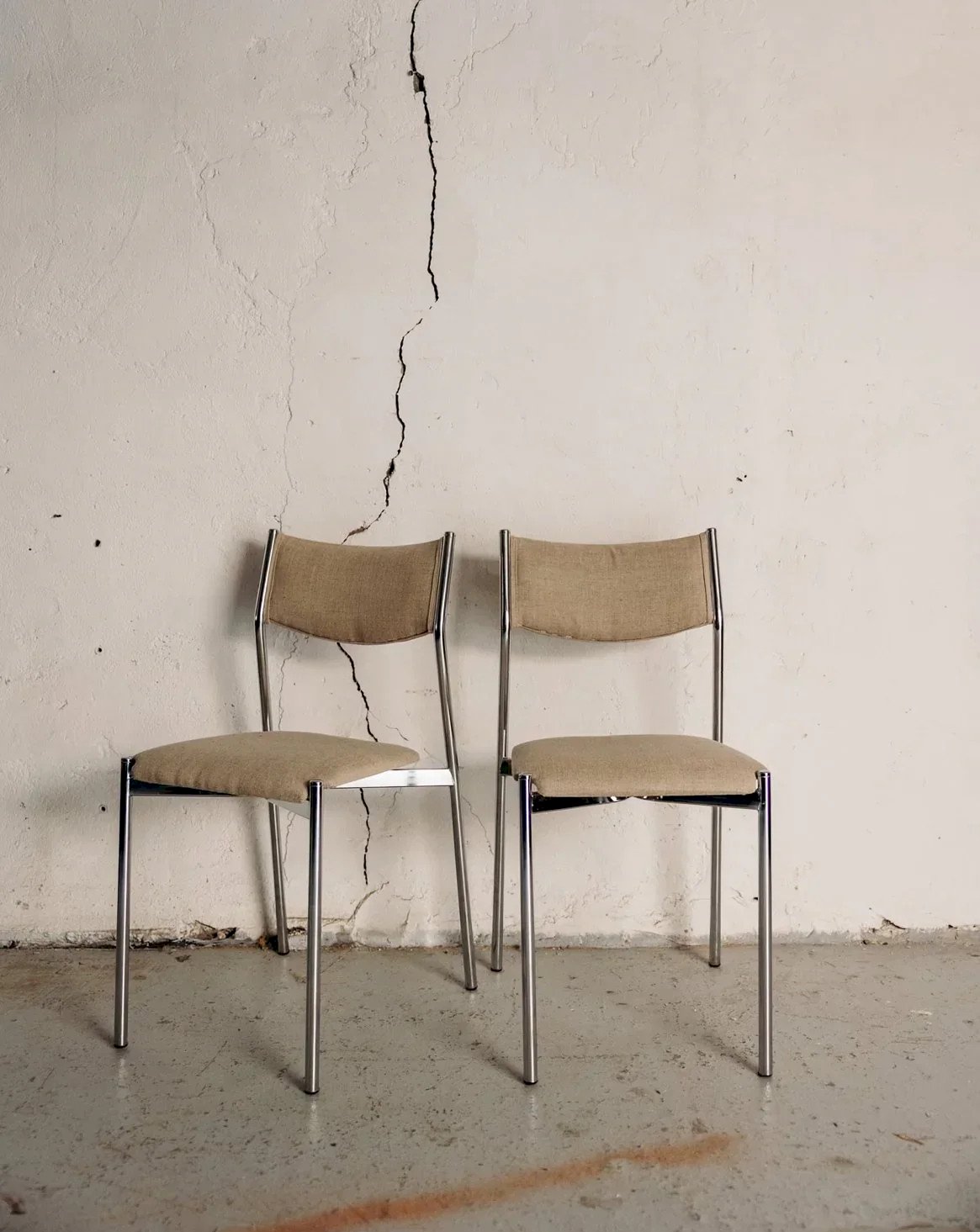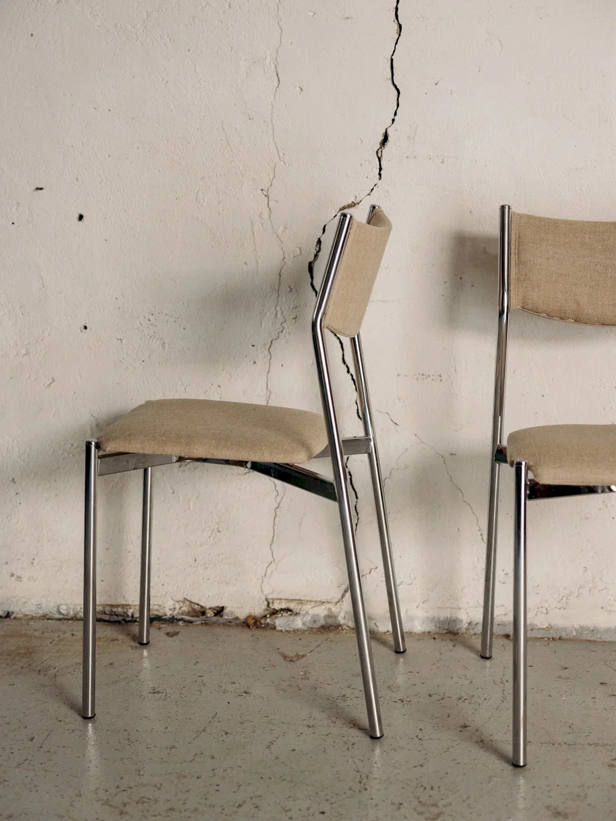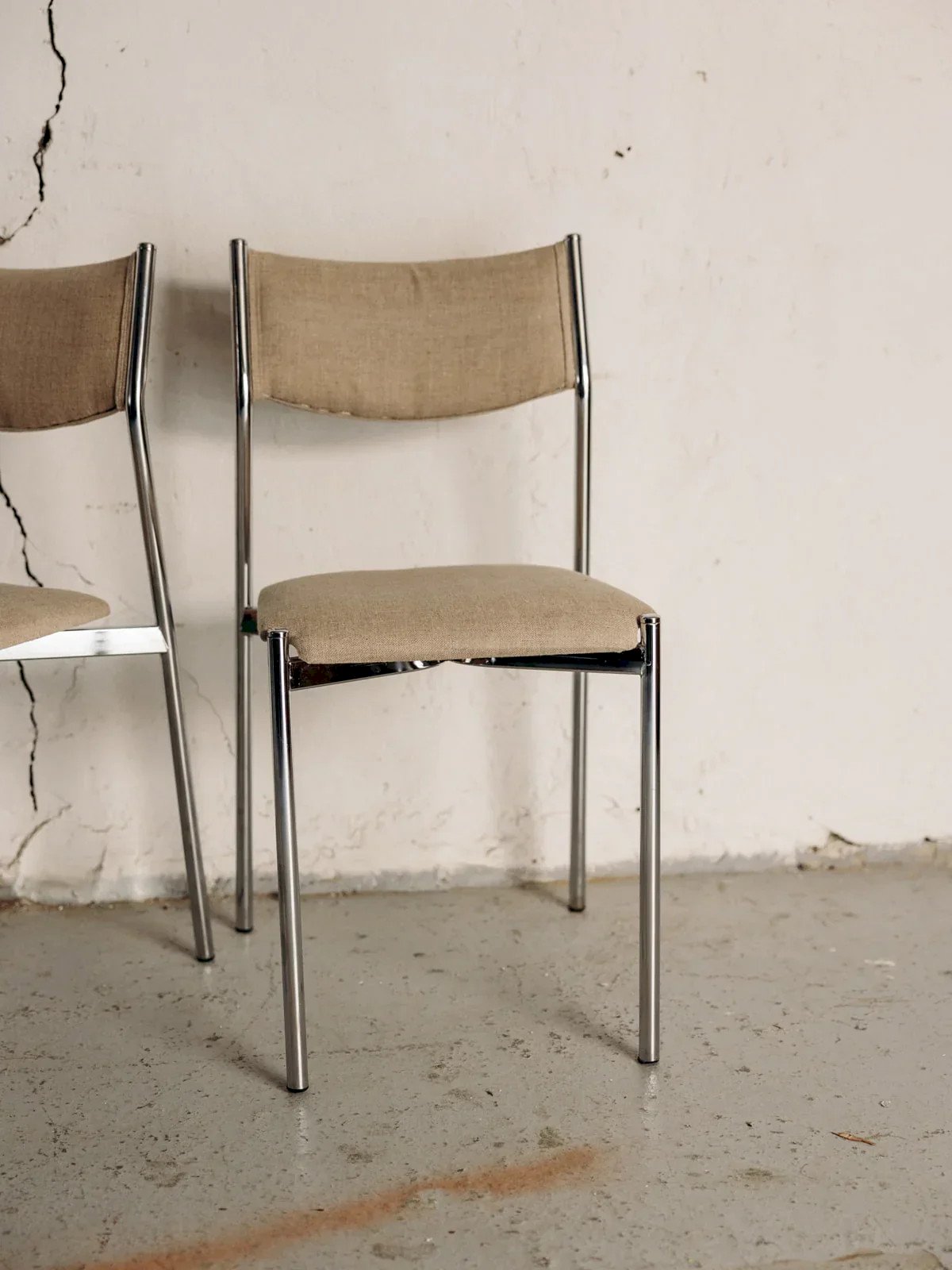 Discover this elegant pair of metal chairs, featuring a tubular chrome structure that will bring a modern touch to your interior. The seats, reupholstered in a beige fabric, combine comfort and style while harmoniously fitting into various decors. In good condition, these chairs are perfect for completing your furniture while providing a pleasant seating experience for your guests. Sold in pairs, three quantities are available! Length: 38 cm Width: 49 cm Height: 80 cm Seat height: 43 cm Condition: Used: Item has been used. Item shows some superficial signs of wear, fully operational and functioning correctly. It may be a demonstration model or an item returned to the store after a short period of use. Any potential imperfections. Color: Multicolor Height: Fabric, Metal, Chrome Width: Chairs Brand: Debongout Type: Vintage product Material: Fabric, Metal, Chrome Style: Contemporary