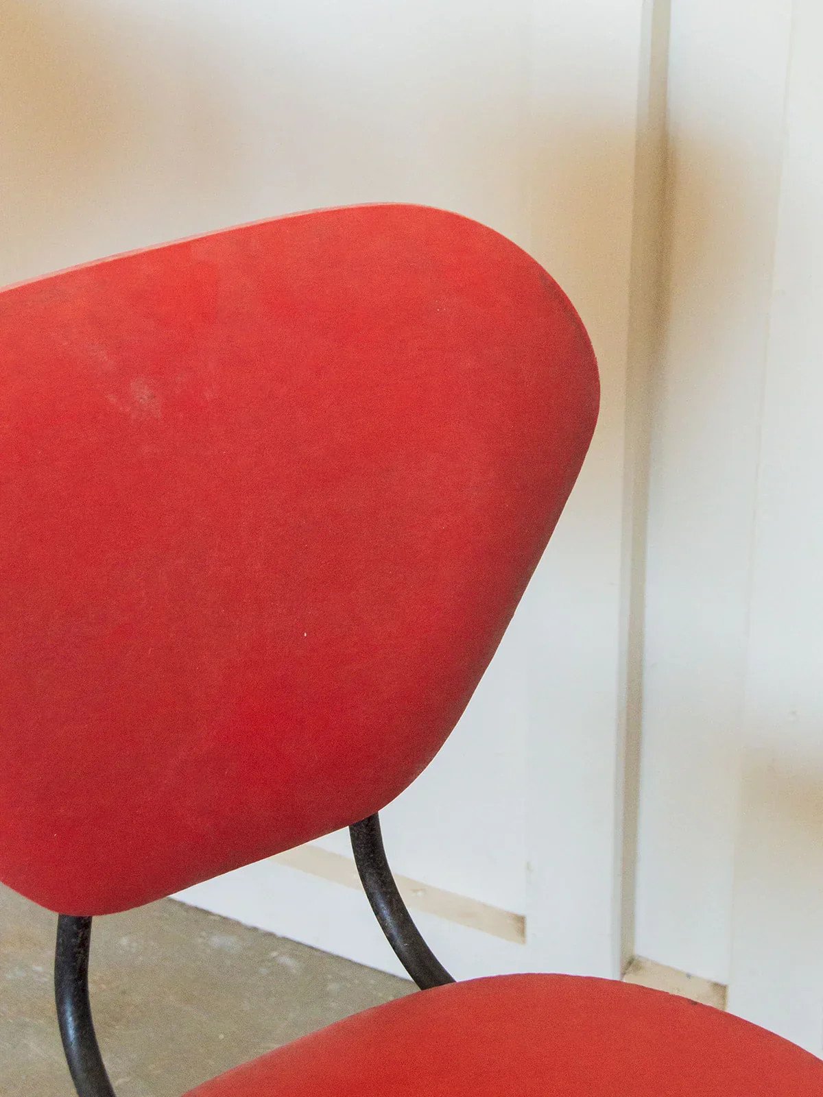 Bring a retro touch to your interior with this pair of vintage red chairs. Their red vinyl seat and back give them a bold and characterful look. The tapered black metal legs add elegance and lightness to their silhouette. There are some scratches on the vinyl and signs of wear, but they remain in good condition! Perfect for a kitchen, an office, or a dining room with a strong style. Sold as a pair, two quantities are available! Length: 41 cm Height: 81 cm Seat height: 46 cm Depth: 47 cm Condition: Used: Item that has been used. Item shows some superficial wear marks, ... Used: Item that has been used. Item shows some superficial wear marks, fully operational and functioning properly. It may be a demonstration model or an item returned to the store after a short period of use. any possible imperfections. Color: Multicolor Height: Vinyl, Metal Width: Chairs Brand: Debongout Type: Vintage product Material: Vinyl, Metal Style: Contemporary
